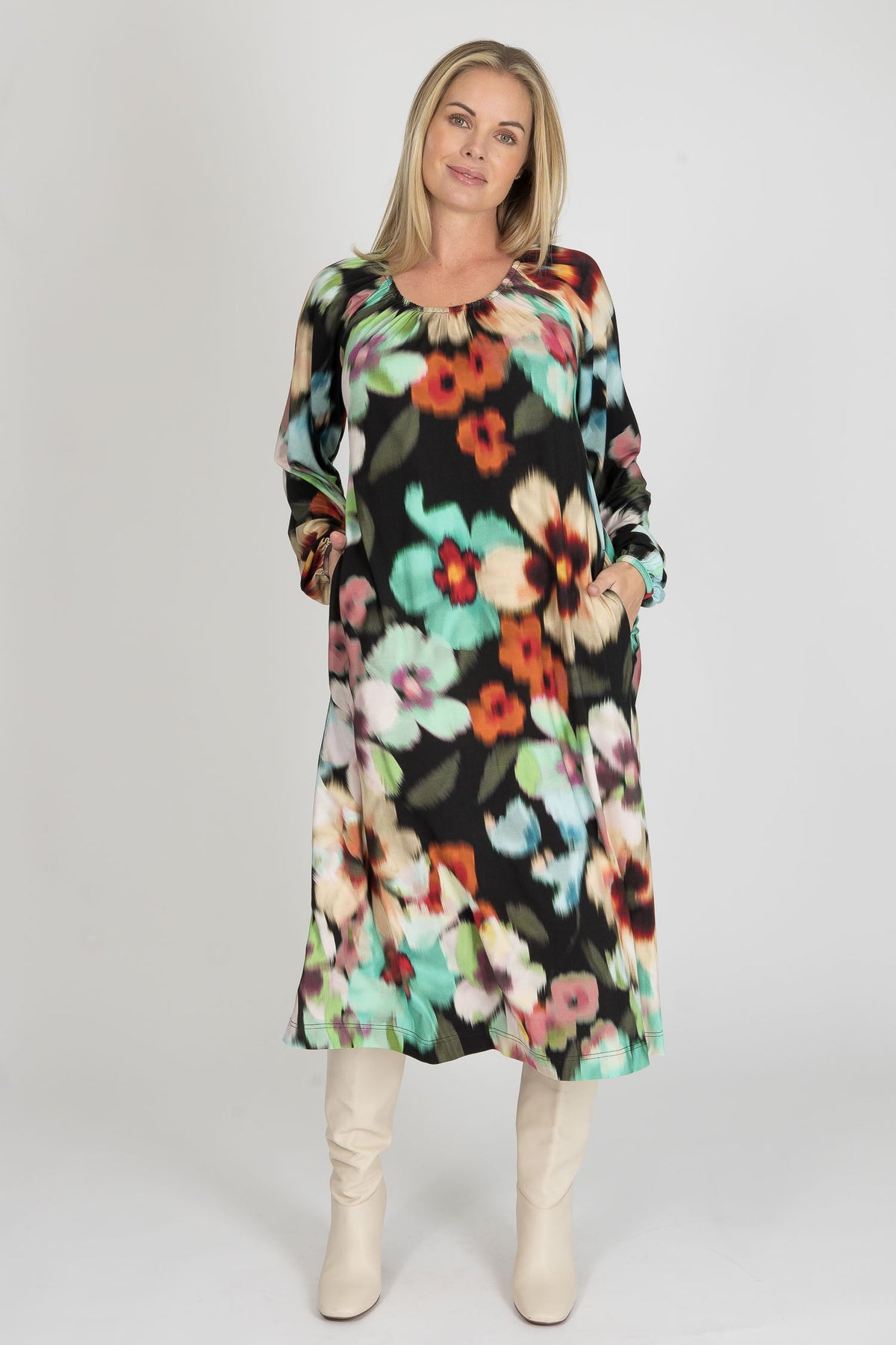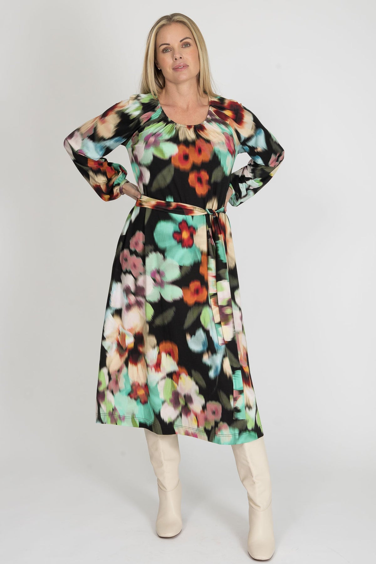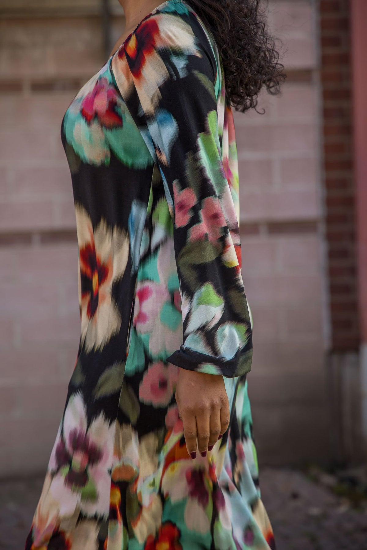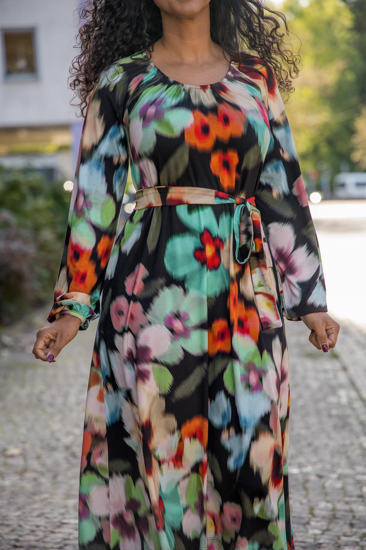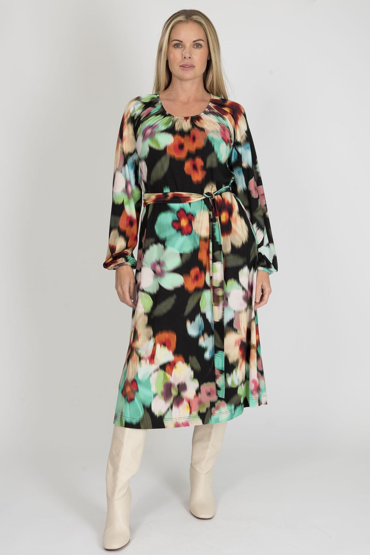 Vår nya A-linjeformade klänning, A-lined belted, är tillverkad i mjuk, stretchig trikå med ett tungt fall. Tyget har ett Blurred florals-mönster i pigga färger på en svart botten. Klänningen har en avslappnad passform och praktiska fickor i sidorna. Den rundhalsade designen med rynk och de vida, långa raglanärmarna ger en bekväm och stilfull look. Vill du markera midjan? Ett löst knytband medföljer, så du enkelt kan anpassa looken efter dina önskemål.