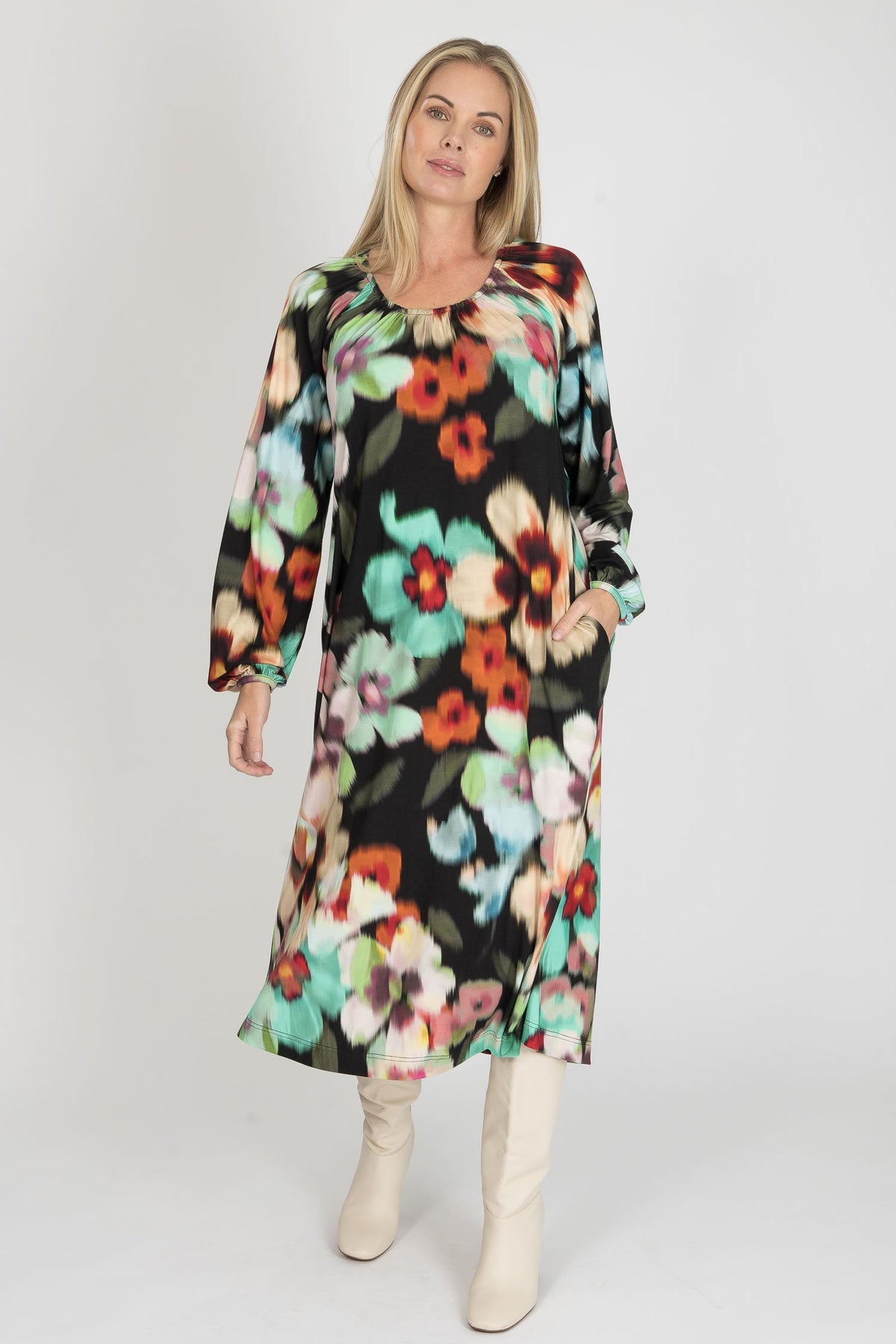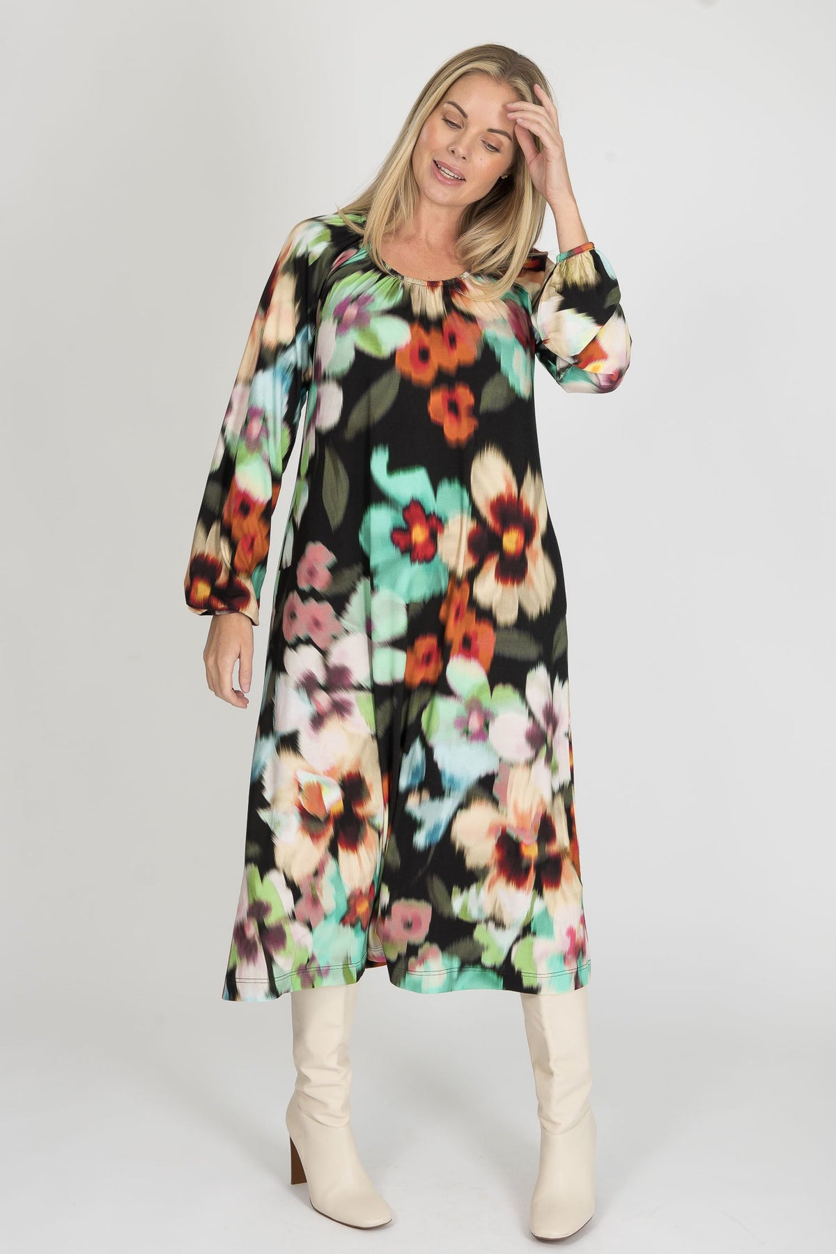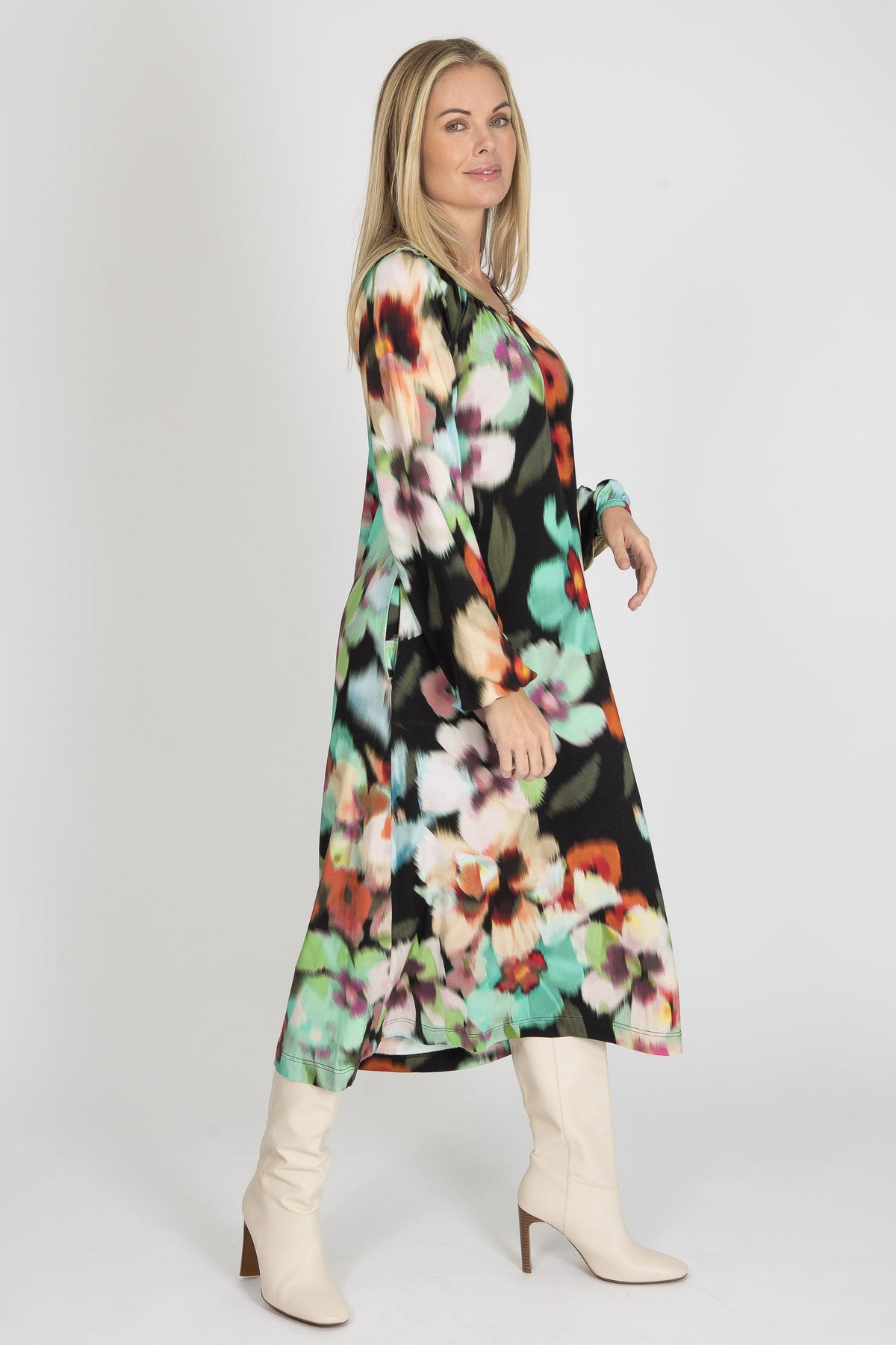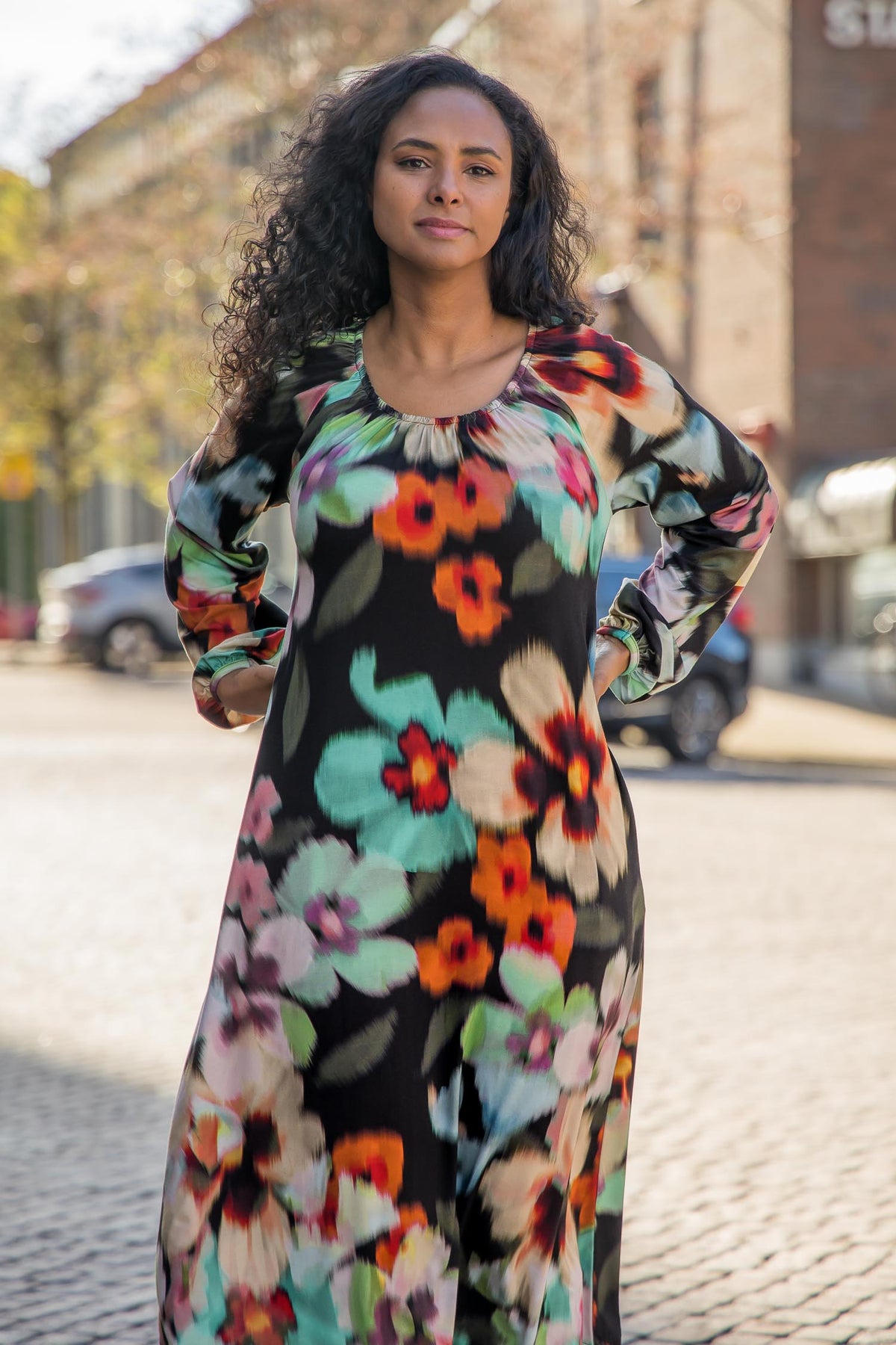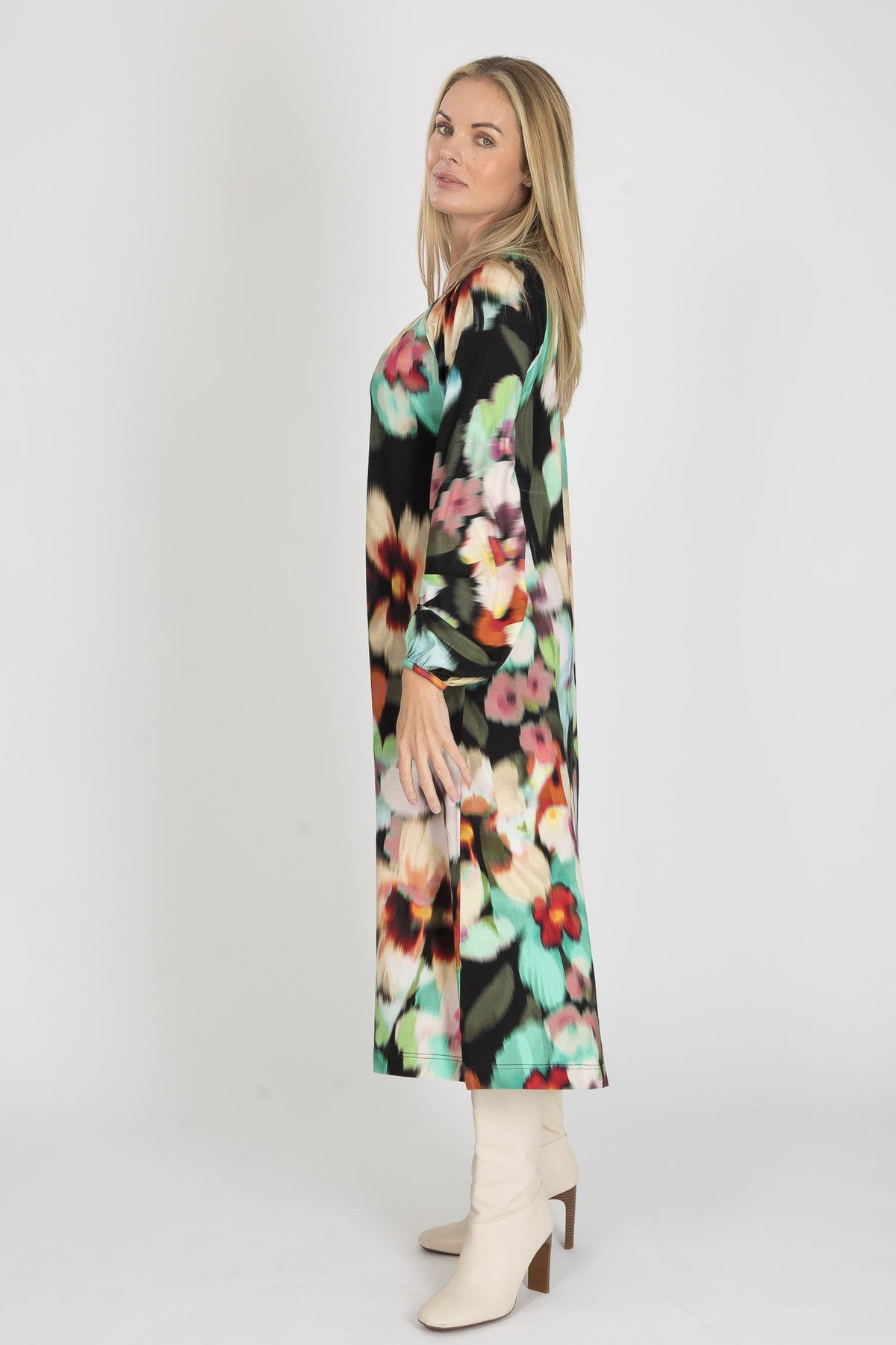 Vår nya A-linjeformade klänning, A-lined belted, är tillverkad i mjuk, stretchig trikå med ett tungt fall. Tyget har ett Blurred florals-mönster i pigga färger på en svart botten. Klänningen har en avslappnad passform och praktiska fickor i sidorna. Den rundhalsade designen med rynk och de vida, långa raglanärmarna ger en bekväm och stilfull look. Vill du markera midjan? Ett löst knytband medföljer, så du enkelt kan anpassa looken efter dina önskemål.