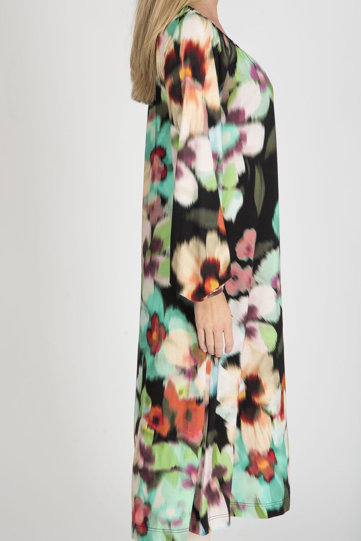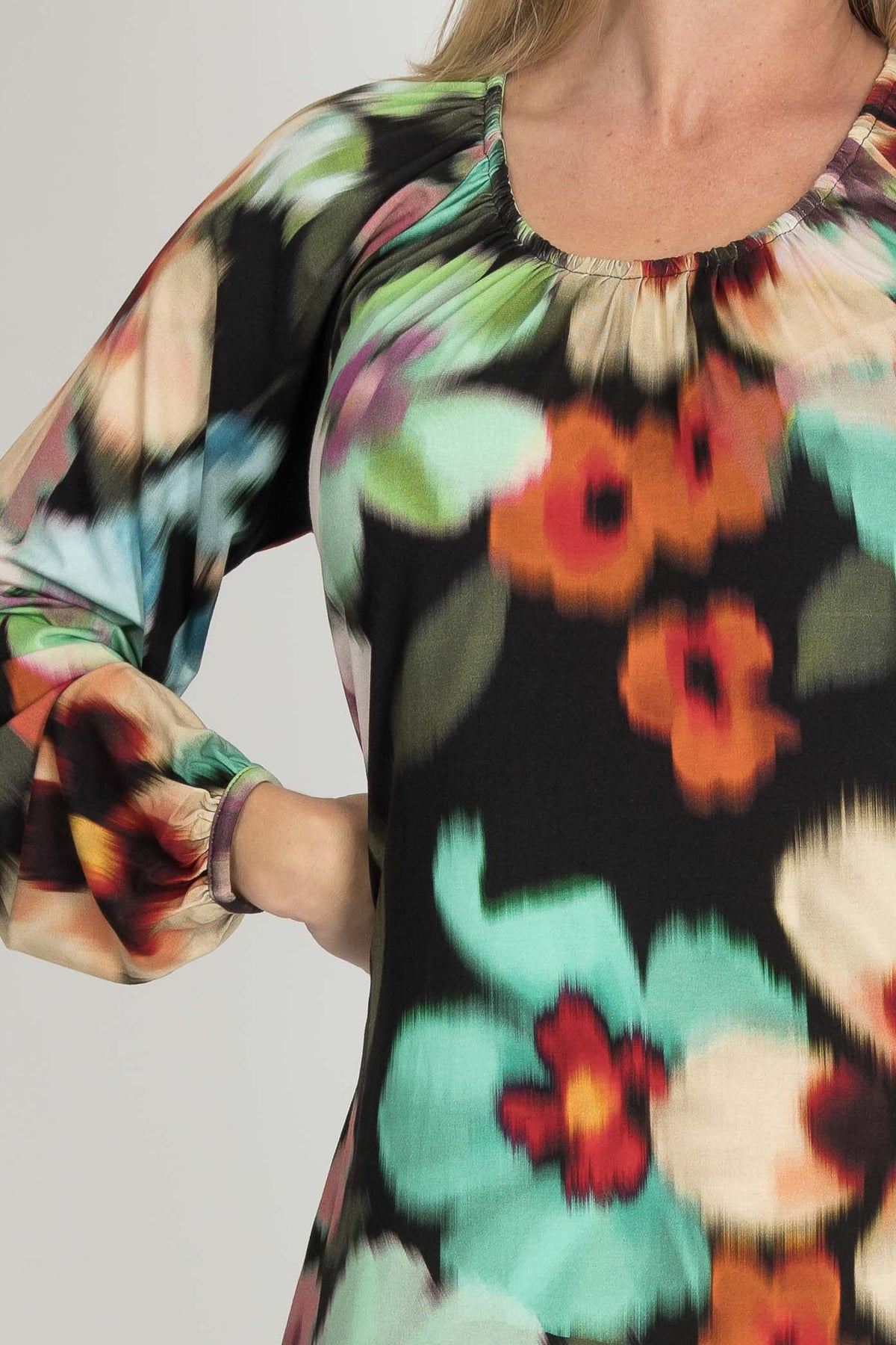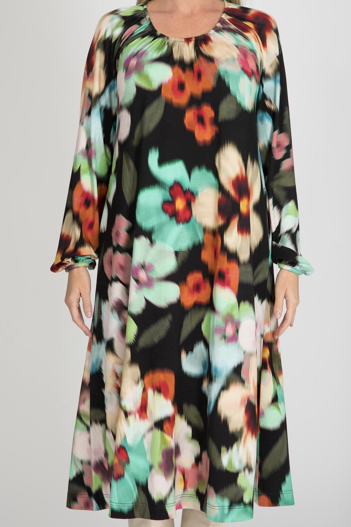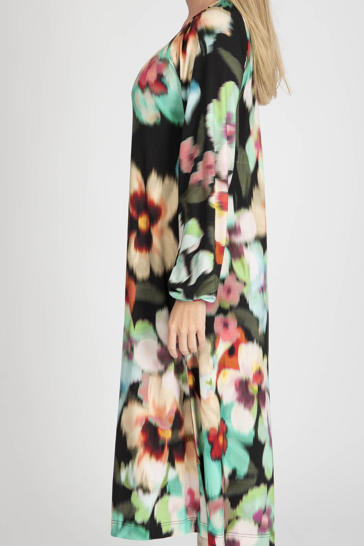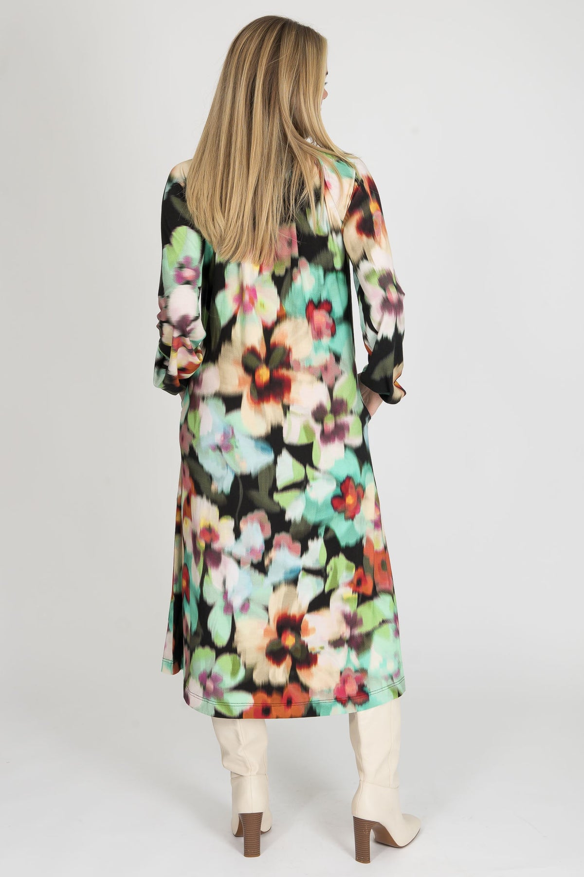 Vår nya A-linjeformade klänning, A-lined belted, är tillverkad i mjuk, stretchig trikå med ett tungt fall. Tyget har ett Blurred florals-mönster i pigga färger på en svart botten. Klänningen har en avslappnad passform och praktiska fickor i sidorna. Den rundhalsade designen med rynk och de vida, långa raglanärmarna ger en bekväm och stilfull look. Vill du markera midjan? Ett löst knytband medföljer, så du enkelt kan anpassa looken efter dina önskemål.