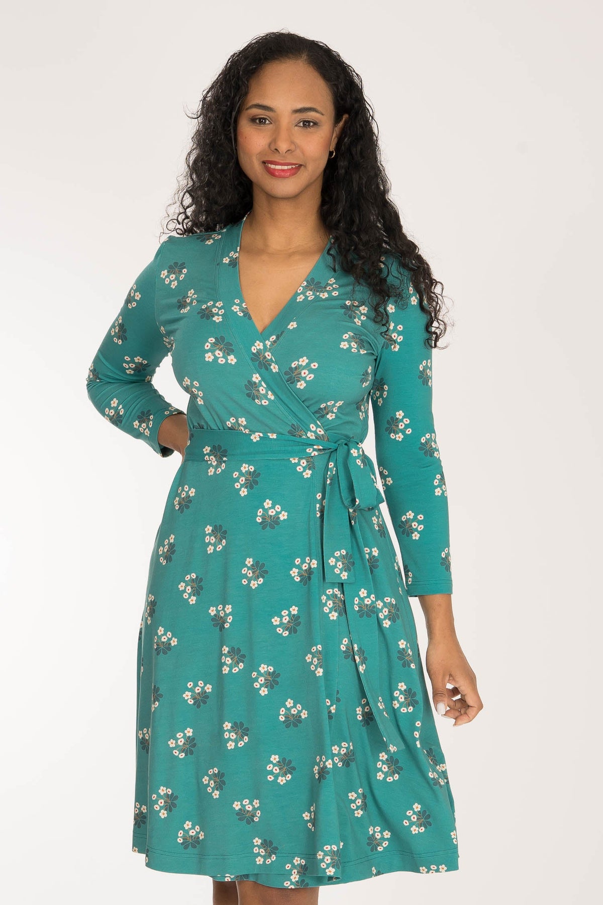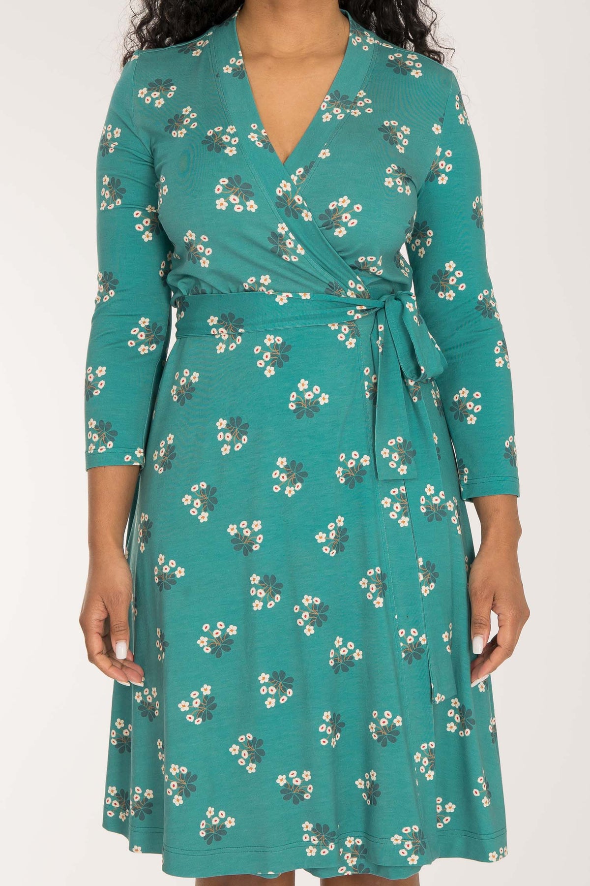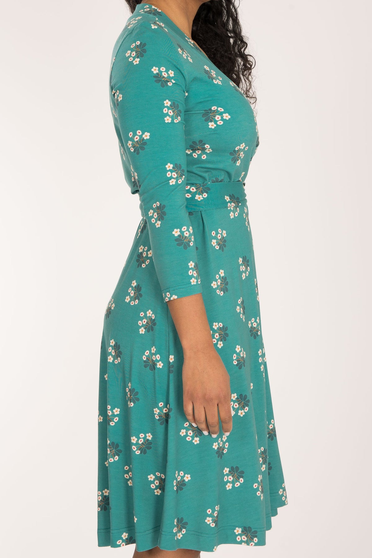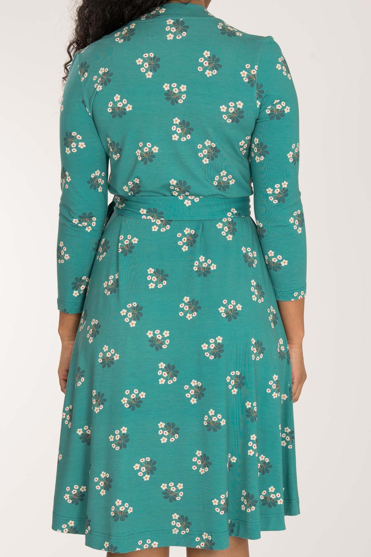Tyget på denna omlottklänning har en turkos botten med ett vackert blommönster i mörkt rött och grönt. Den har generöst med tyg och omlottar mycket runt kroppen och sluter fint vid nacken. Kjolen är rundskuren med härlig vidd och ett vackert fall.