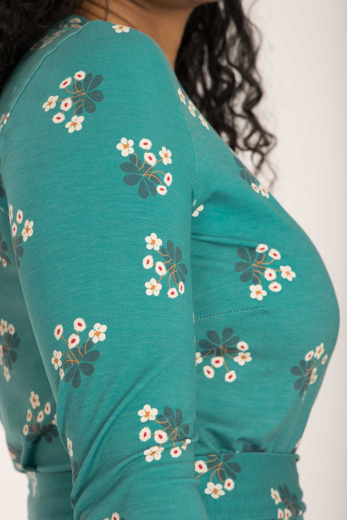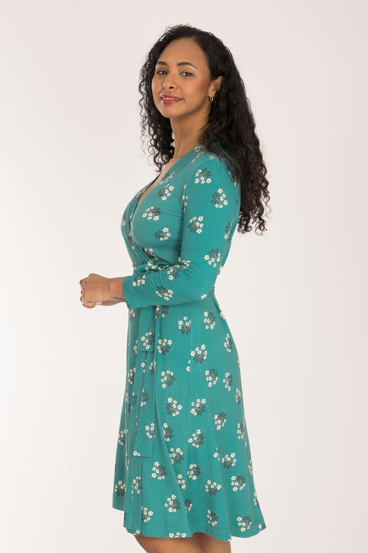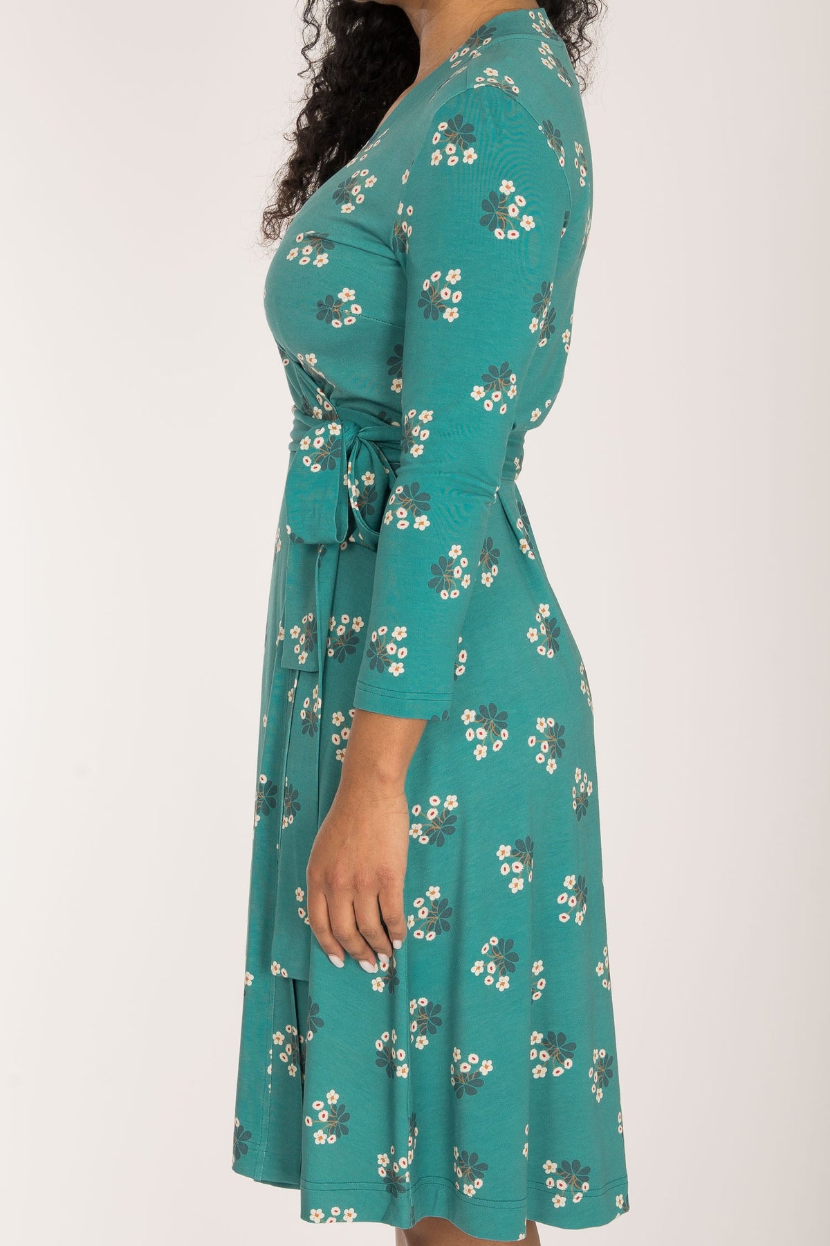 Tyget på denna omlottklänning har en turkos botten med ett vackert blommönster i mörkt rött och grönt. Den har generöst med tyg och omlottar mycket runt kroppen och sluter fint vid nacken. Kjolen är rundskuren med härlig vidd och ett vackert fall.