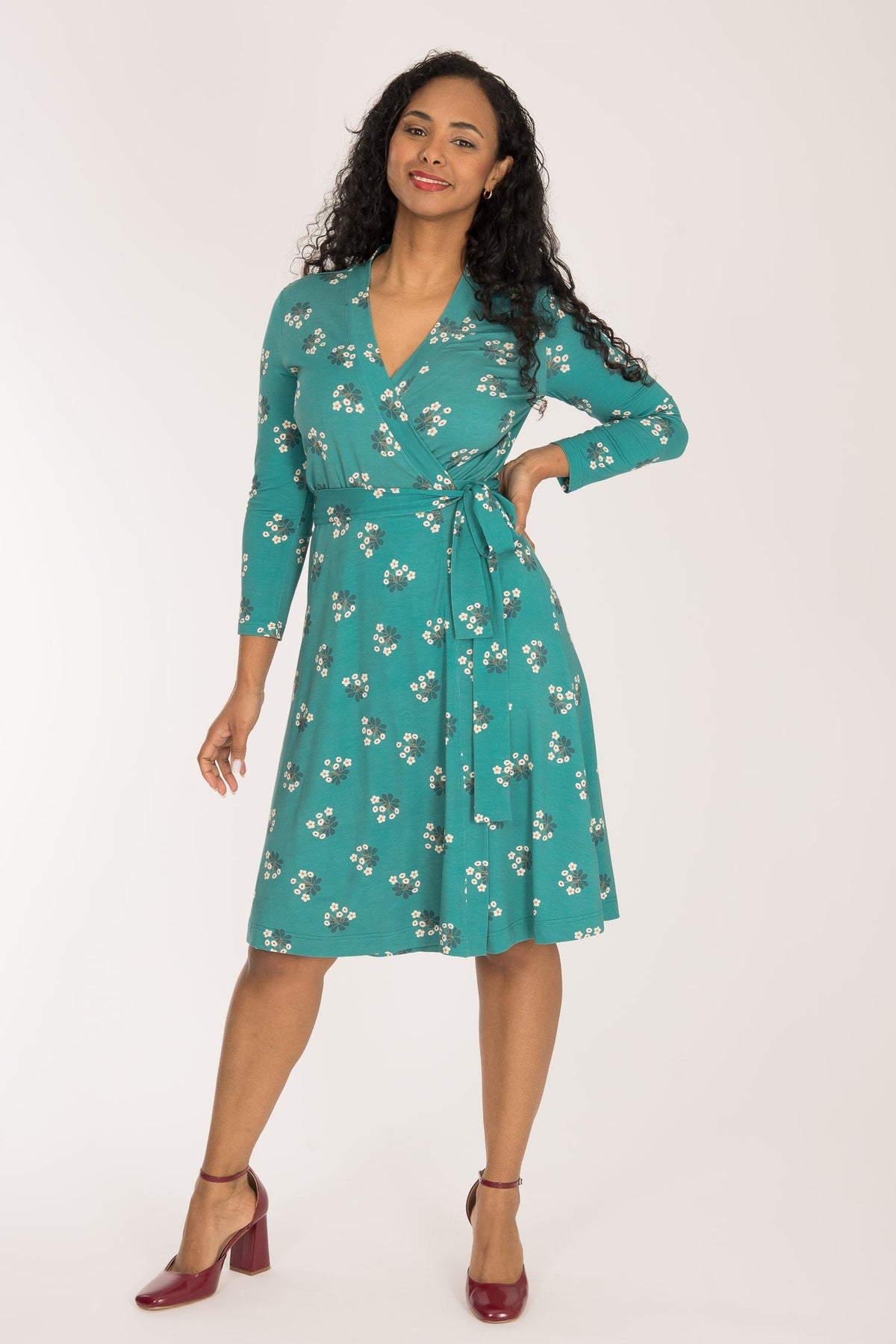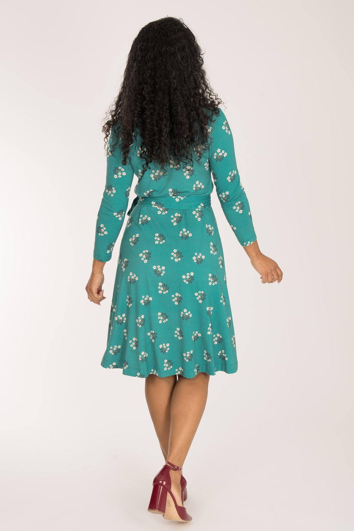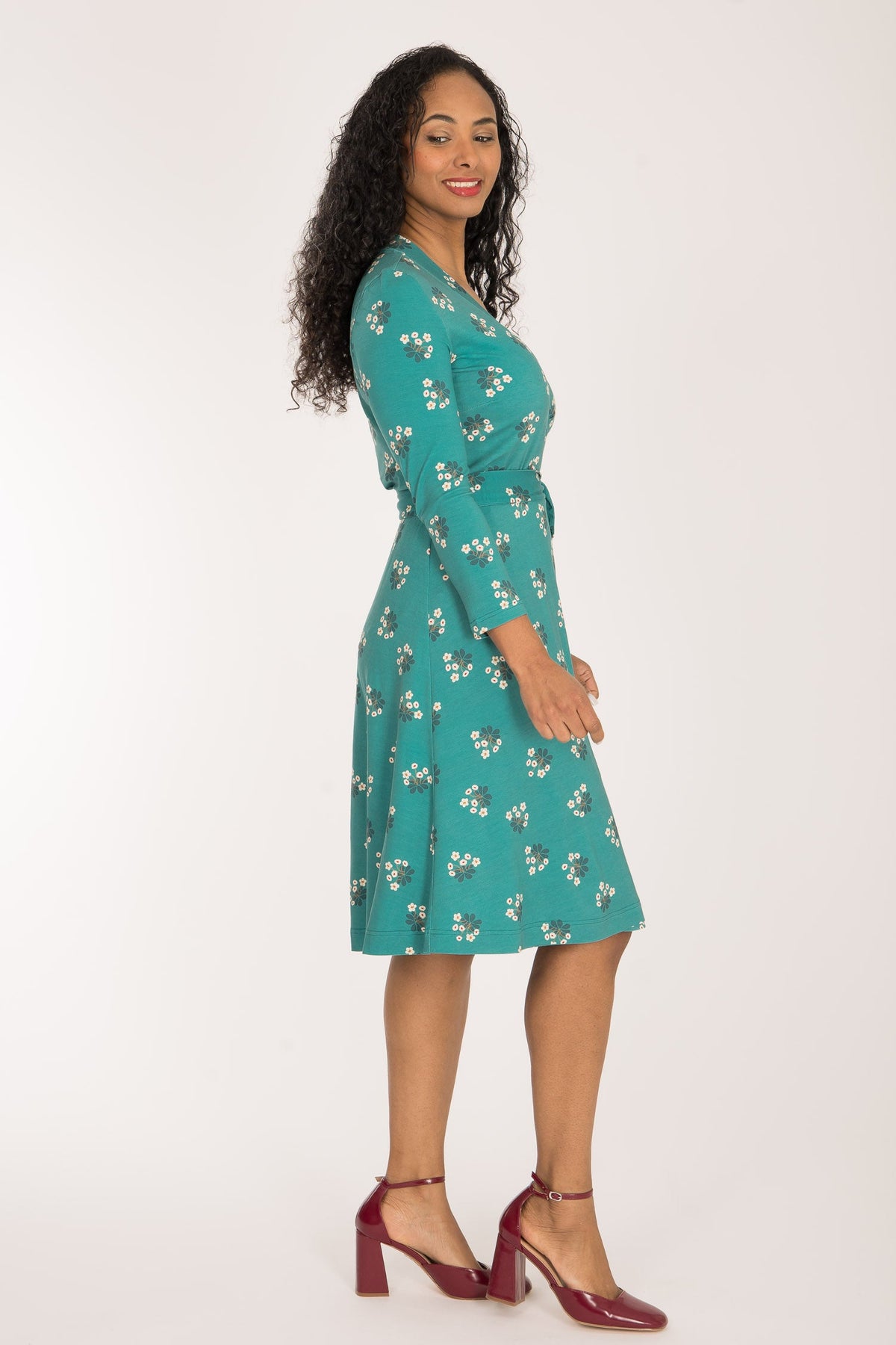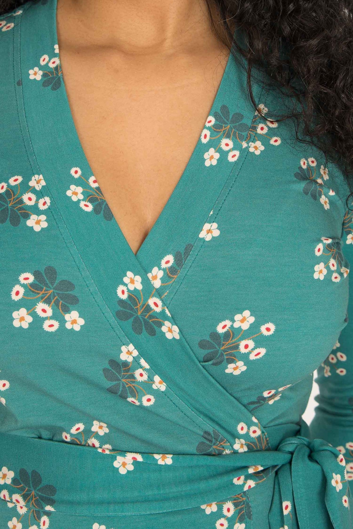 Tyget på denna omlottklänning har en turkos botten med ett vackert blommönster i mörkt rött och grönt. Den har generöst med tyg och omlottar mycket runt kroppen och sluter fint vid nacken. Kjolen är rundskuren med härlig vidd och ett vackert fall.