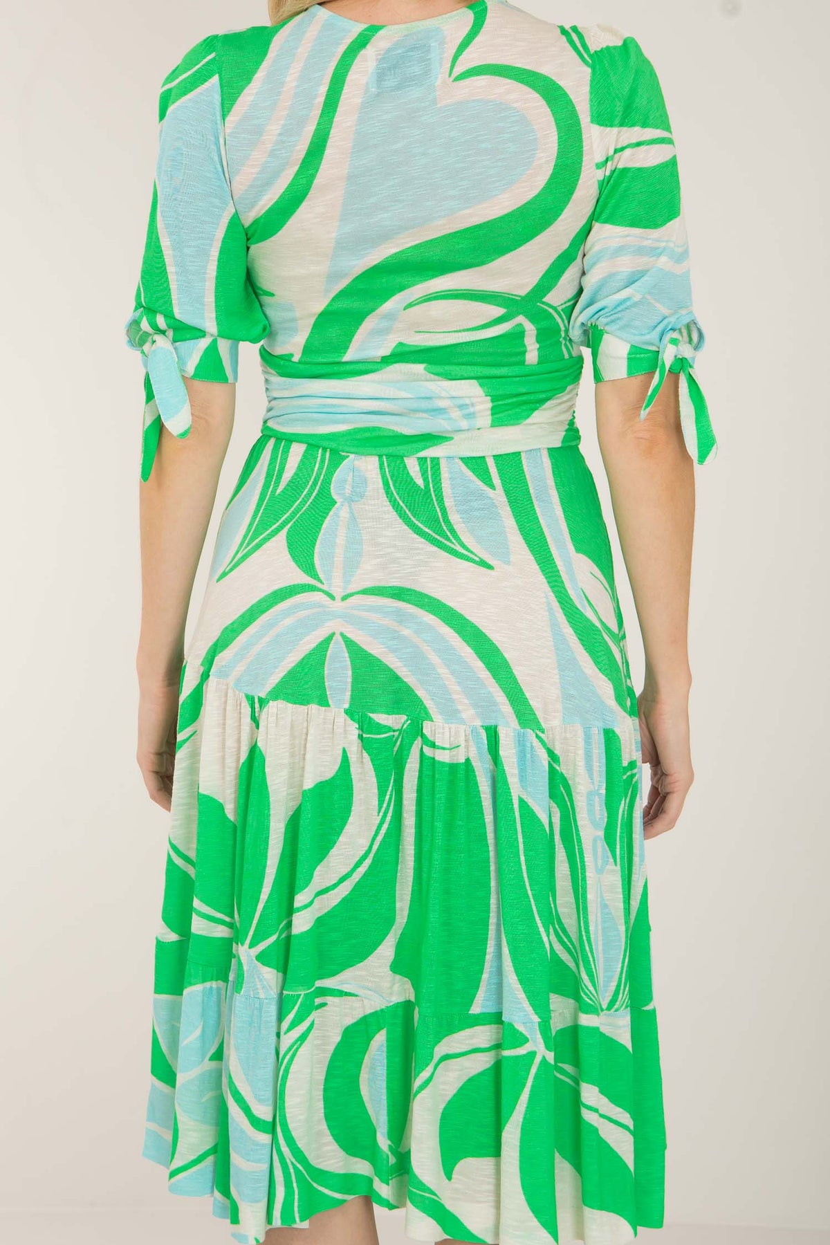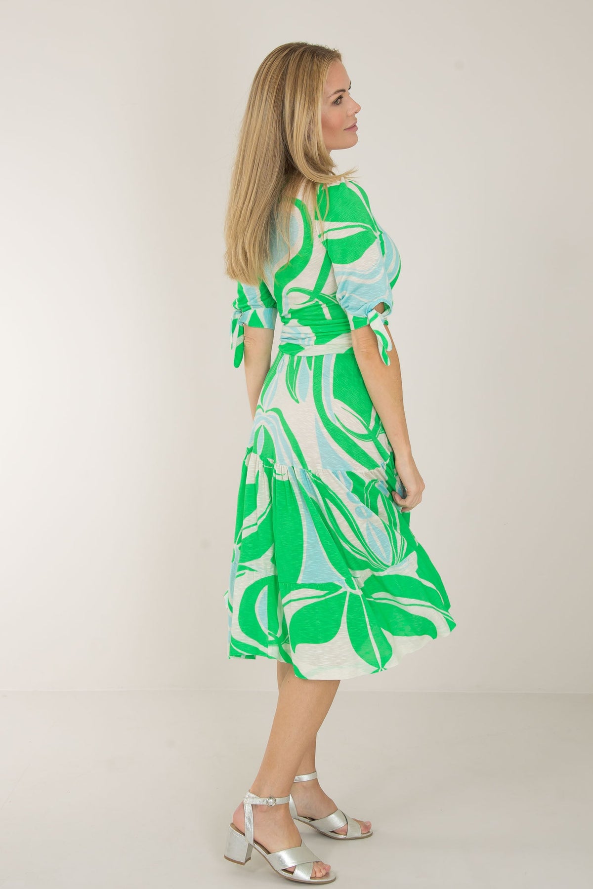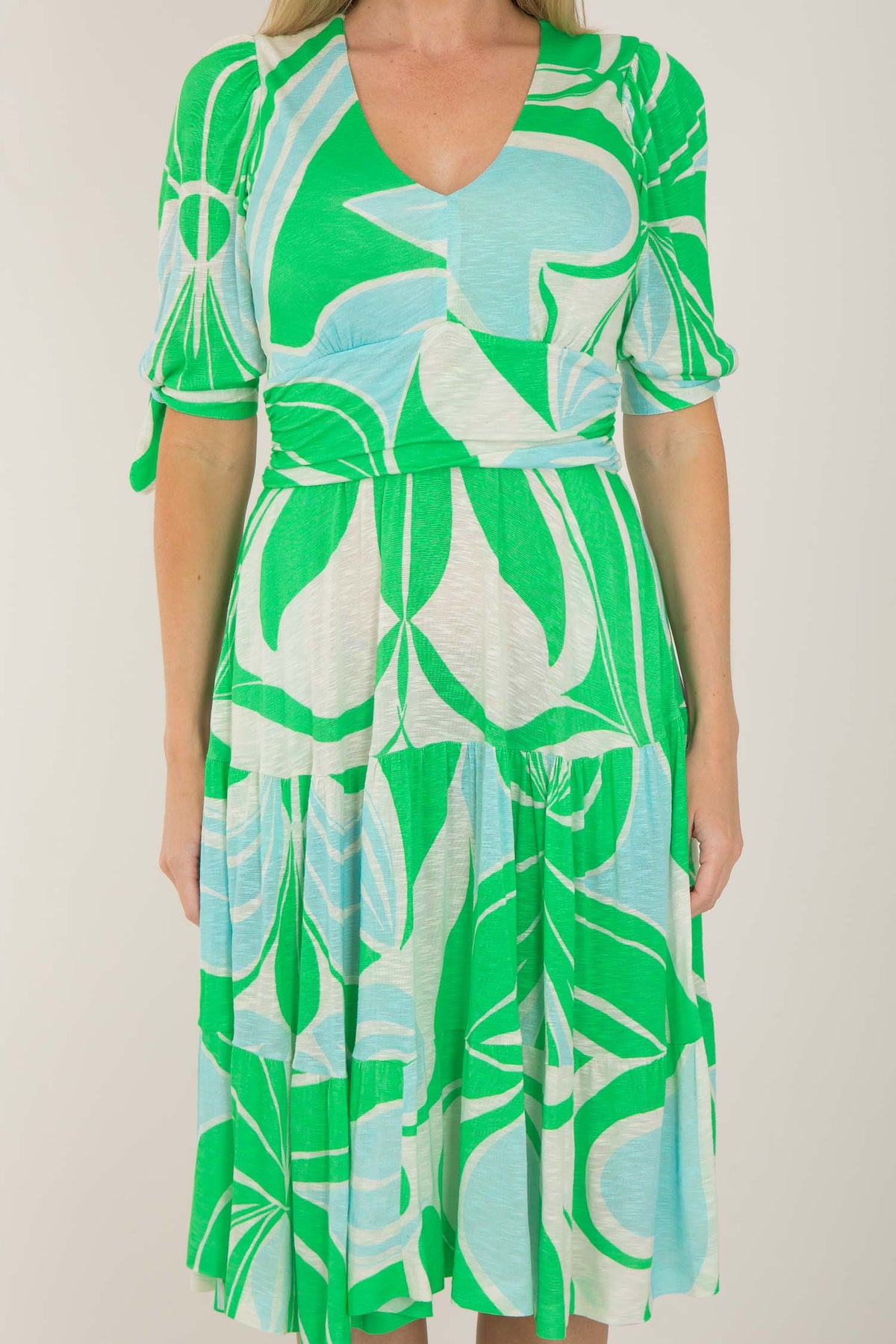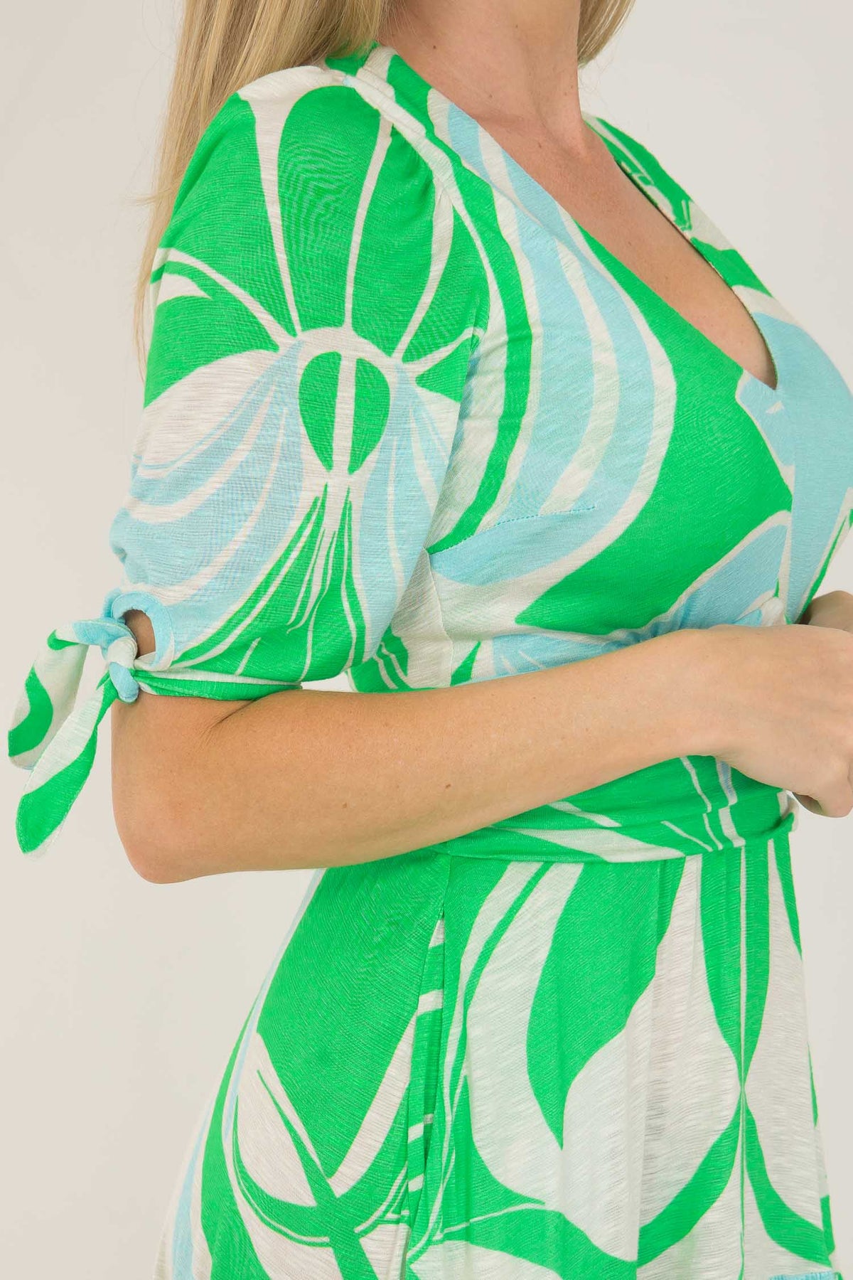 Flowy short jersey dress är en sommardröm med ett stort och maffigt mönster som verkligen sticker ut och ger klänningen det där lilla extra. Denna klänning är designad för dig som vill utstråla resort-chic elegans samtidigt som du vill känna dig bekväm i en mjuk trikå. Med en figursydd överdel, puffiga ärmar och draperat midjeband skapas en perfekt balans mellan enkelhet och sofistikation. För extra bekvämlighet har klänningen sköna fickor i sidan.