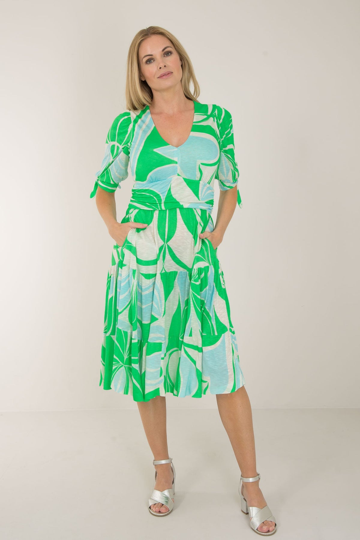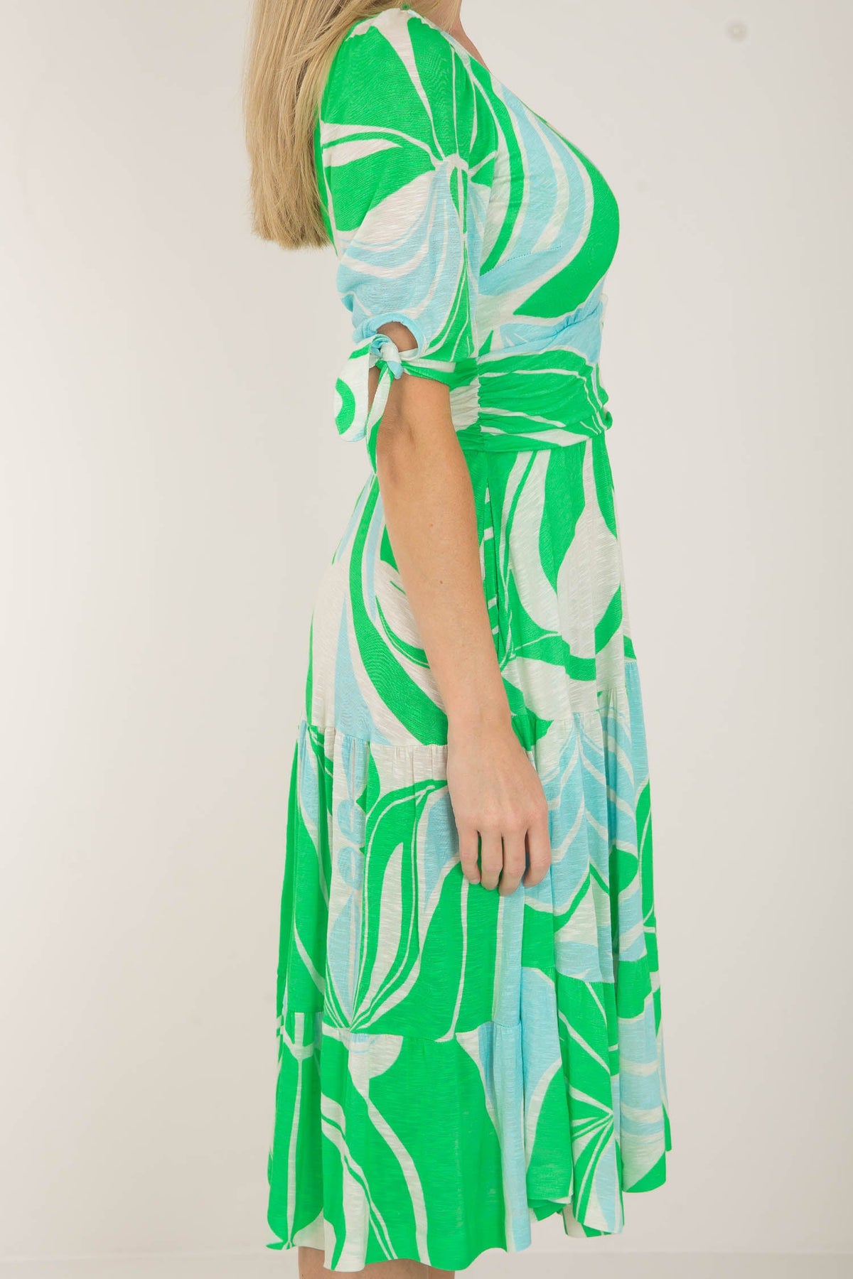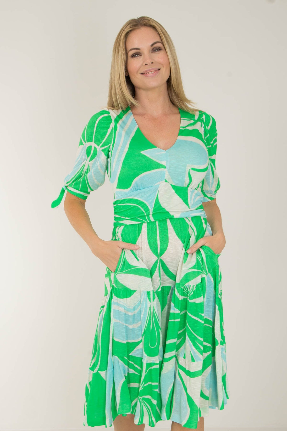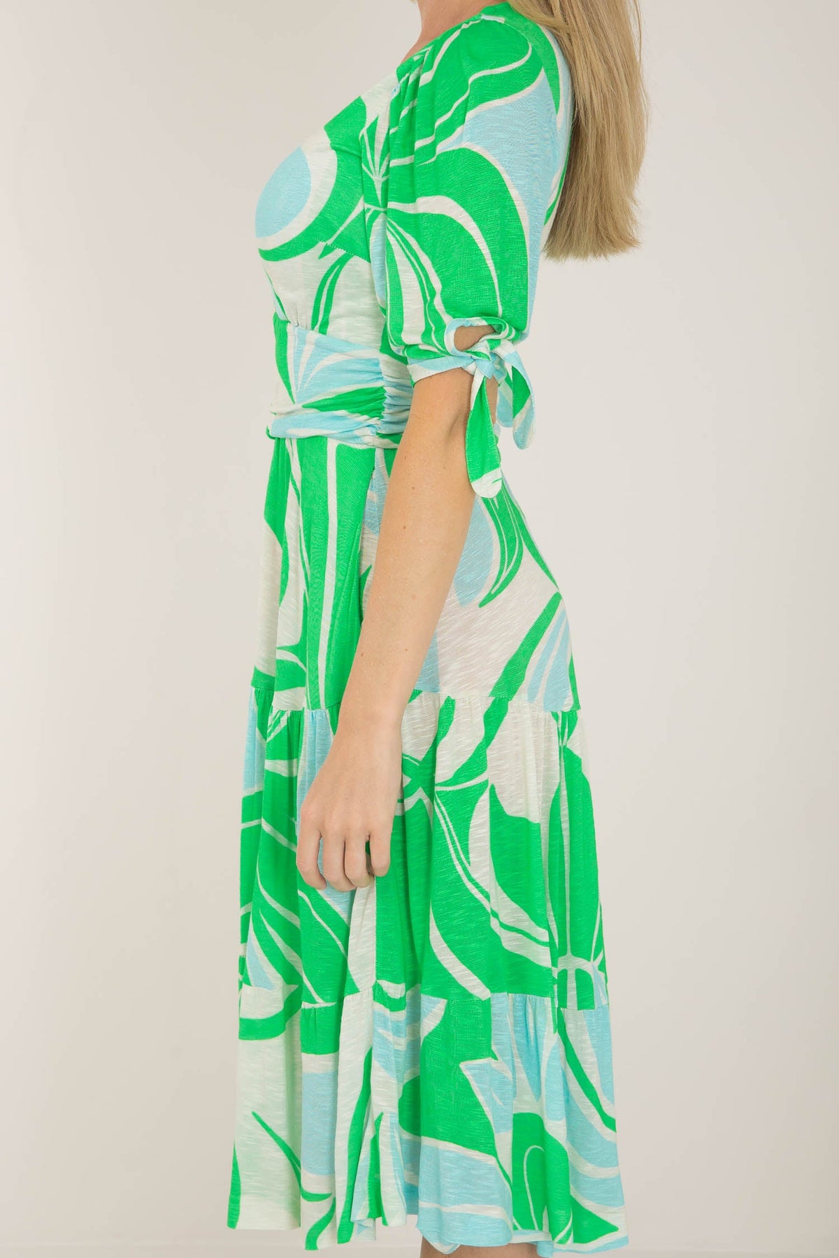 Flowy short jersey dress är en sommardröm med ett stort och maffigt mönster som verkligen sticker ut och ger klänningen det där lilla extra. Denna klänning är designad för dig som vill utstråla resort-chic elegans samtidigt som du vill känna dig bekväm i en mjuk trikå. Med en figursydd överdel, puffiga ärmar och draperat midjeband skapas en perfekt balans mellan enkelhet och sofistikation. För extra bekvämlighet har klänningen sköna fickor i sidan.