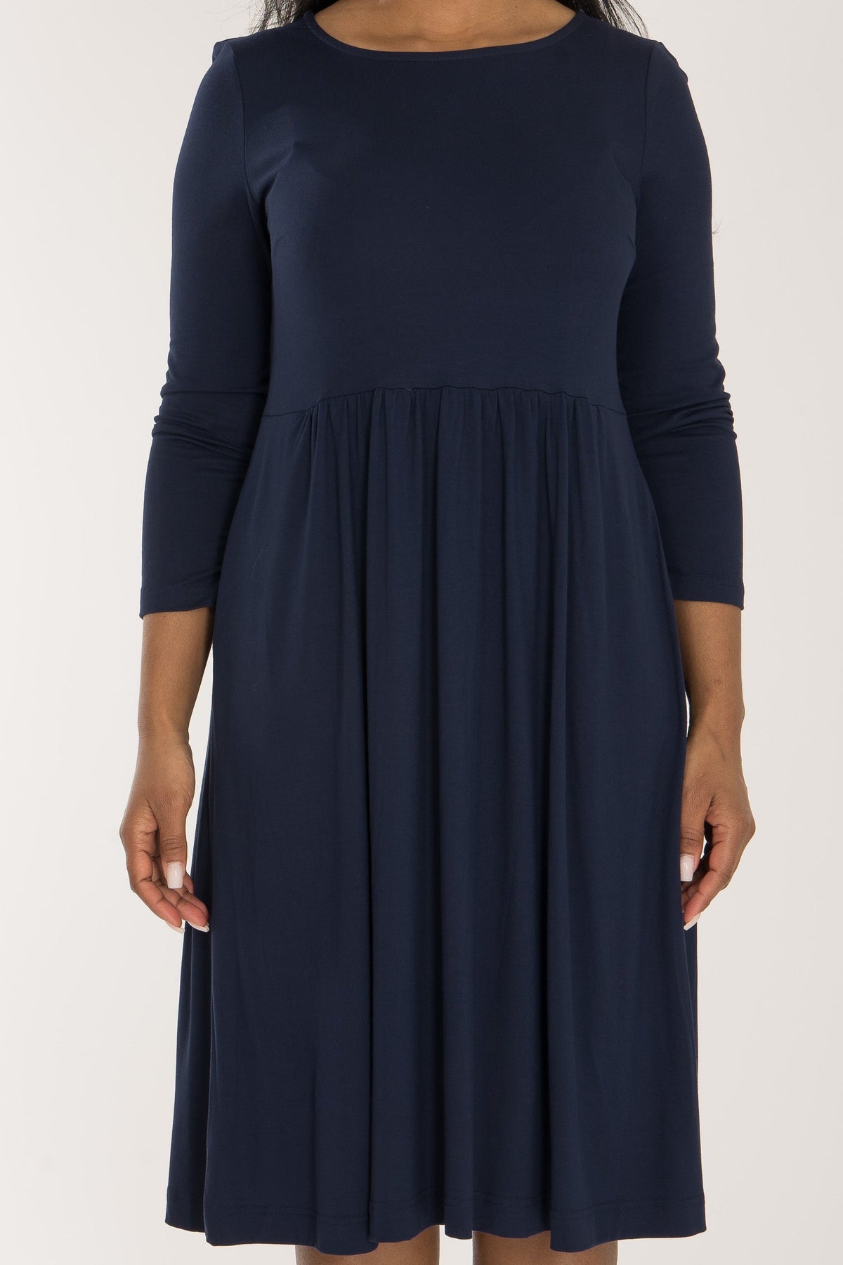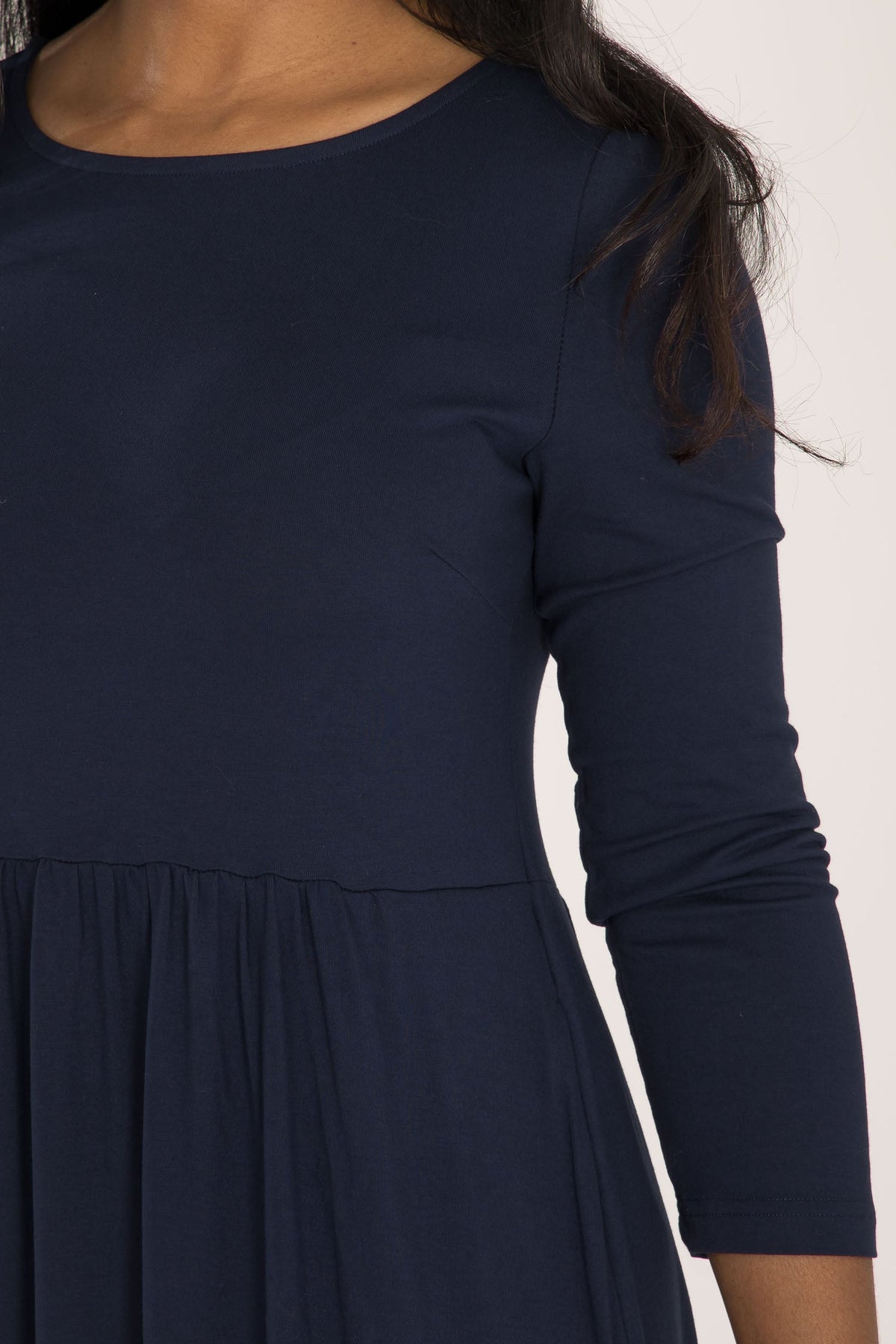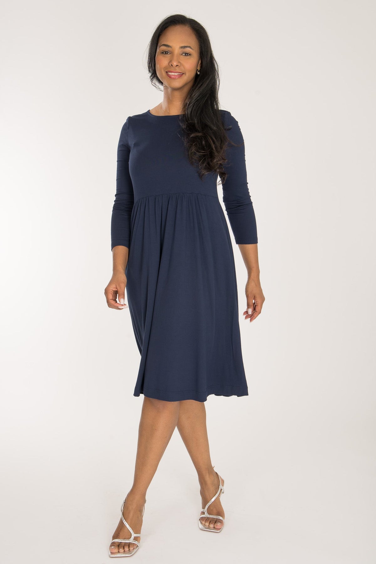 Vår omtyckta Ideal dress finns äntligen även i enfärgat, med samma sköna passform. Klänningen är sydd i mjuk viskostrikå med tungt, fint fall. Den är figurnära upptill, med en vidare midja och avskärning ganska högt upp, och en vippig kjol som faller fint runt kroppen. Perfekt när du vill känna dig bekväm men ändå klädd.