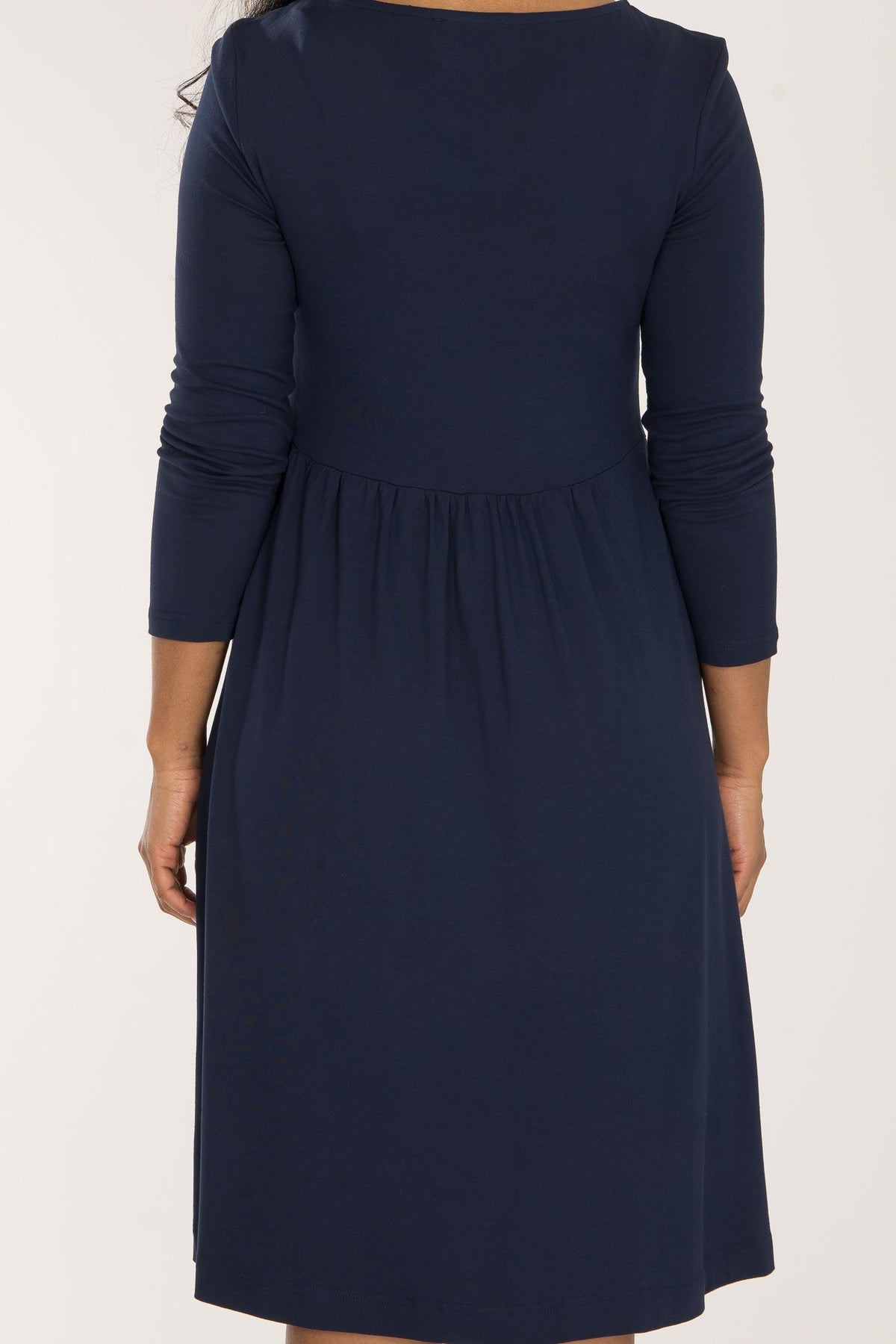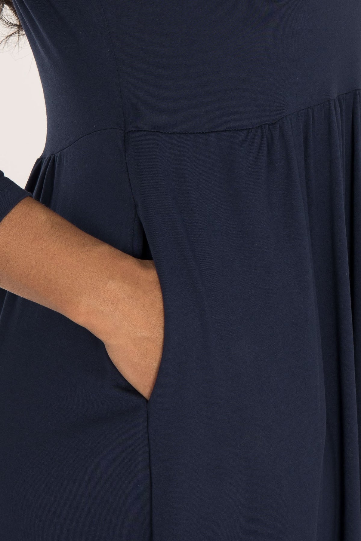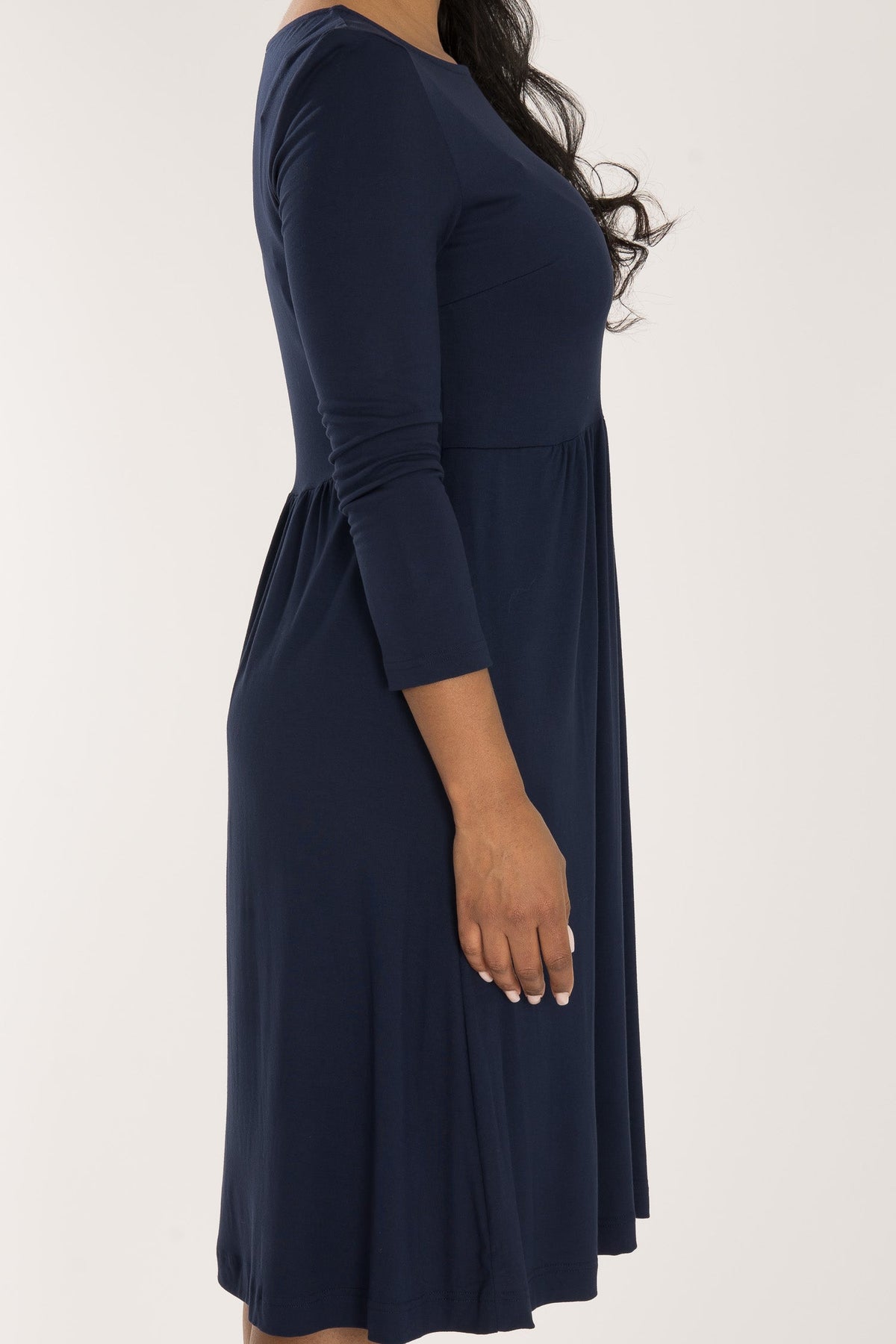 Vår omtyckta Ideal dress finns äntligen även i enfärgat, med samma sköna passform. Klänningen är sydd i mjuk viskostrikå med tungt, fint fall. Den är figurnära upptill, med en vidare midja och avskärning ganska högt upp, och en vippig kjol som faller fint runt kroppen. Perfekt när du vill känna dig bekväm men ändå klädd.
