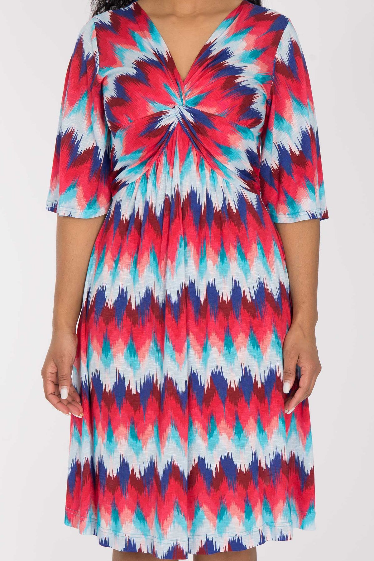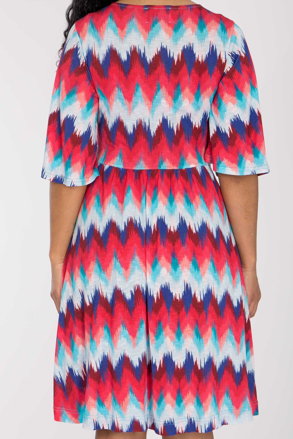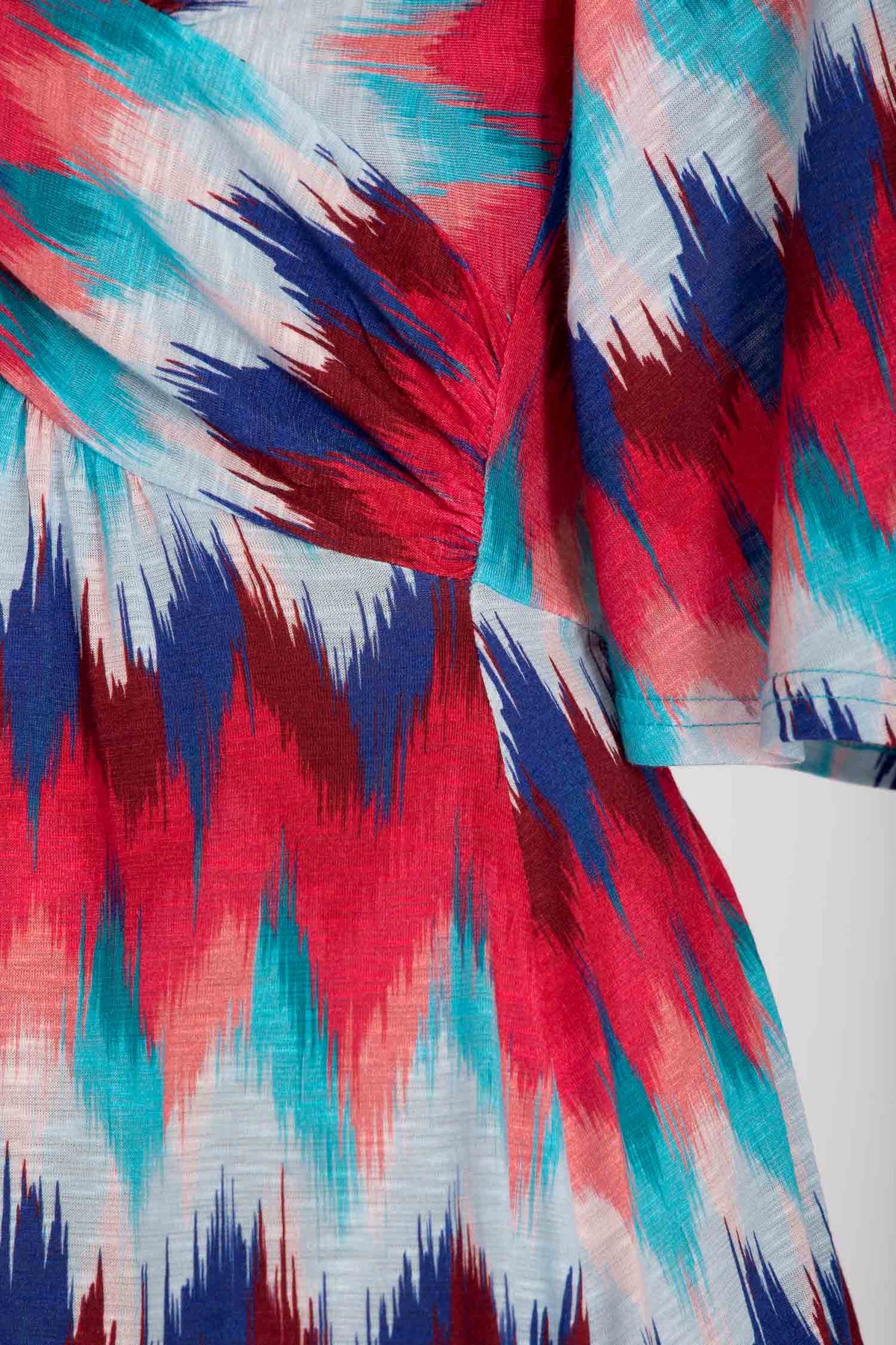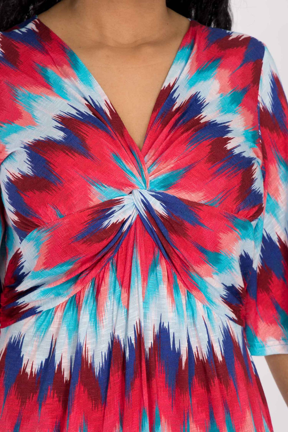 I denna klänning får du allt: ett livfullt mönster i rosa, rött, turkost, himmelsblått och djupt vinrött – som en färgexplosion full av energi. Modellen är sydd i en mjuk, stretchig viskostrikå som ger en bekväm känsla hela dagen.