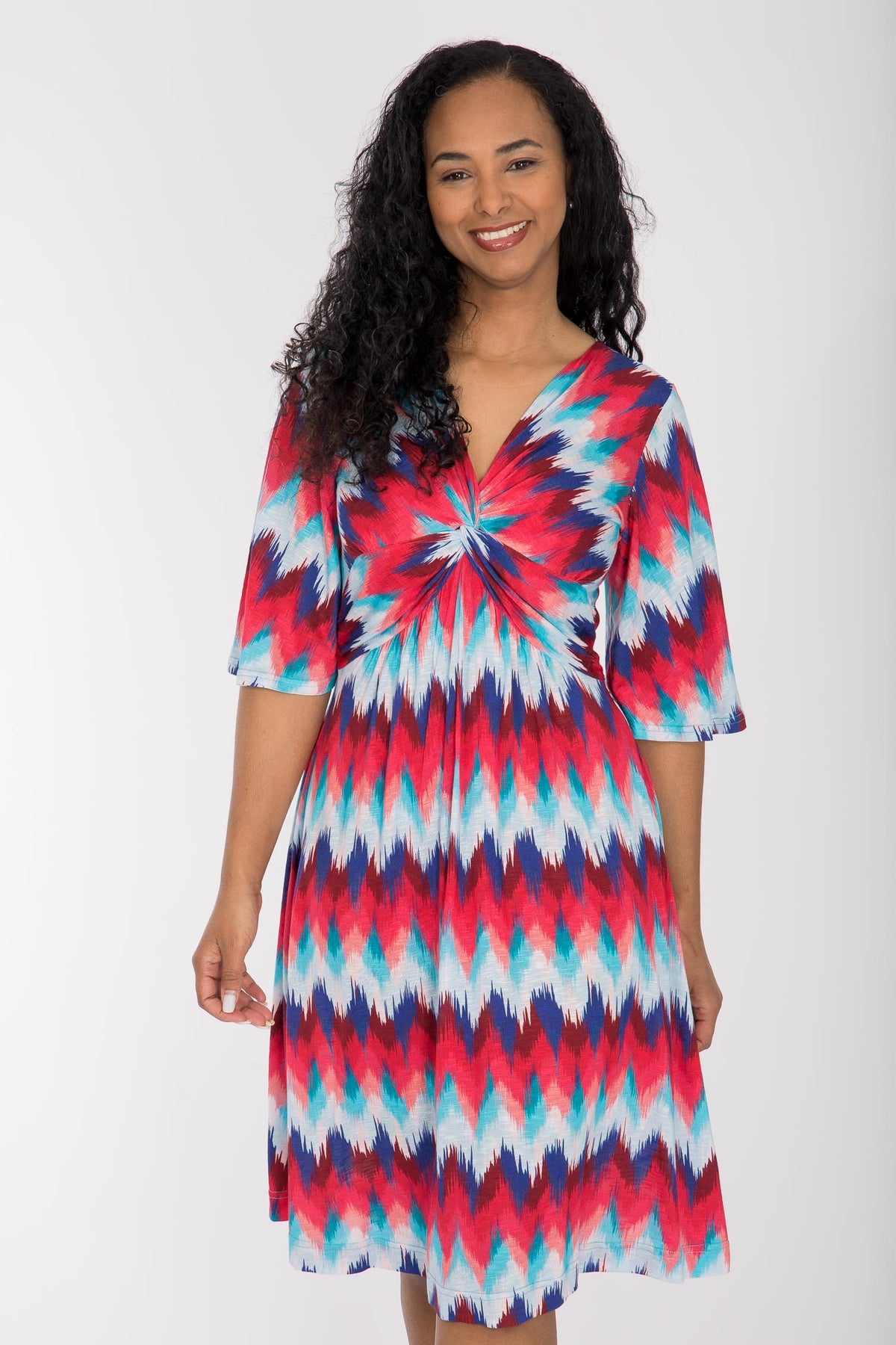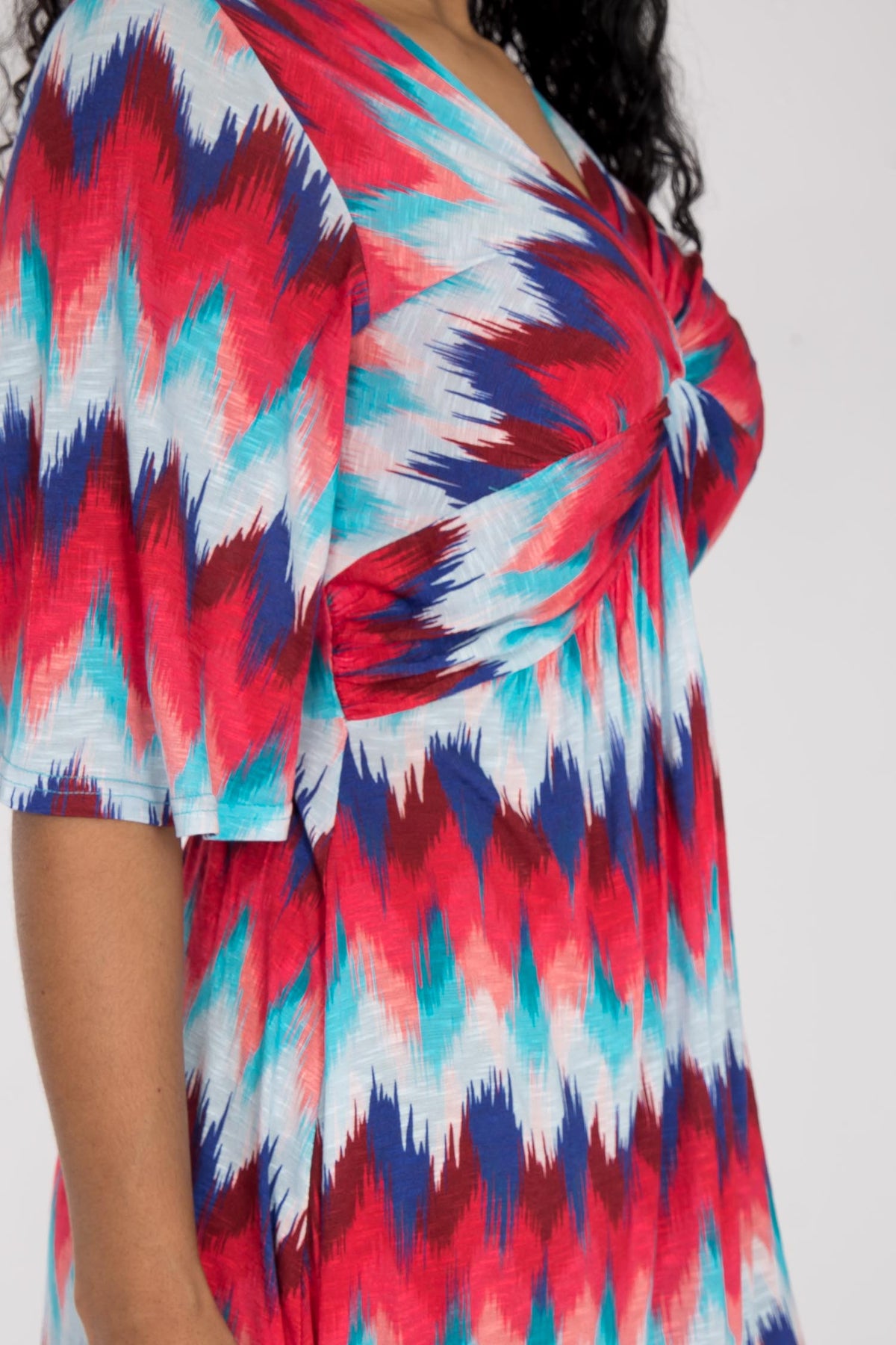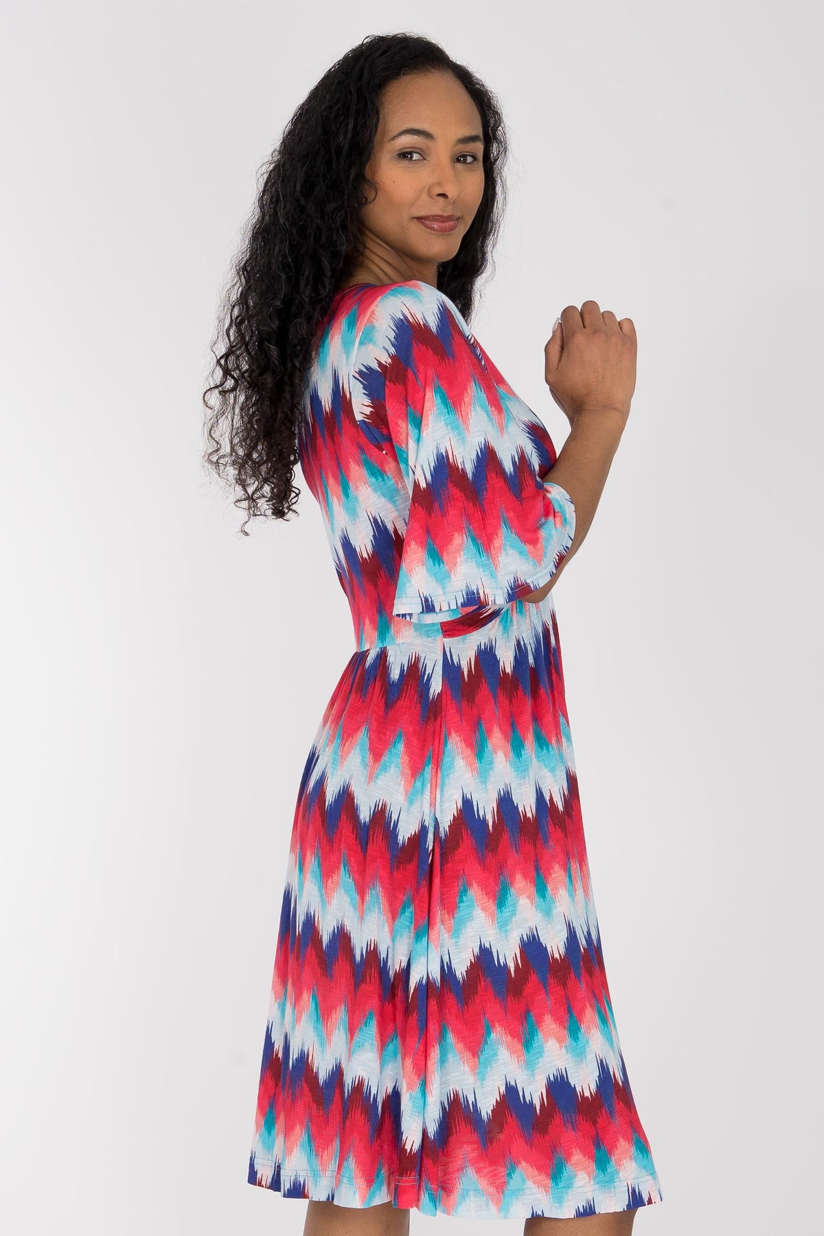 I denna klänning får du allt: ett livfullt mönster i rosa, rött, turkost, himmelsblått och djupt vinrött – som en färgexplosion full av energi. Modellen är sydd i en mjuk, stretchig viskostrikå som ger en bekväm känsla hela dagen.