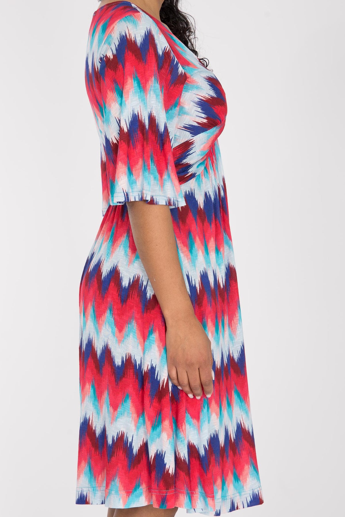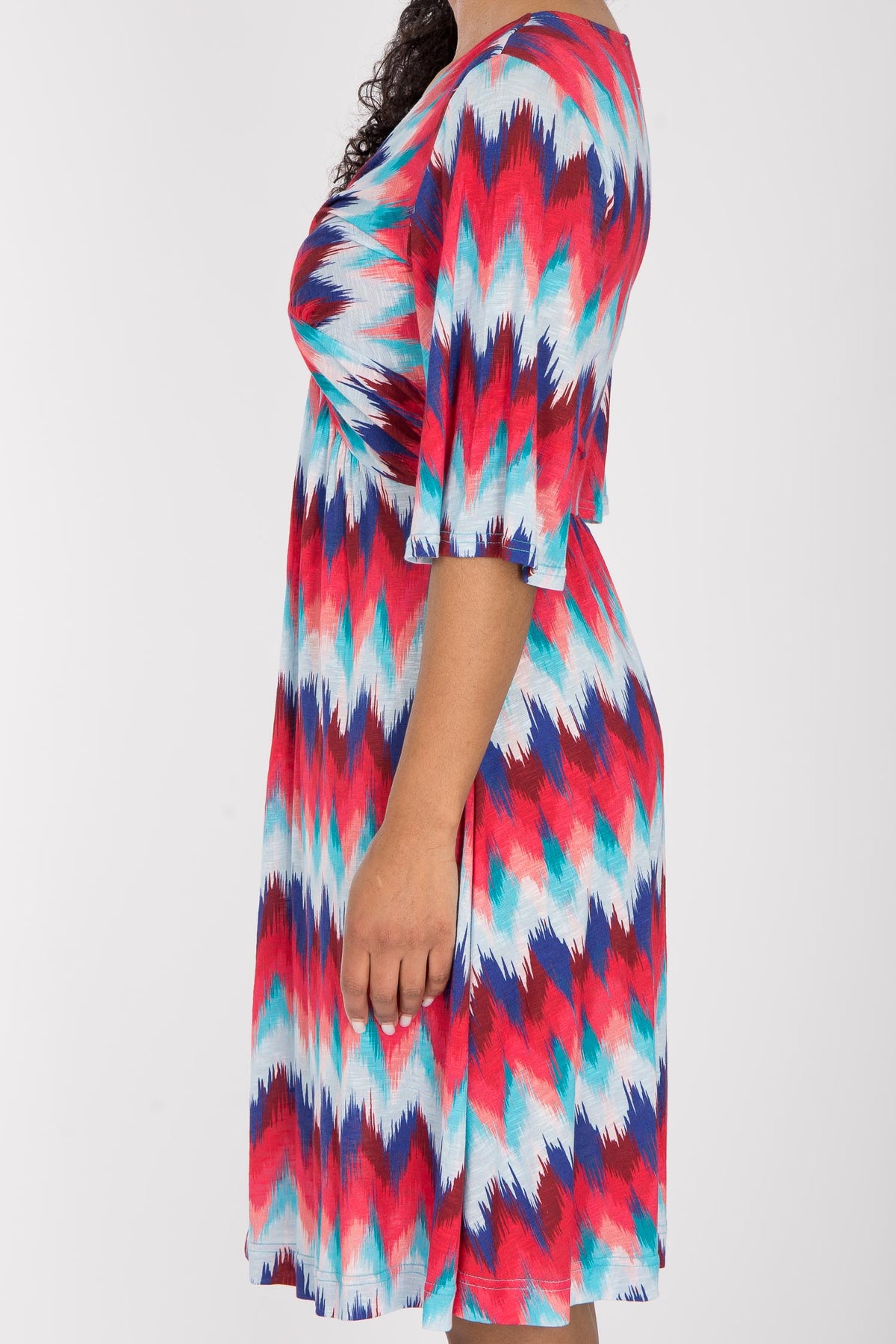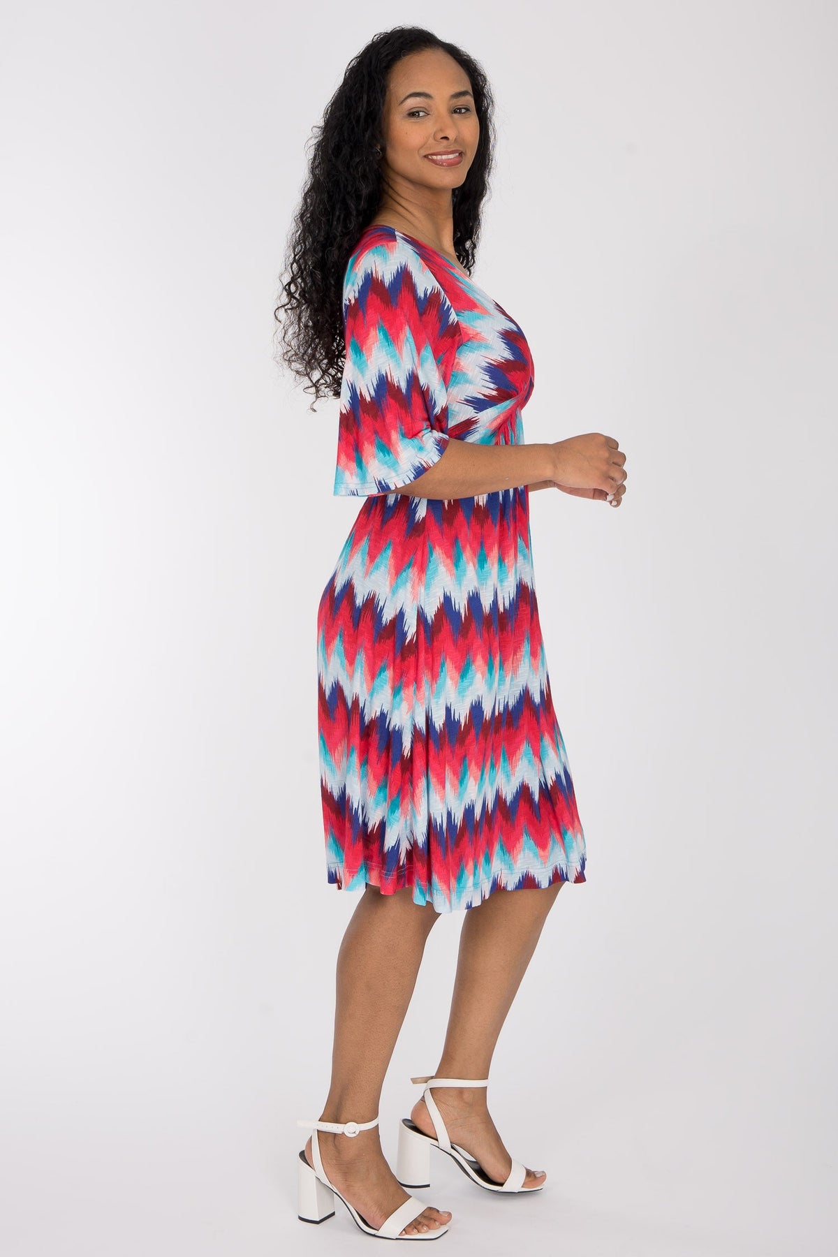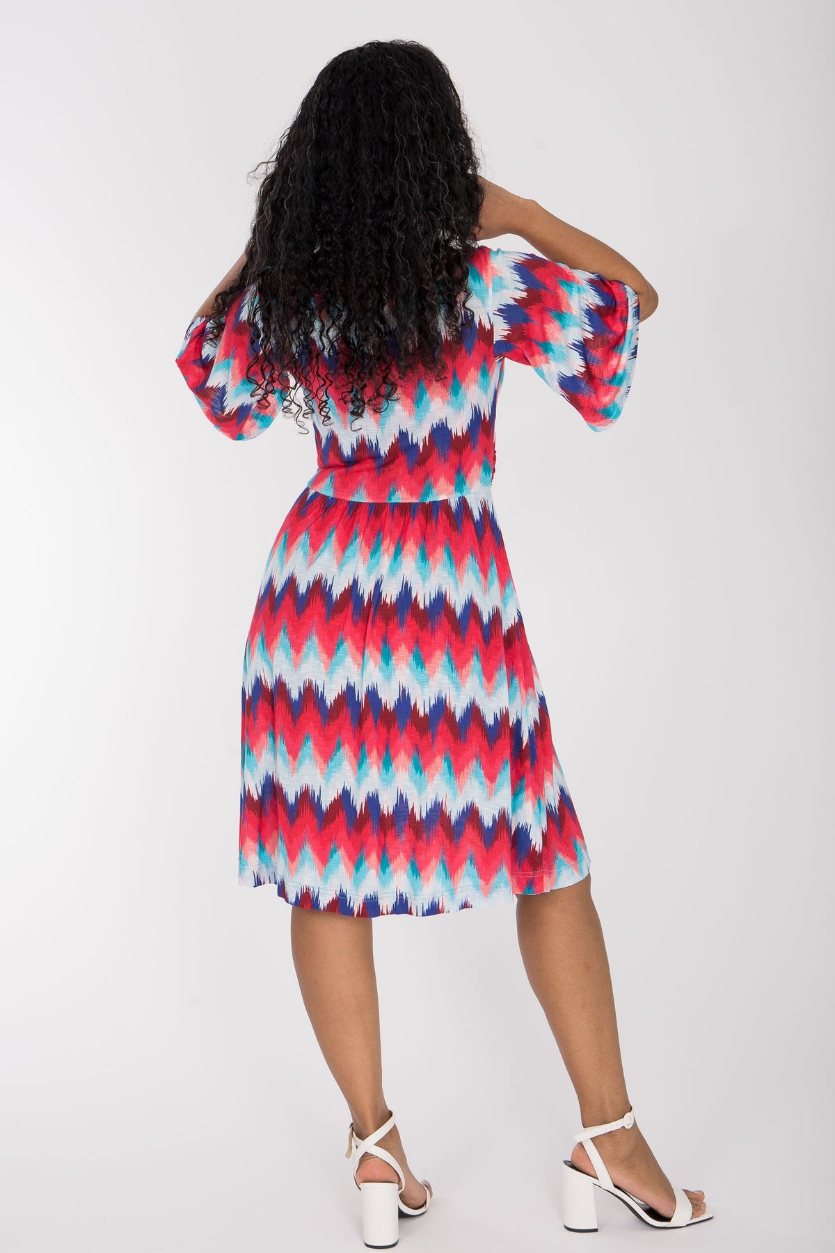 I denna klänning får du allt: ett livfullt mönster i rosa, rött, turkost, himmelsblått och djupt vinrött – som en färgexplosion full av energi. Modellen är sydd i en mjuk, stretchig viskostrikå som ger en bekväm känsla hela dagen.