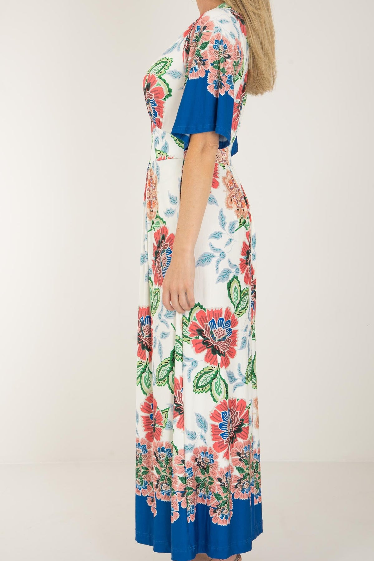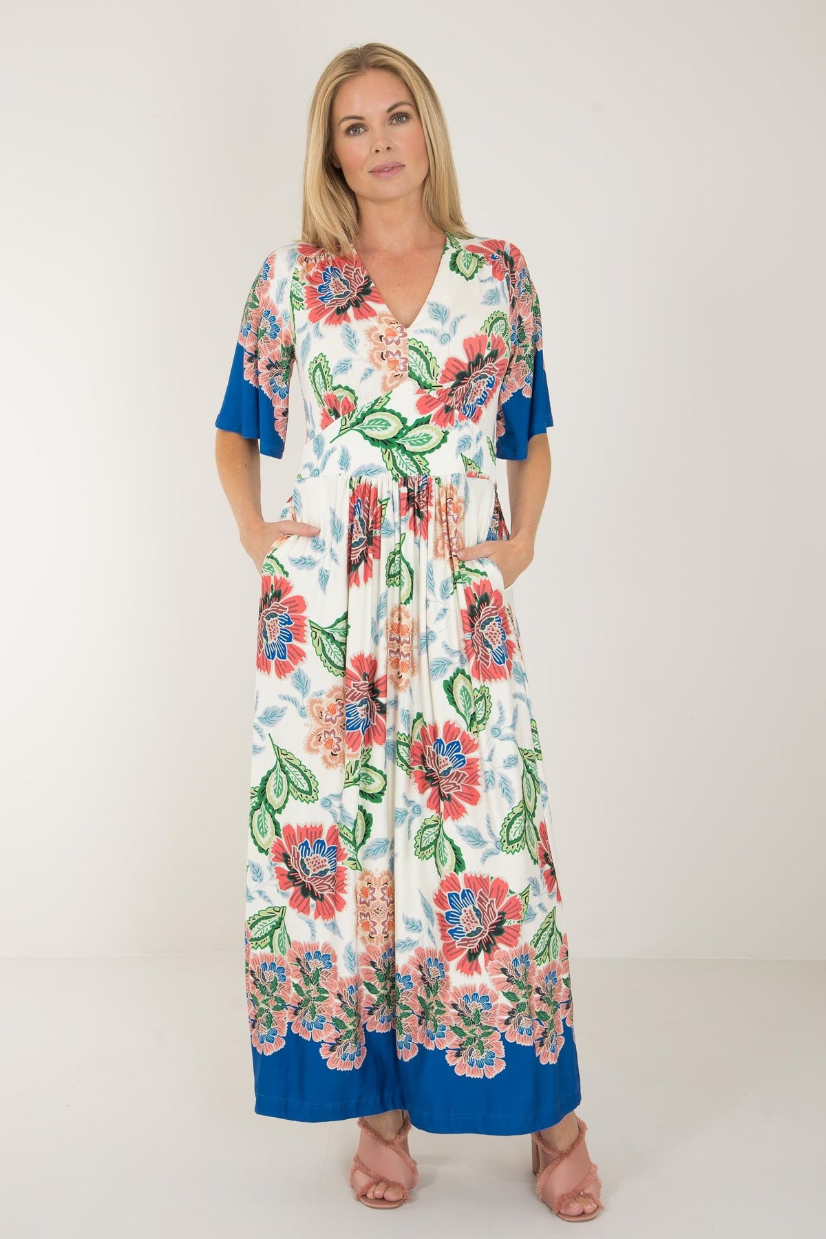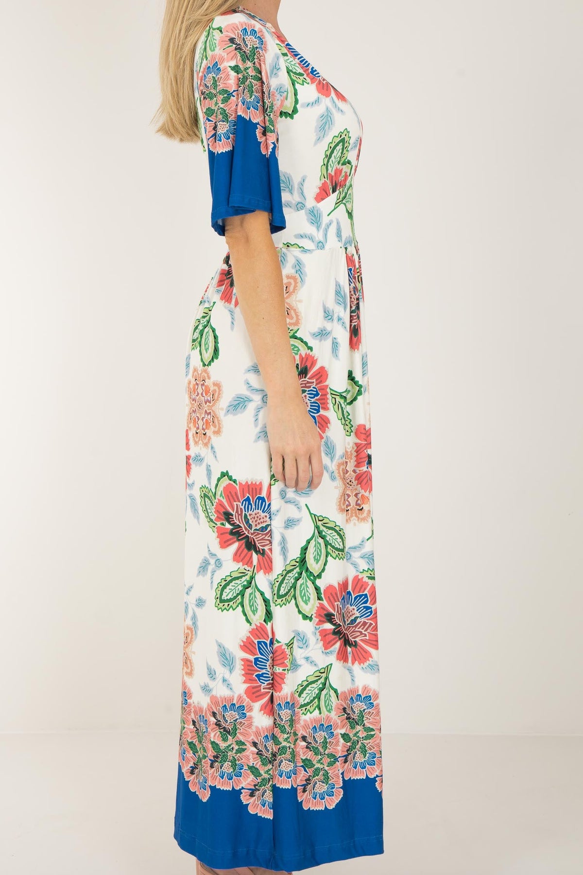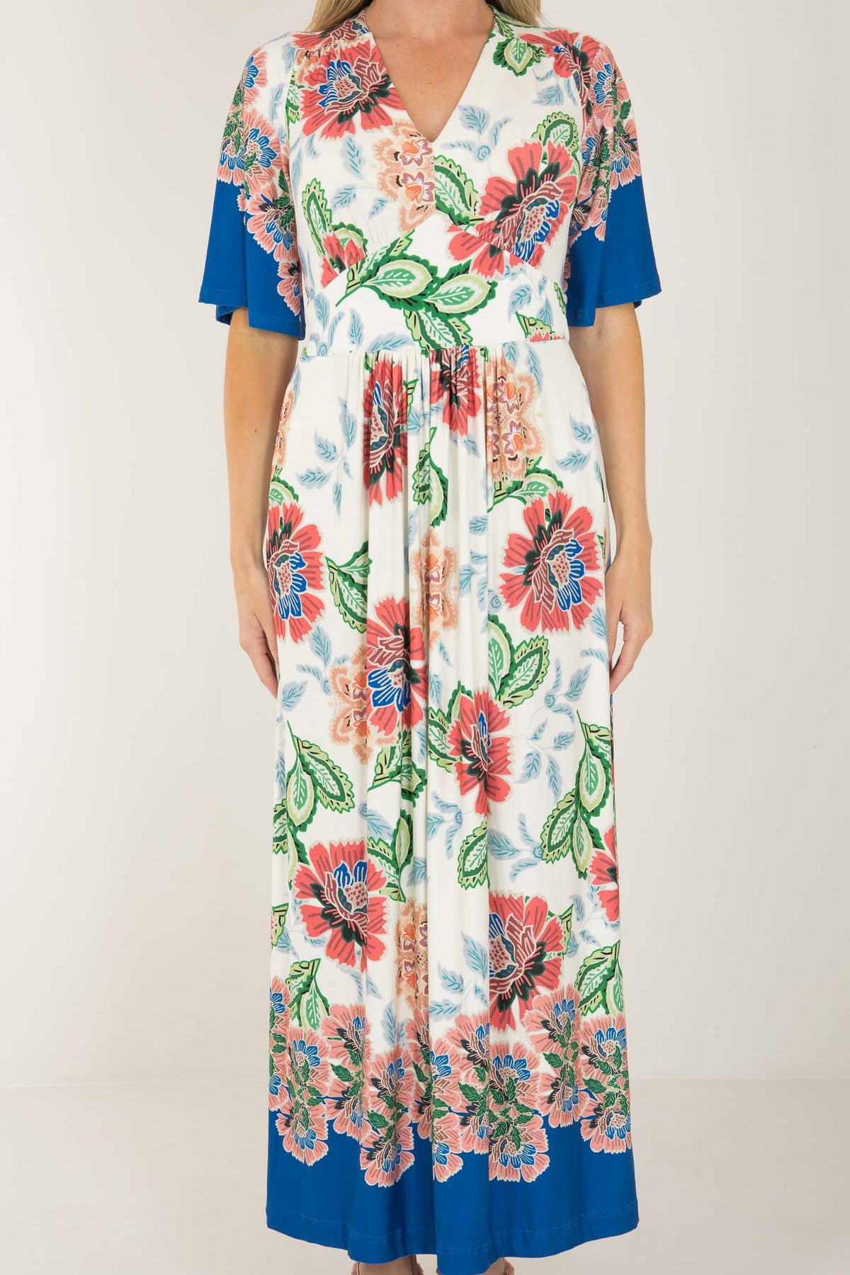 Nina jersey dress är något extra! Denna blommönstrade trikåklänning kombinerar komfort och stil på bästa sätt. Klockade ärmar och V-ringning med rynkdetaljer vid axeln ger en feminin och elegant touch. Figurnära upptill med formande midja och vid kjol som smickrar figuren.
