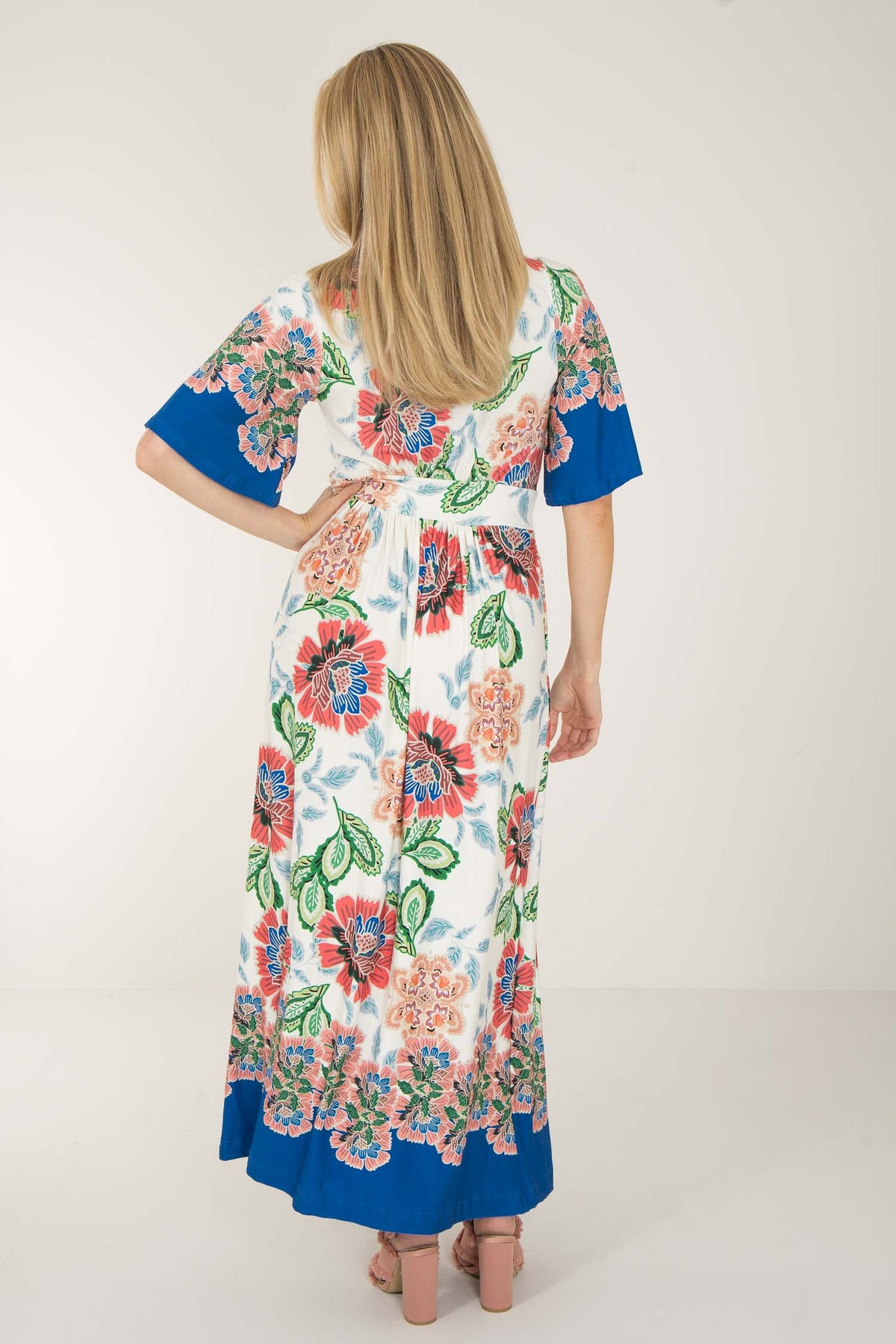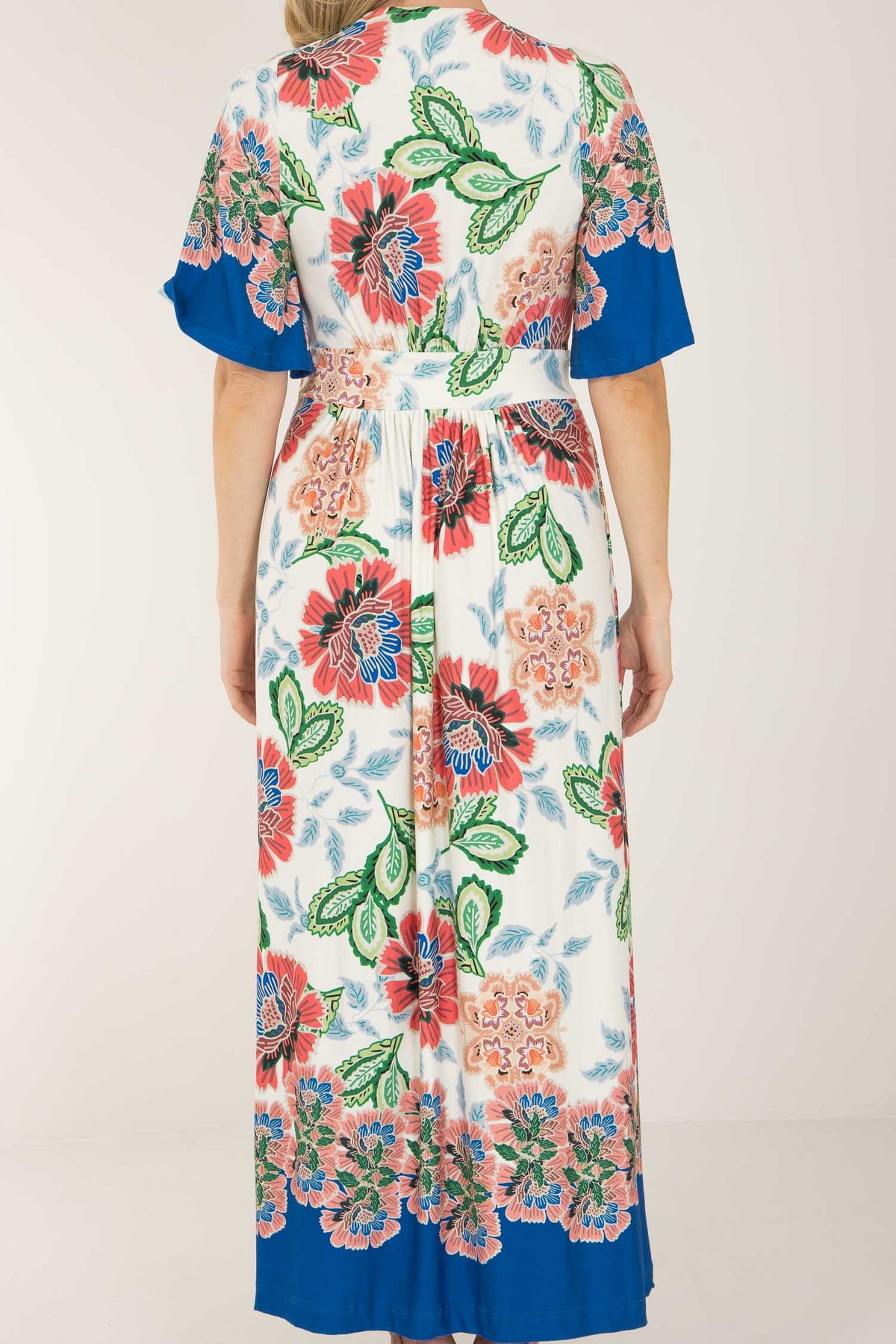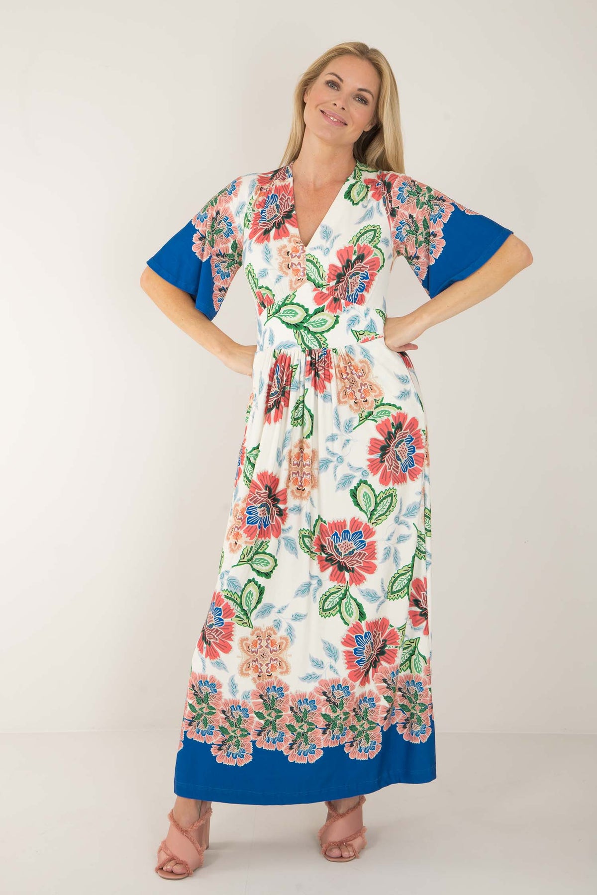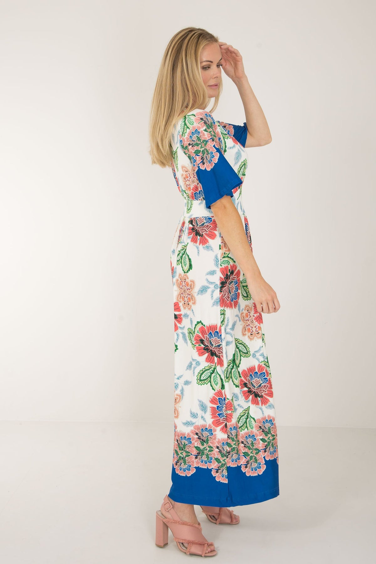 Nina jersey dress är något extra! Denna blommönstrade trikåklänning kombinerar komfort och stil på bästa sätt. Klockade ärmar och V-ringning med rynkdetaljer vid axeln ger en feminin och elegant touch. Figurnära upptill med formande midja och vid kjol som smickrar figuren.