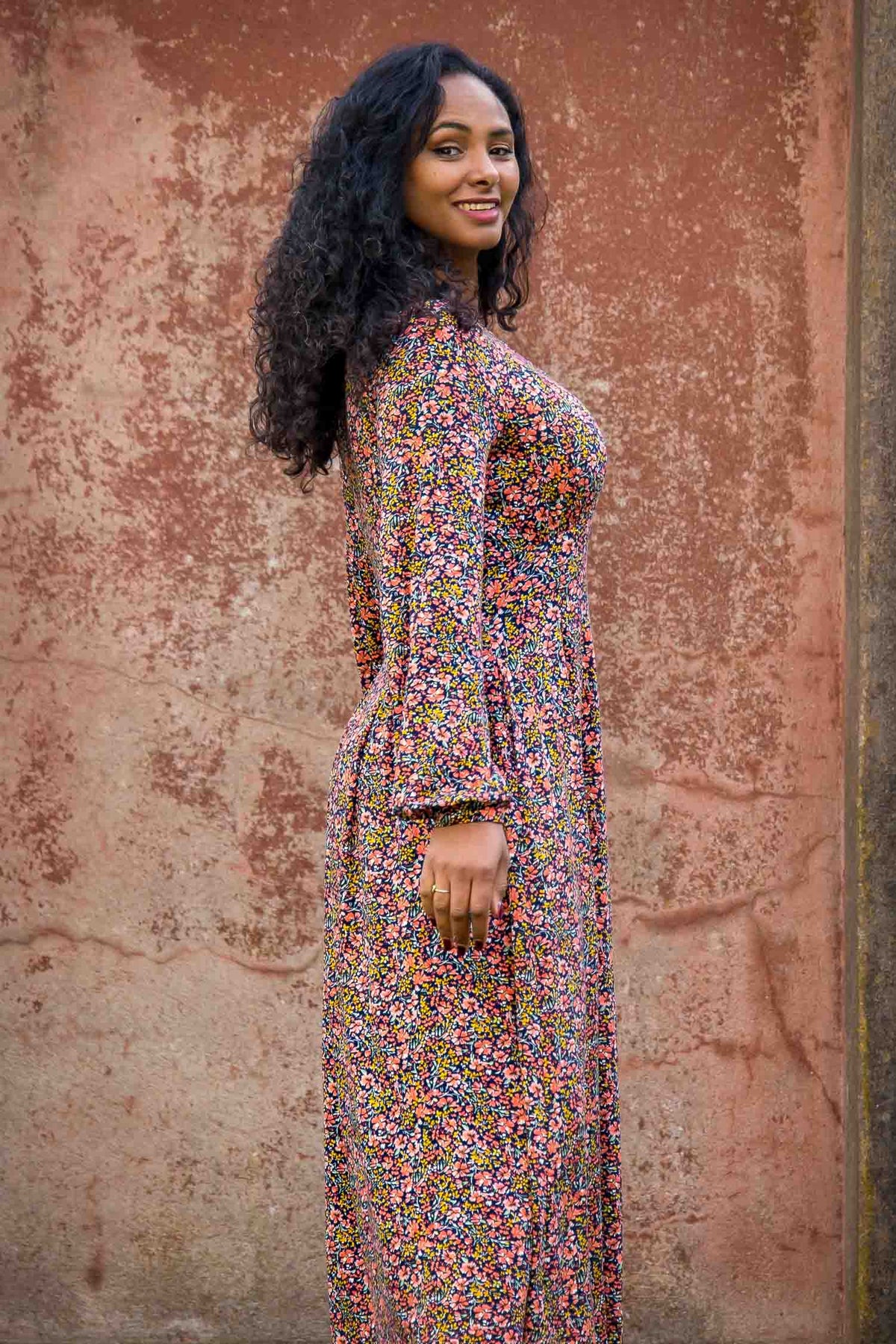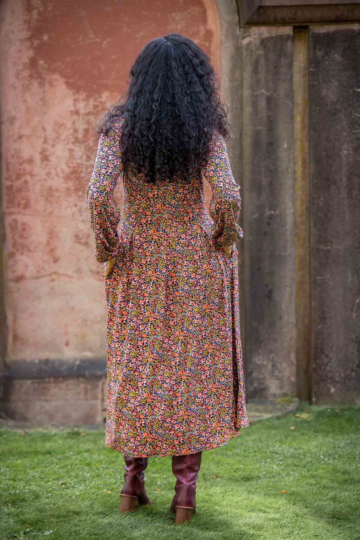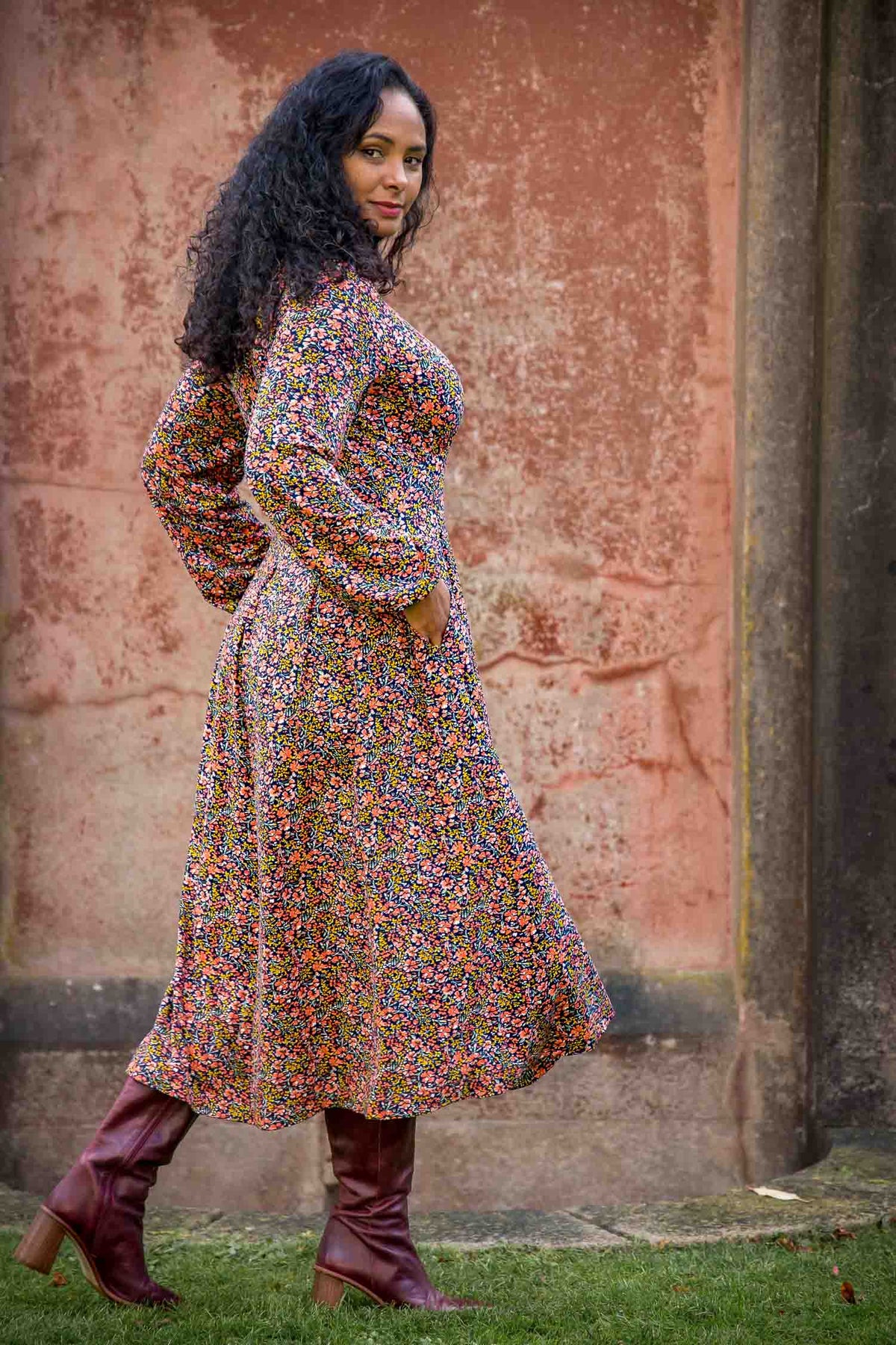 Den markerade midjan, med sina insydda motveck, gör kjolen vippig och ger en härlig vidd. Blommönstret i korallfärg står vackert mot den djupblå botten – perfekt för att lysa upp din dag. Och självklart har klänningen praktiska fickor i sidorna, så du kan ha dina småsaker nära till hands.