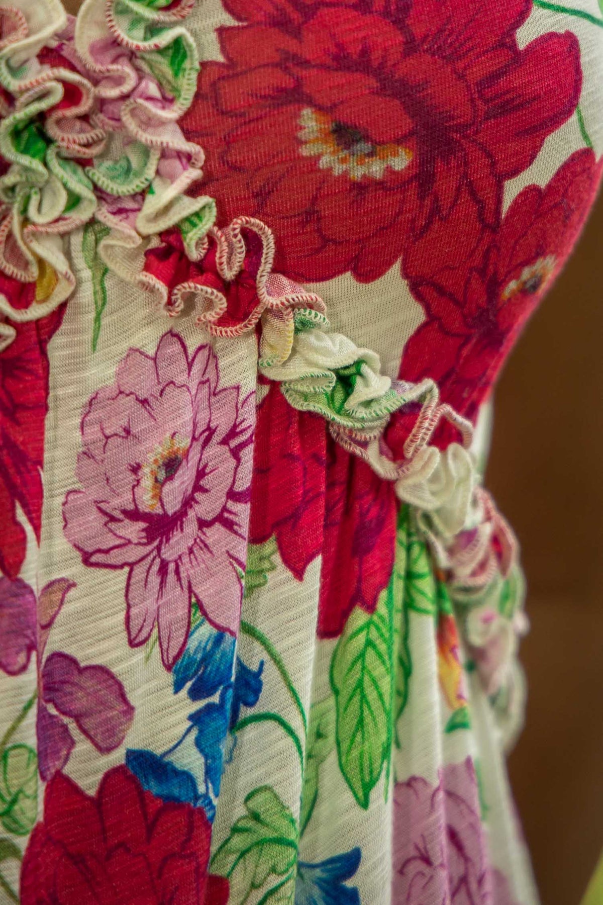 Soft flourish är en helt ny favoritmodell – skön att bära, lätt att tycka om. Den är sydd i en mjuk och följsam viskosblandning med ett blommigt mönster i nyanser av rött, grönt och blått mot en benvit botten. Trikån faller fint och följer kroppen utan att sitta åt. Den rynkade midjan ger ett mjukt fall på den långa volangkjolen. V-ringningen ramas in av en liten volangkant som fortsätter snett över bysten och skapar en smickrande form.
