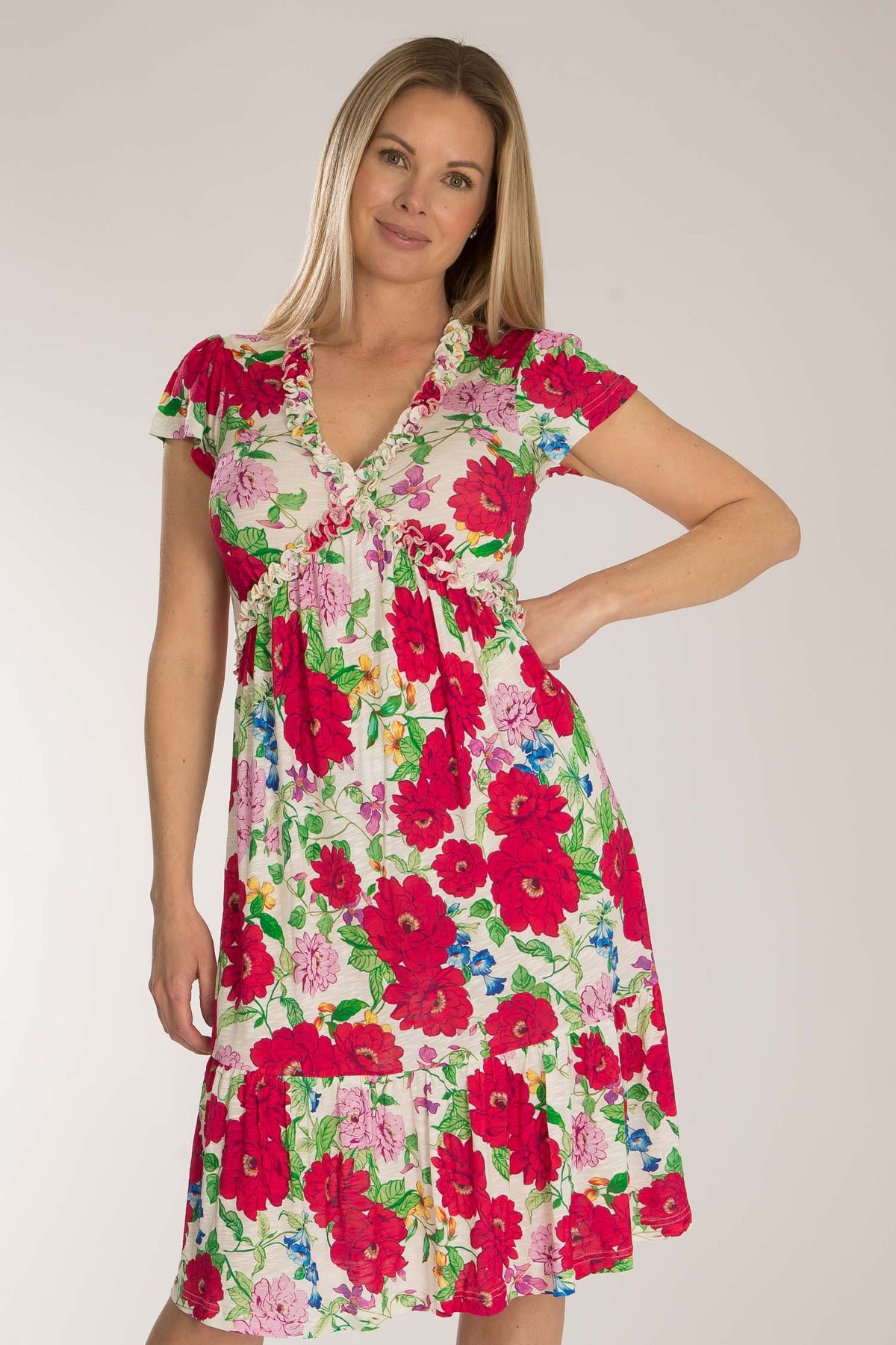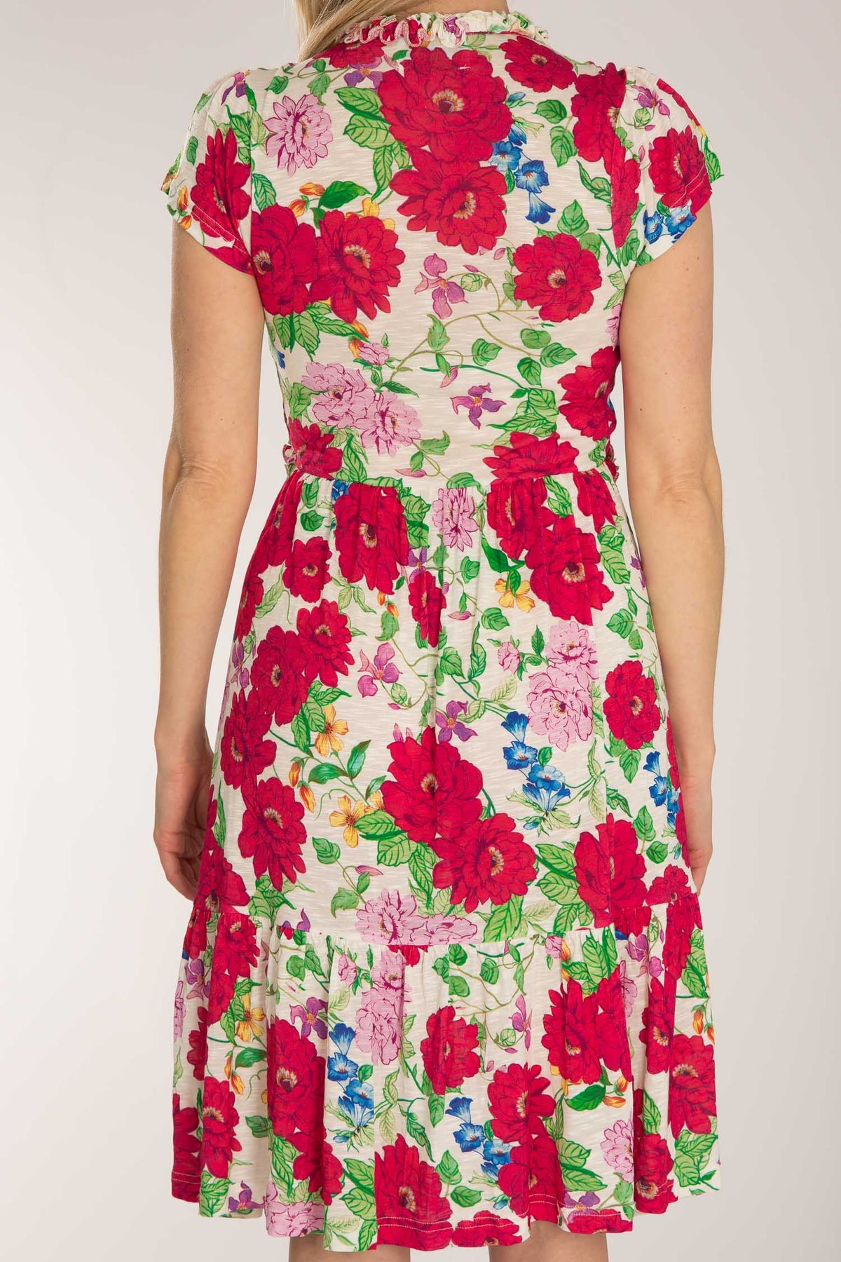 Soft flourish är en helt ny favoritmodell – skön att bära, lätt att tycka om. Den är sydd i en mjuk och följsam viskosblandning med ett blommigt mönster i nyanser av rött, grönt och blått mot en benvit botten. Trikån faller fint och följer kroppen utan att sitta åt. Den rynkade midjan ger ett mjukt fall i kjolen, som avslutas med en bred volang nertill. V-ringningen ramas in av en liten volangkant som fortsätter snett över bysten och skapar en smickrande form.
