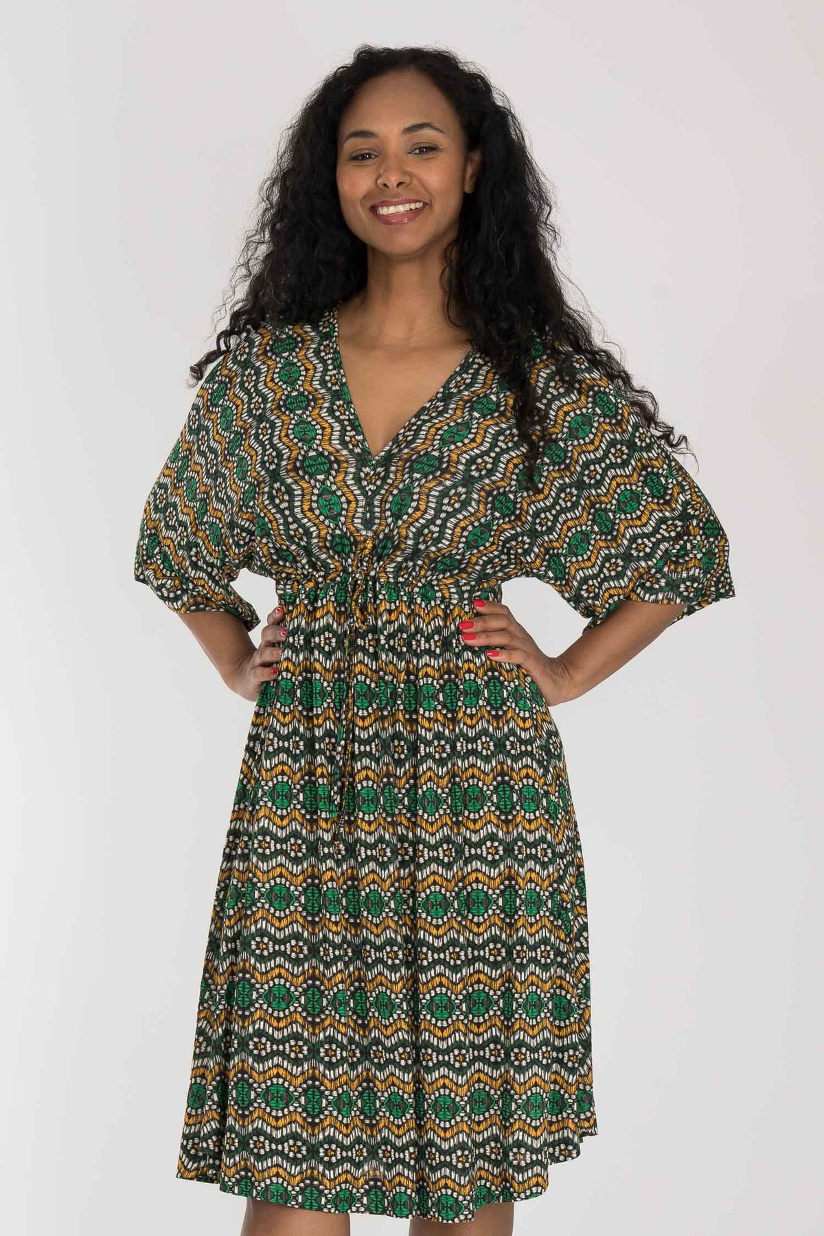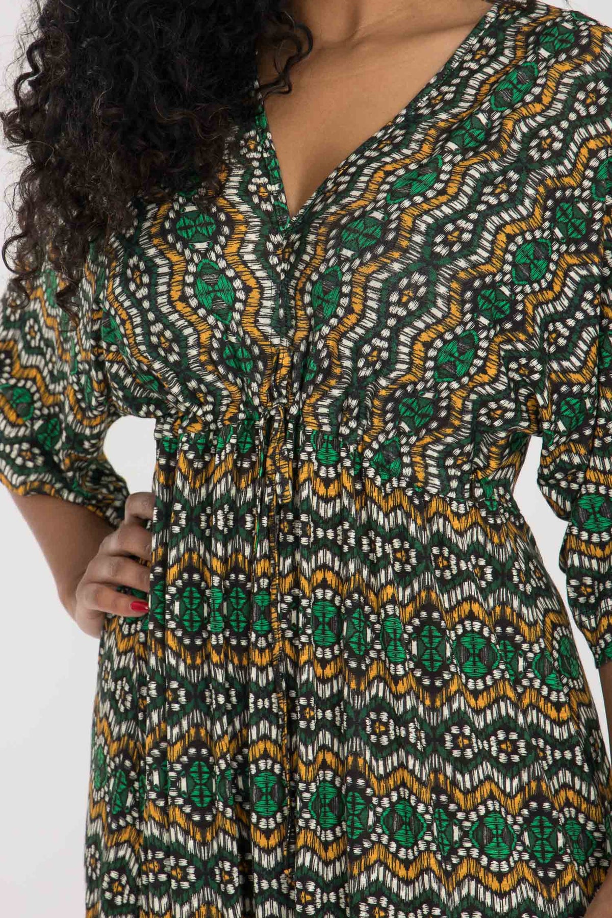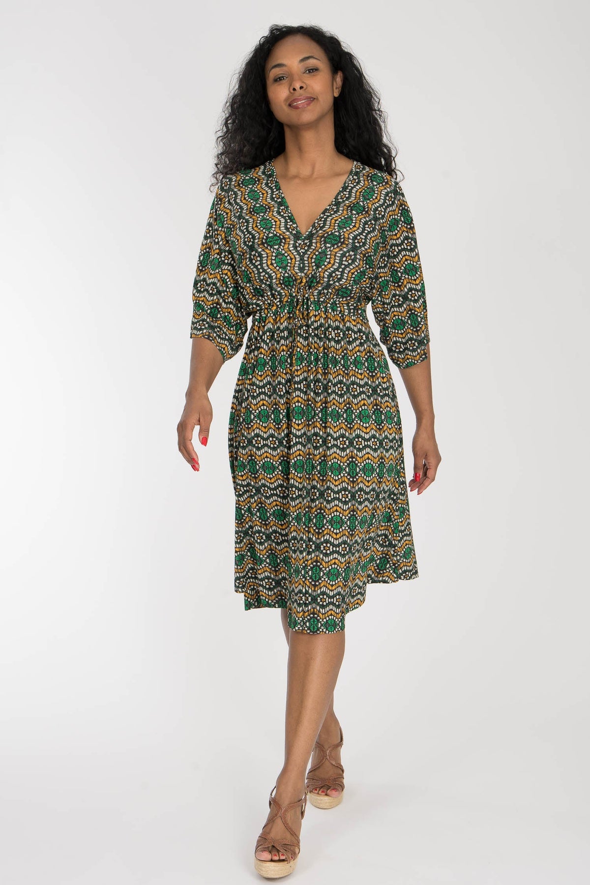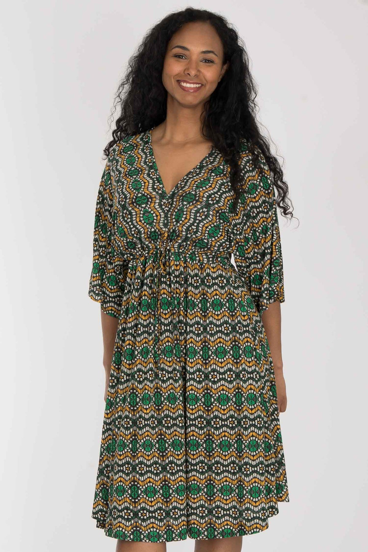 Sydd i mjuk och följsam viskostrikå som andas, gör den sig lika bra under soliga dagar som ljumma kvällar. Den djupa kimonoärmen ger en avslappnad silhuett och dragskon under bysten skapar en smickrande form utan att sitta åt. Det etnoinspirerade mönstret i grönt med inslag av gult ger klänningen karaktär – perfekt för allt från strandpromenader till middagar i solnedgången.