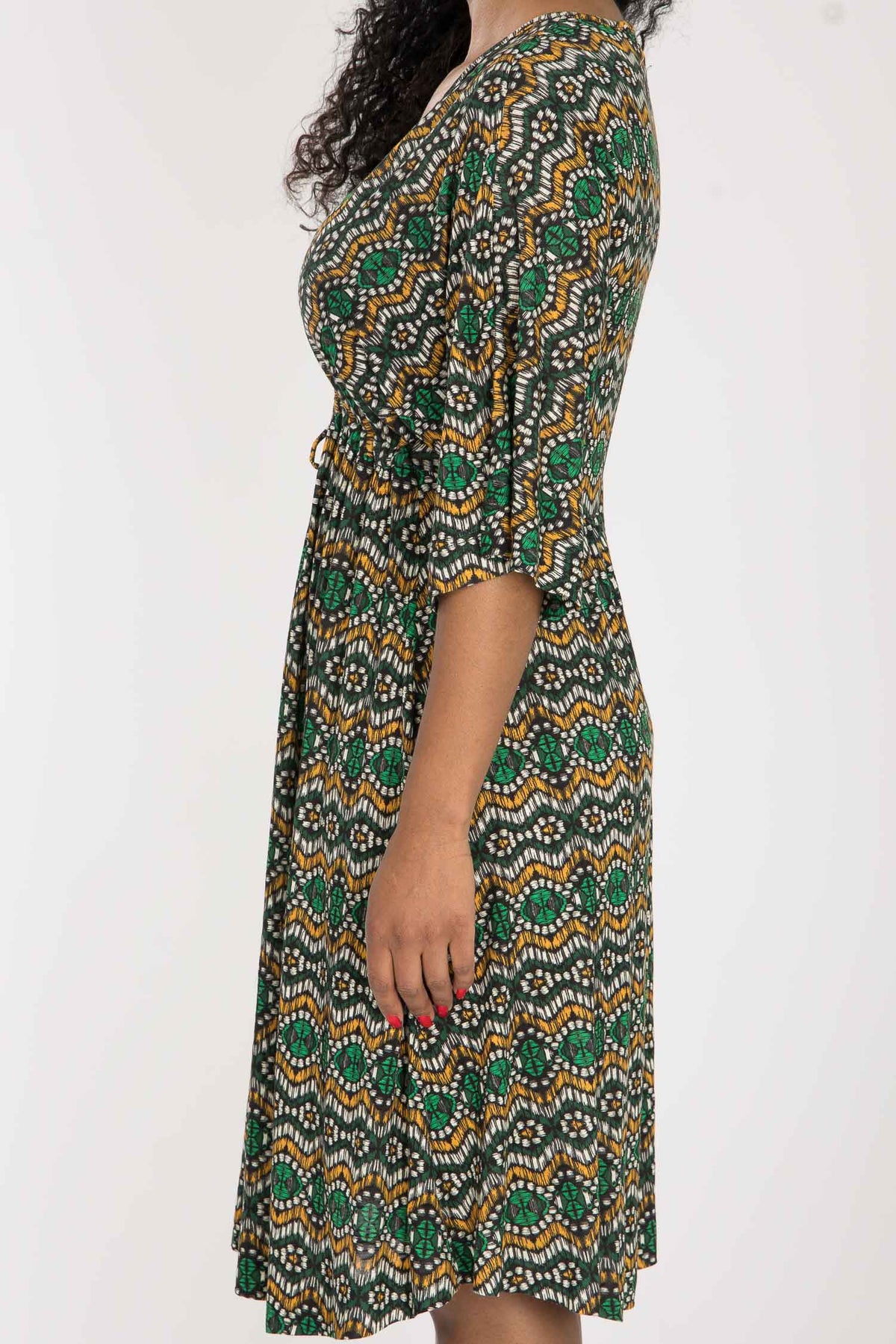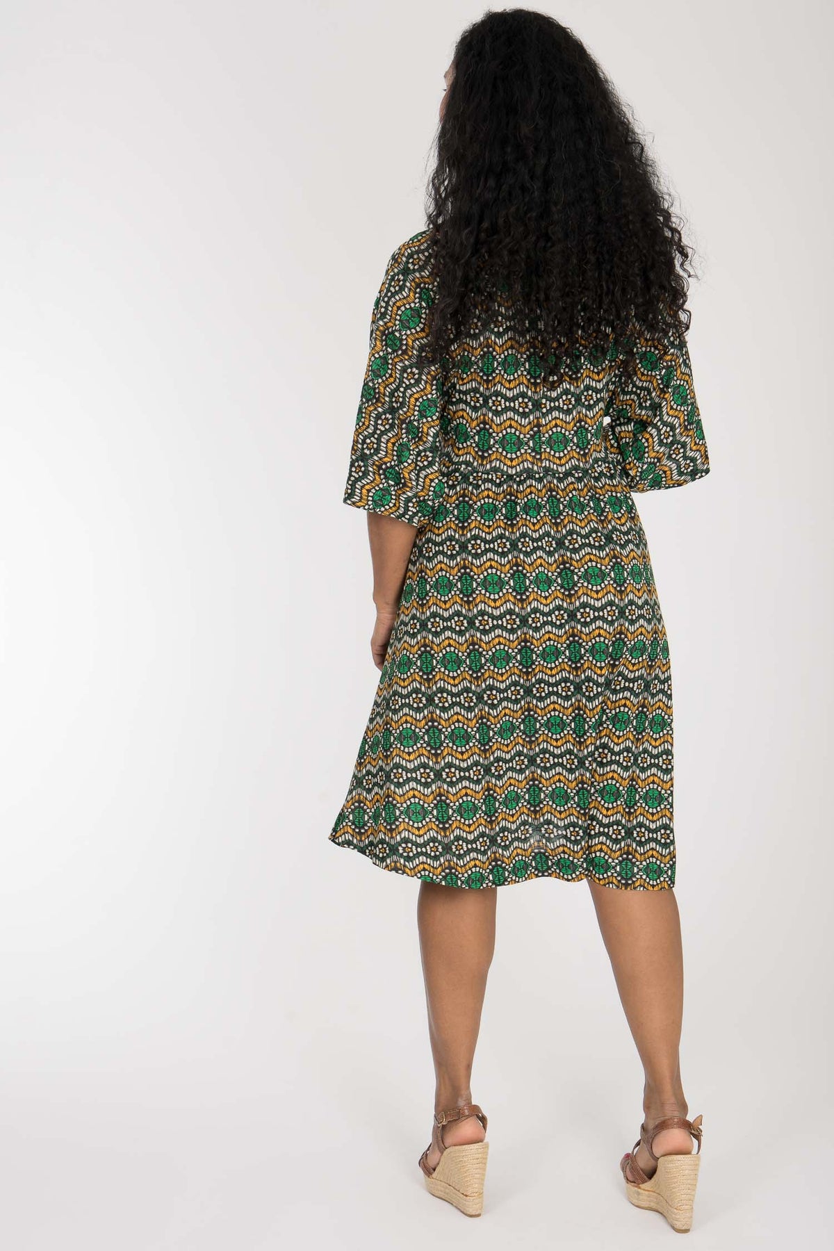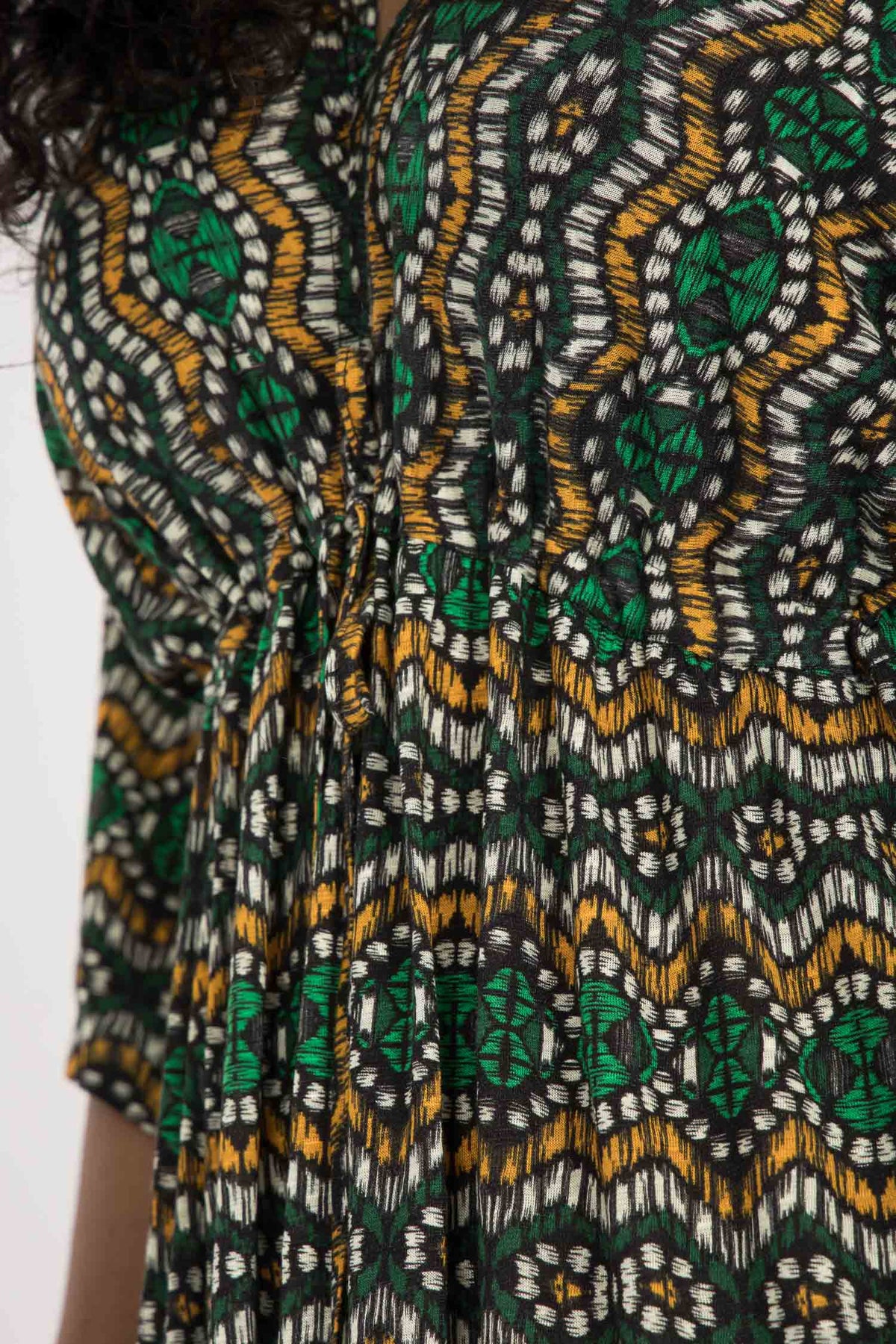 Sydd i mjuk och följsam viskostrikå som andas, gör den sig lika bra under soliga dagar som ljumma kvällar. Den djupa kimonoärmen ger en avslappnad silhuett och dragskon under bysten skapar en smickrande form utan att sitta åt. Det etnoinspirerade mönstret i grönt med inslag av gult ger klänningen karaktär – perfekt för allt från strandpromenader till middagar i solnedgången.