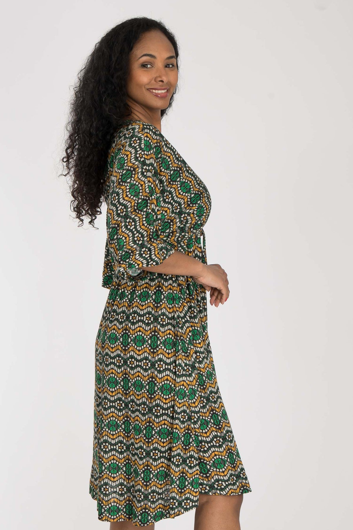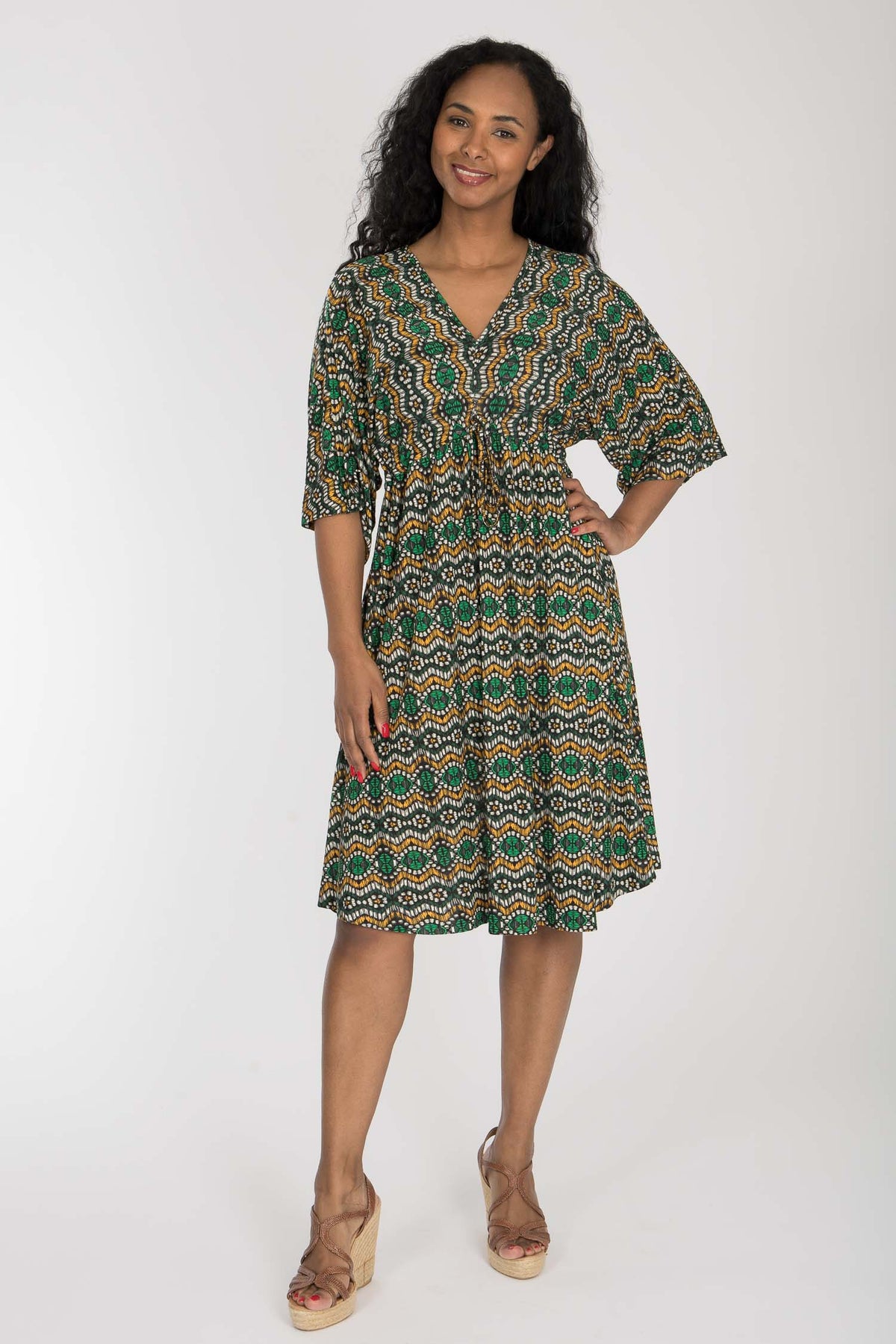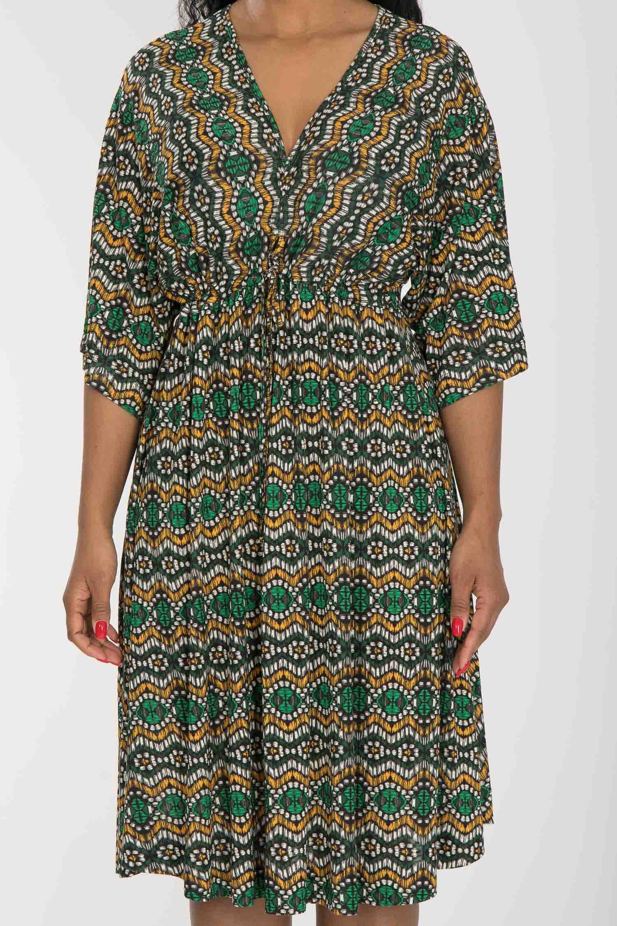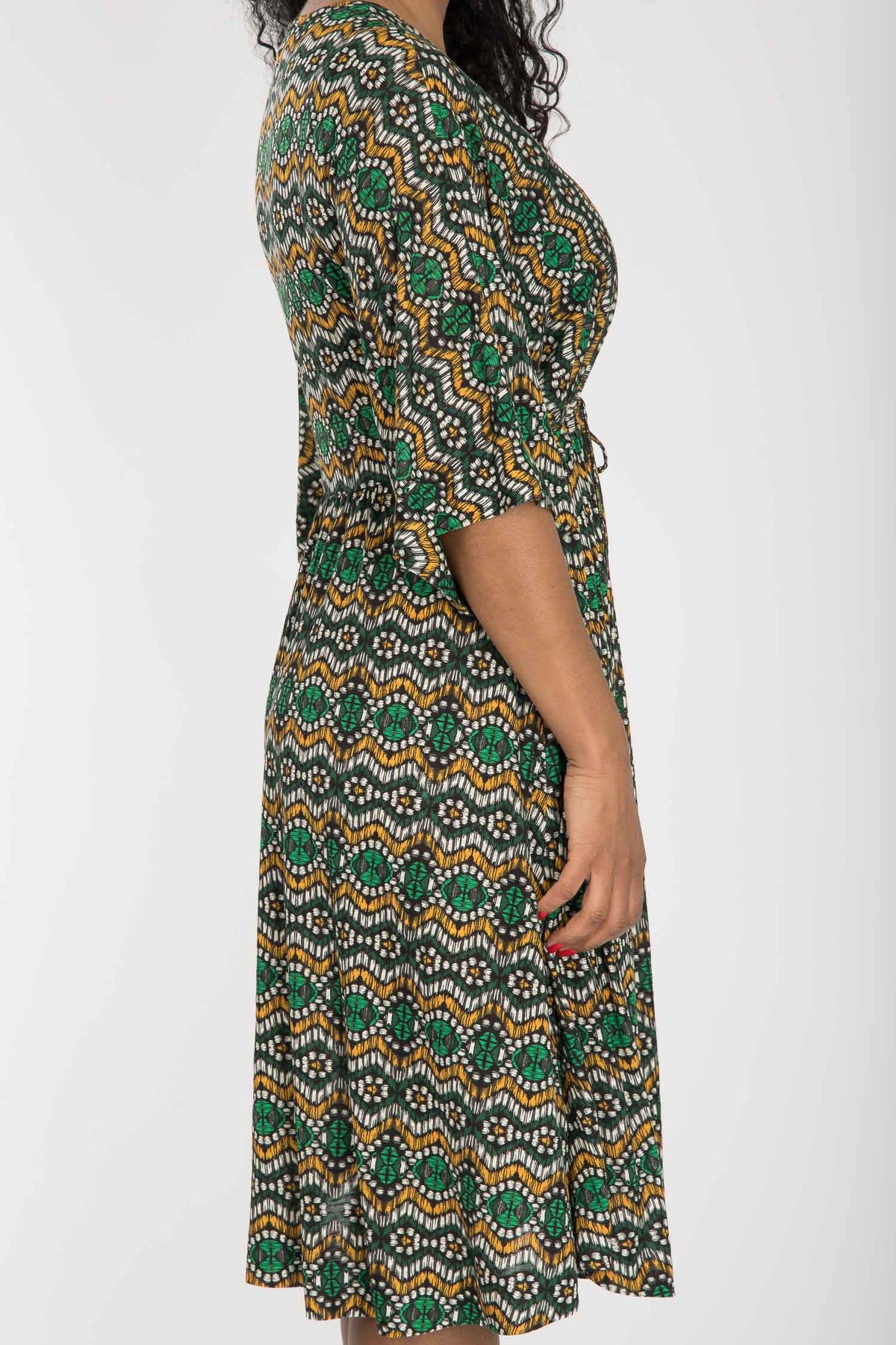 Sydd i mjuk och följsam viskostrikå som andas, gör den sig lika bra under soliga dagar som ljumma kvällar. Den djupa kimonoärmen ger en avslappnad silhuett och dragskon under bysten skapar en smickrande form utan att sitta åt. Det etnoinspirerade mönstret i grönt med inslag av gult ger klänningen karaktär – perfekt för allt från strandpromenader till middagar i solnedgången.
