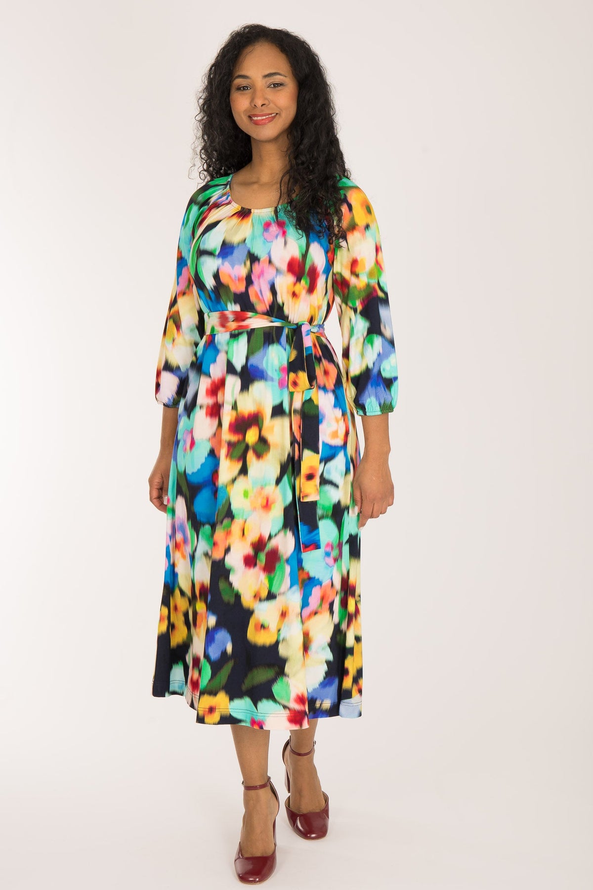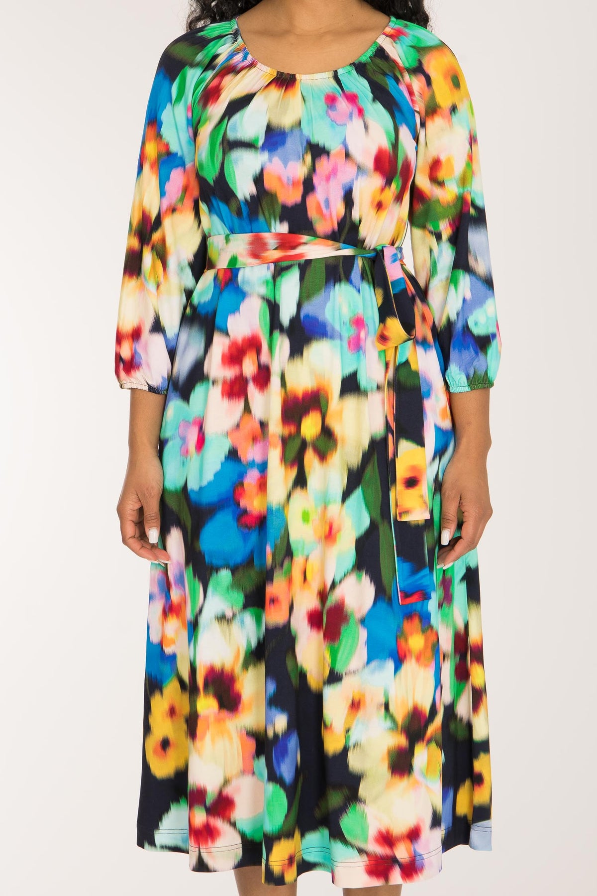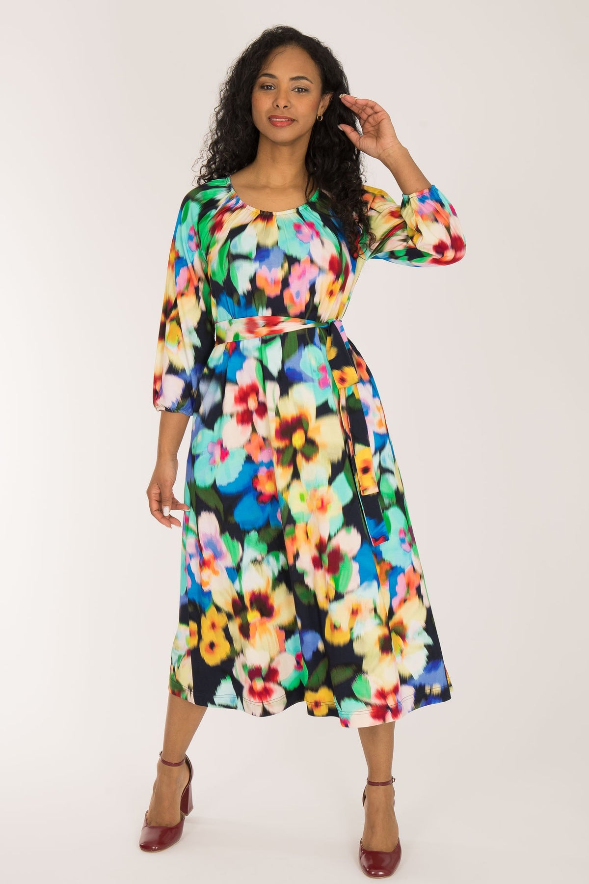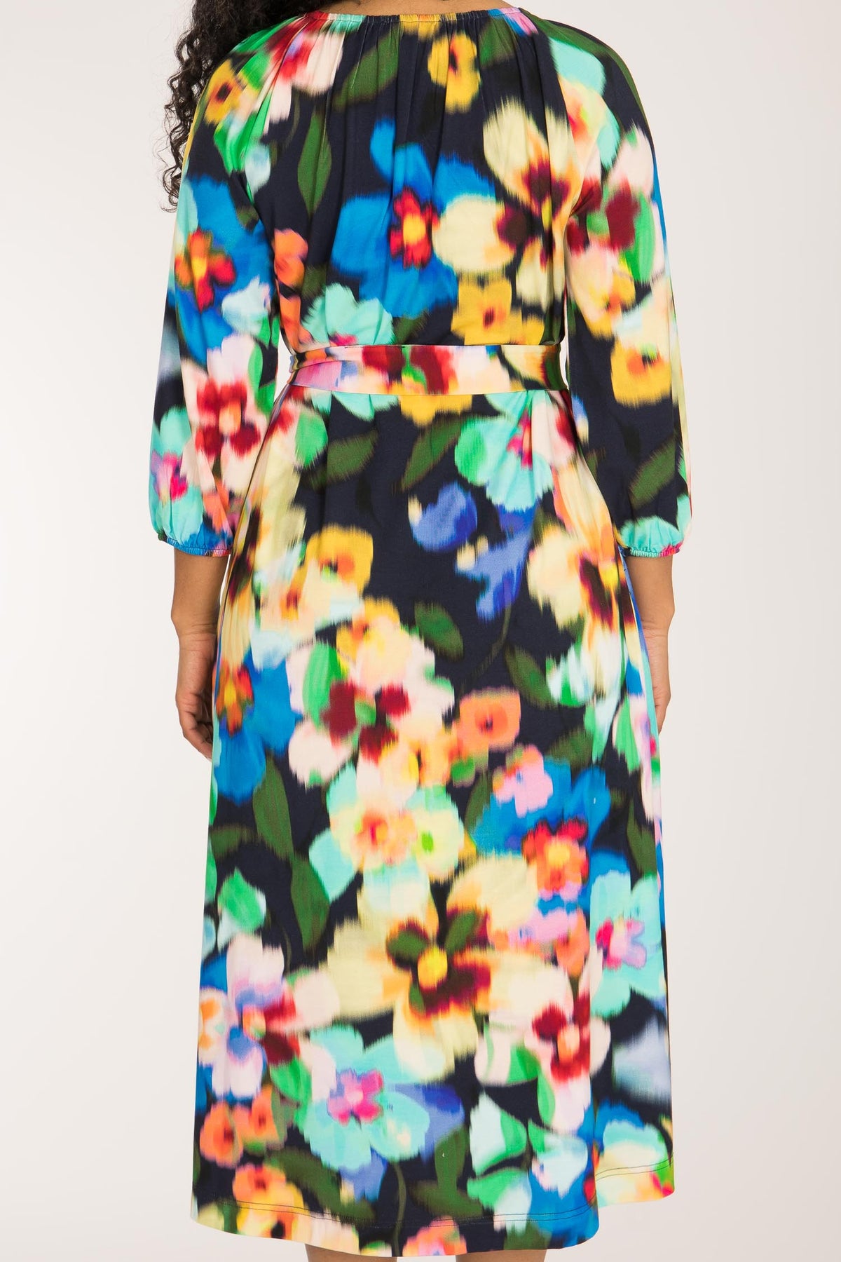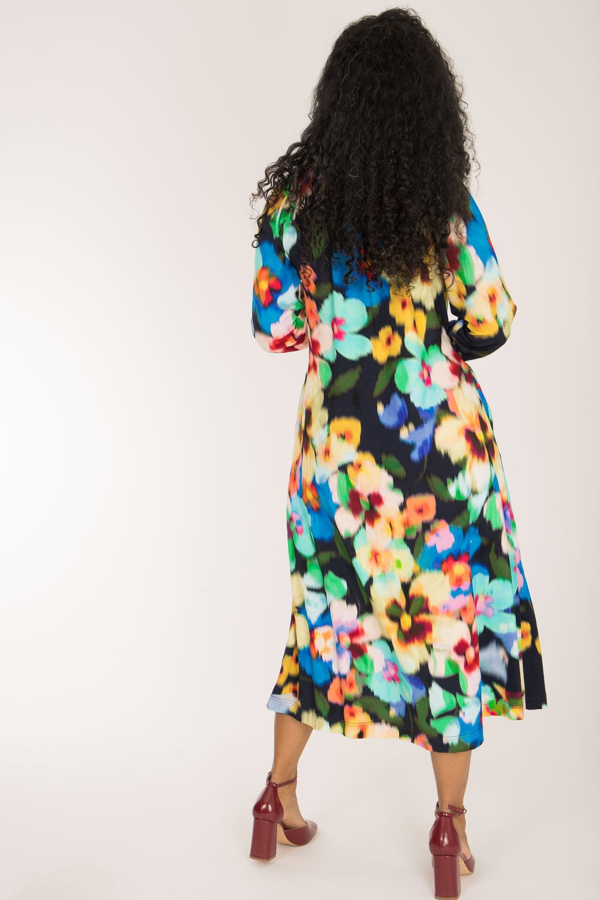 Låt färgerna tala med vår A-linjeformade klänning, A-lined belted. Den är sydd i mjuk och stretchig trikå med ett vackert tungt fall och har ett blurred florals-mönster i klara nyanser mot en mörkblå botten. En perfekt mix av livfull elegans och avslappnad komfort.