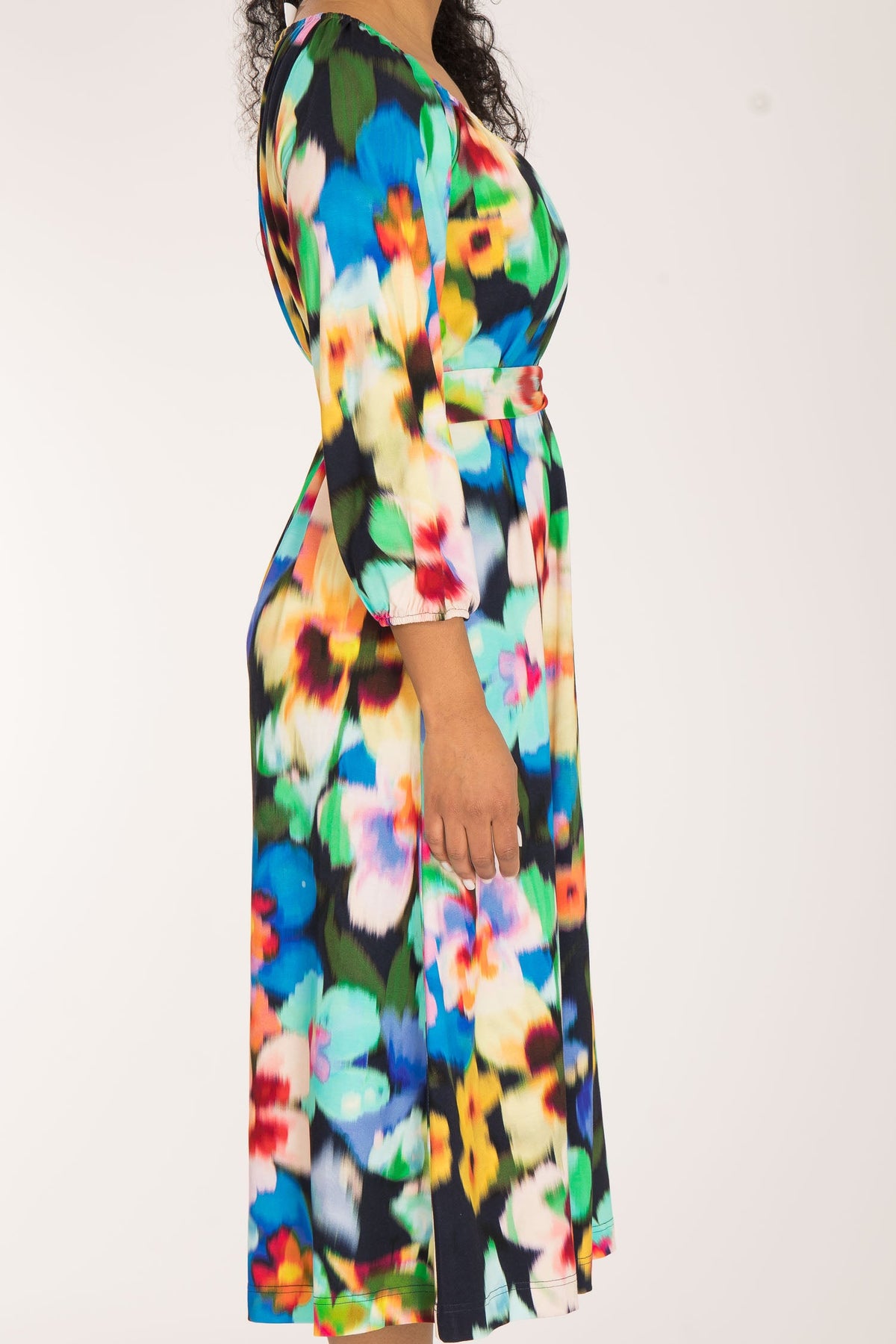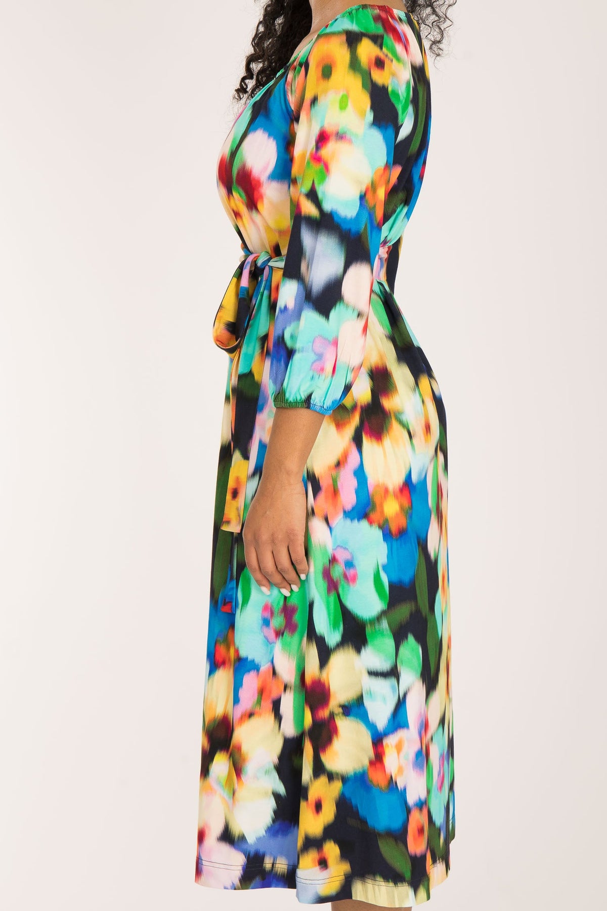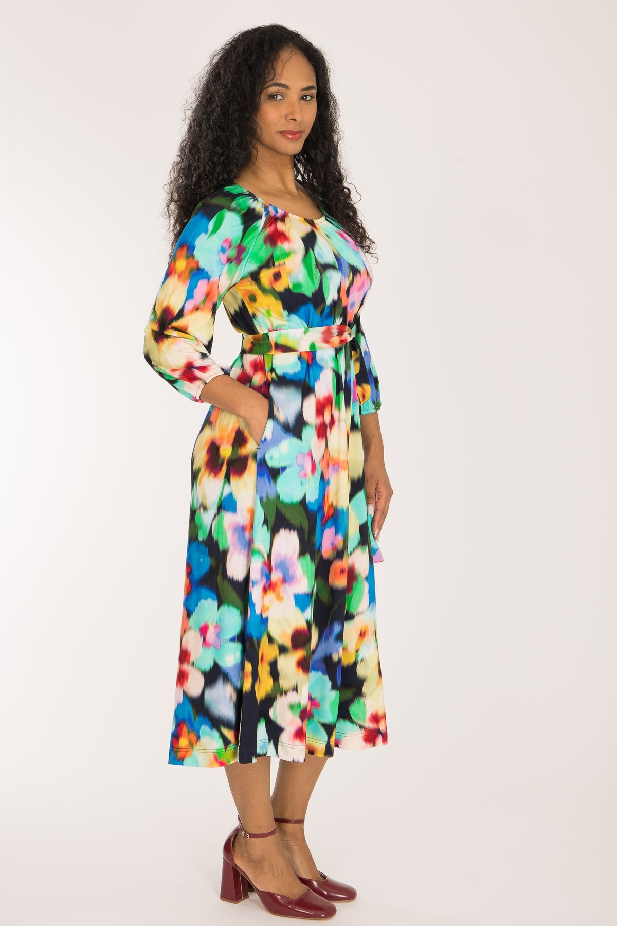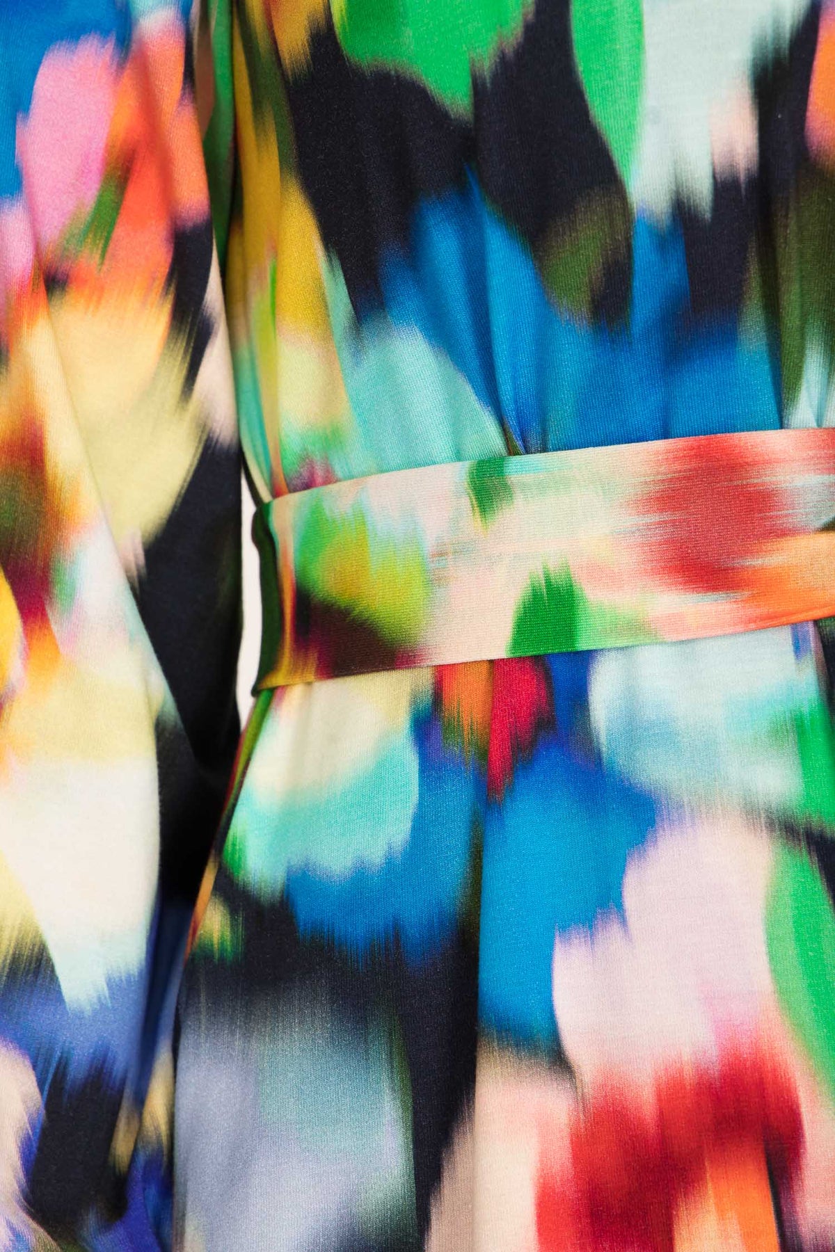 Låt färgerna tala med vår A-linjeformade klänning, A-lined belted. Den är sydd i mjuk och stretchig trikå med ett vackert tungt fall och har ett blurred florals-mönster i klara nyanser mot en mörkblå botten. En perfekt mix av livfull elegans och avslappnad komfort.