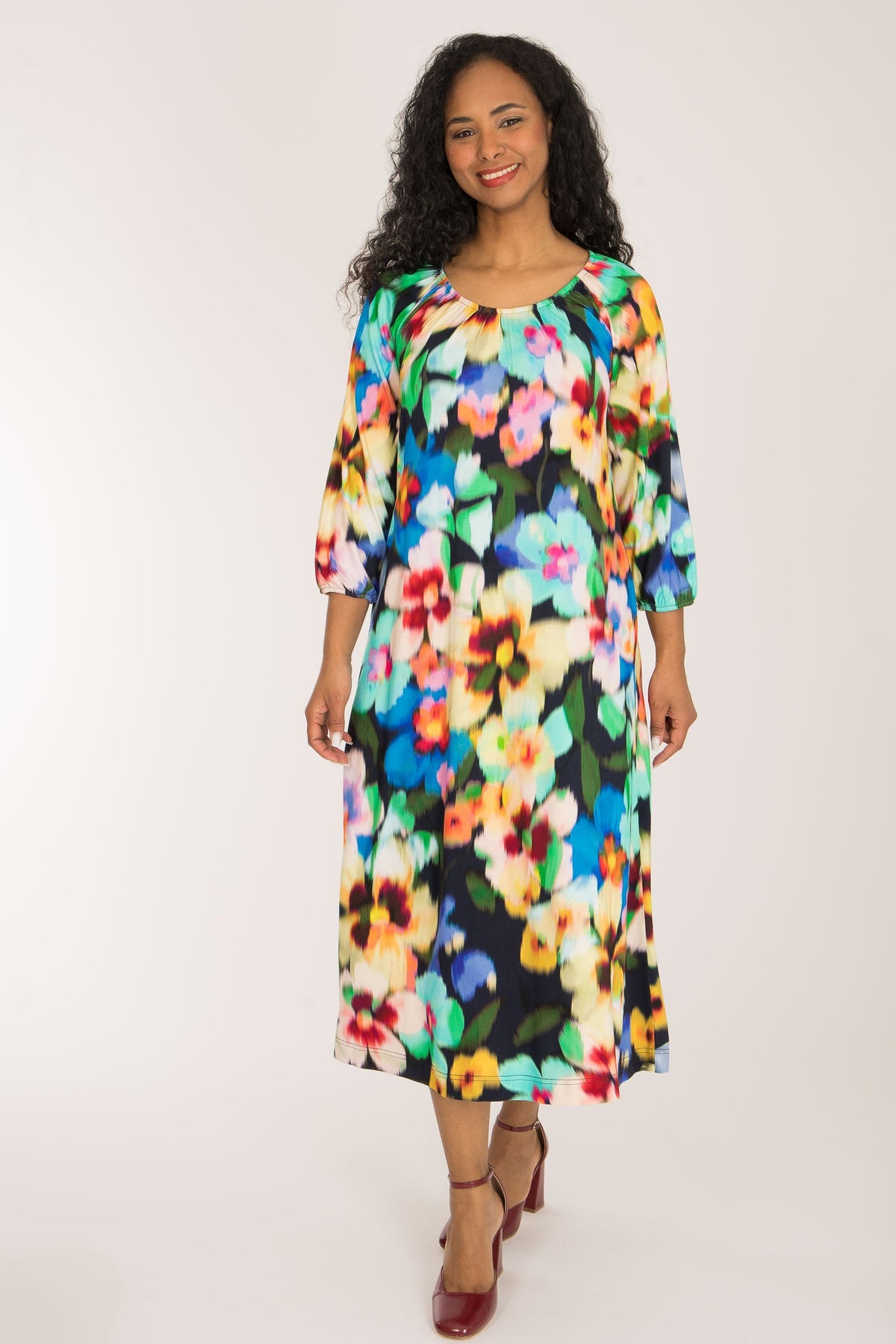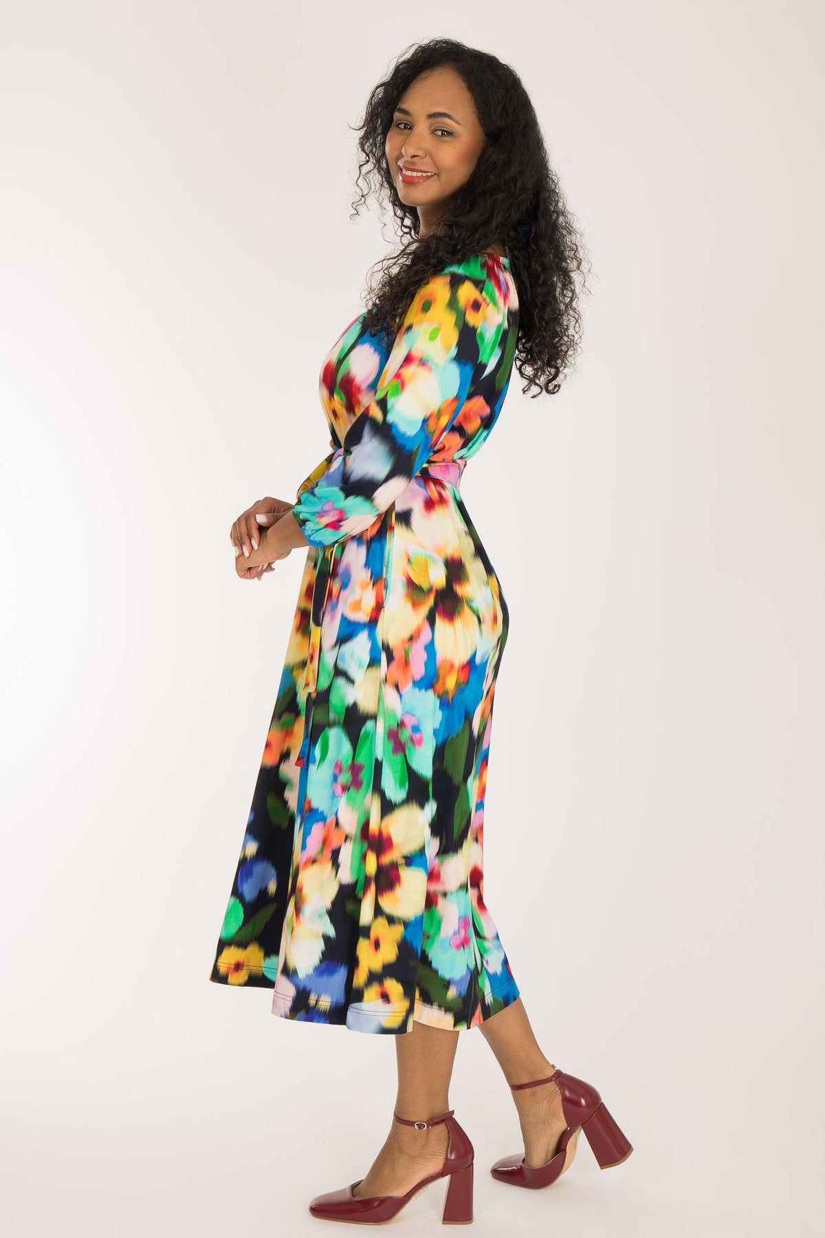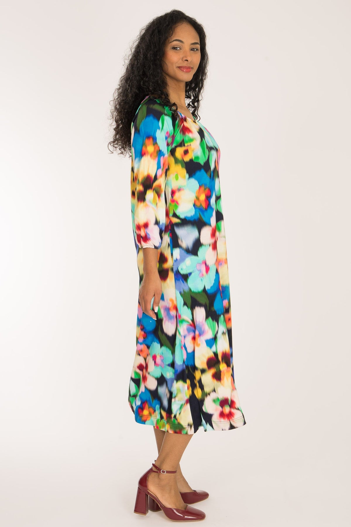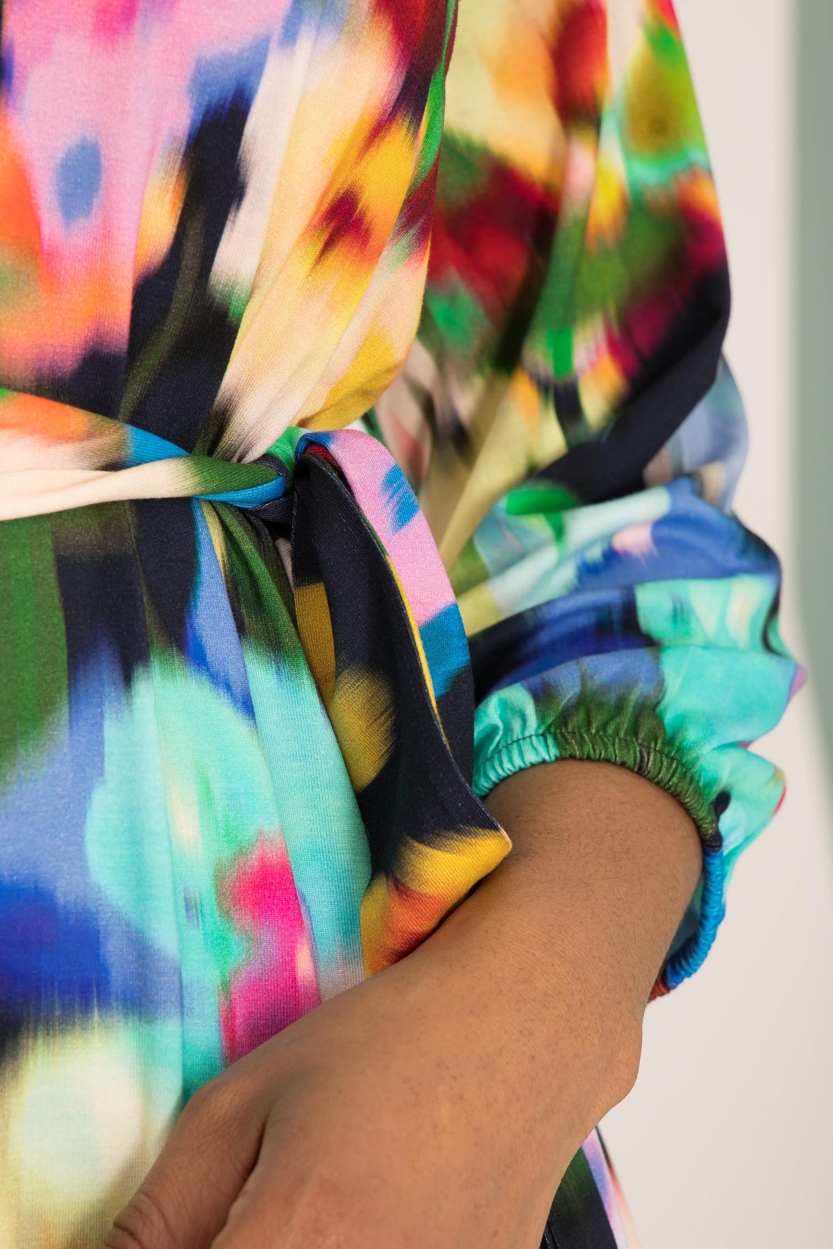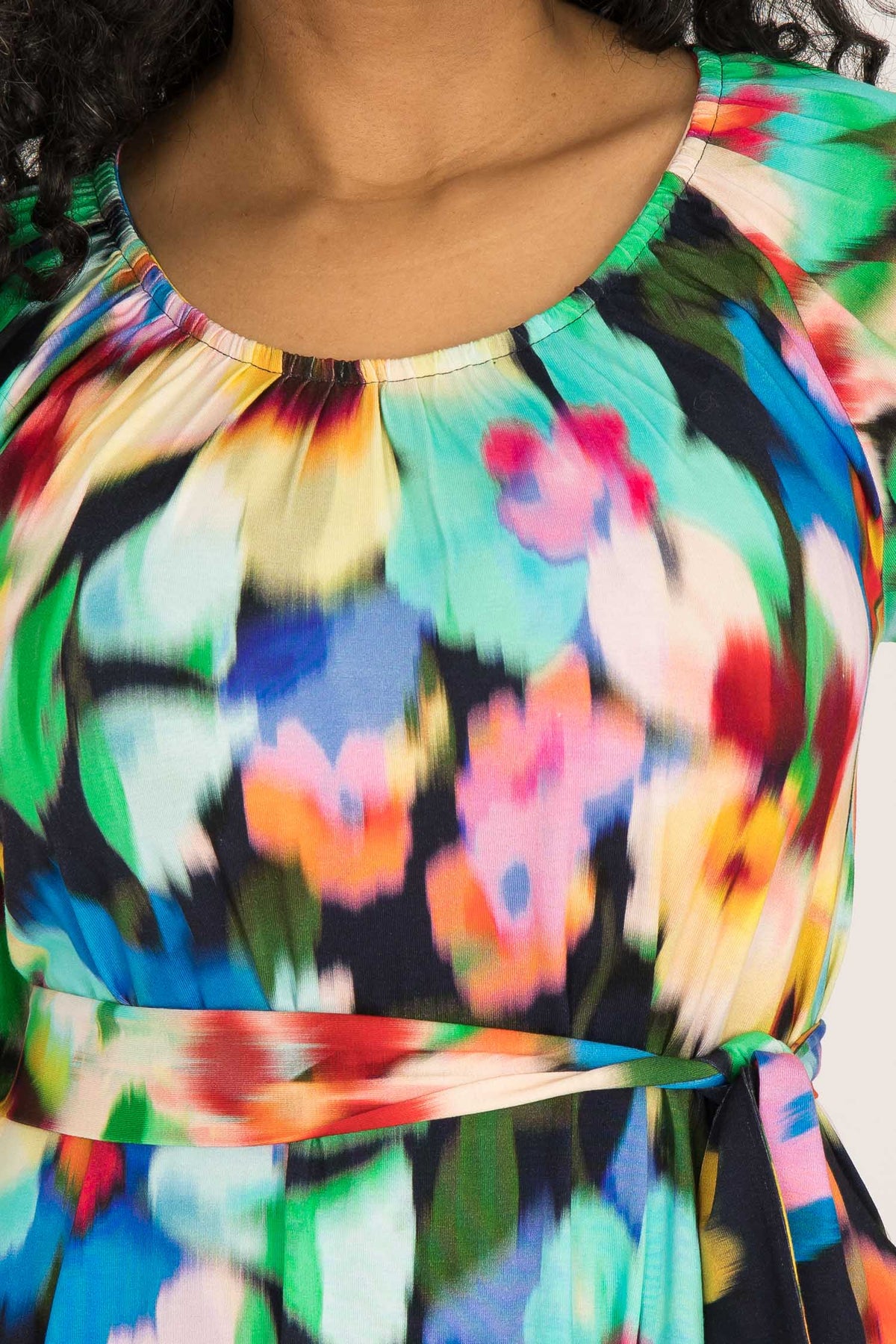 Låt färgerna tala med vår A-linjeformade klänning, A-lined belted. Den är sydd i mjuk och stretchig trikå med ett vackert tungt fall och har ett blurred florals-mönster i klara nyanser mot en mörkblå botten. En perfekt mix av livfull elegans och avslappnad komfort.