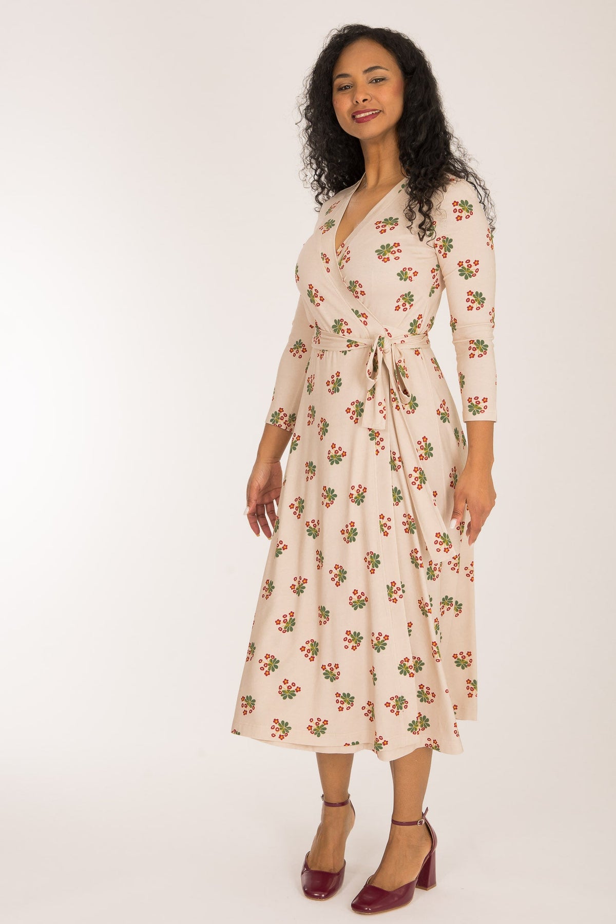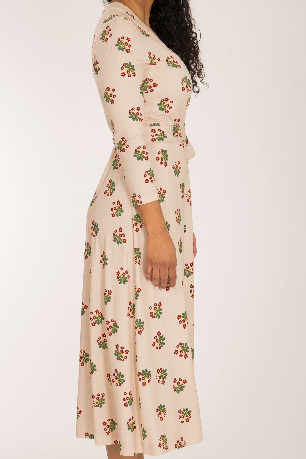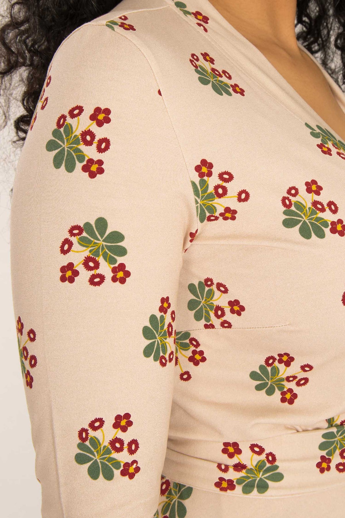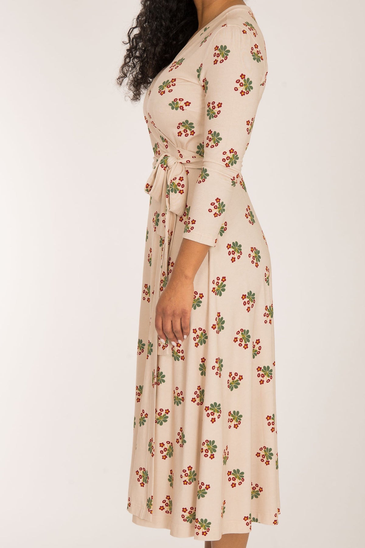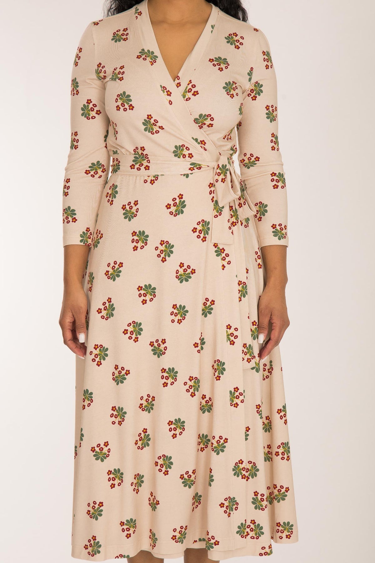 Tyget på denna omlottklänning har en beige botten med ett vackert blommönster i mörkt rött och grönt. Den har generöst med tyg och omlottar mycket runt kroppen och sluter fint vid nacken. Kjolen är rundskuren med härlig vidd och ett vackert fall.