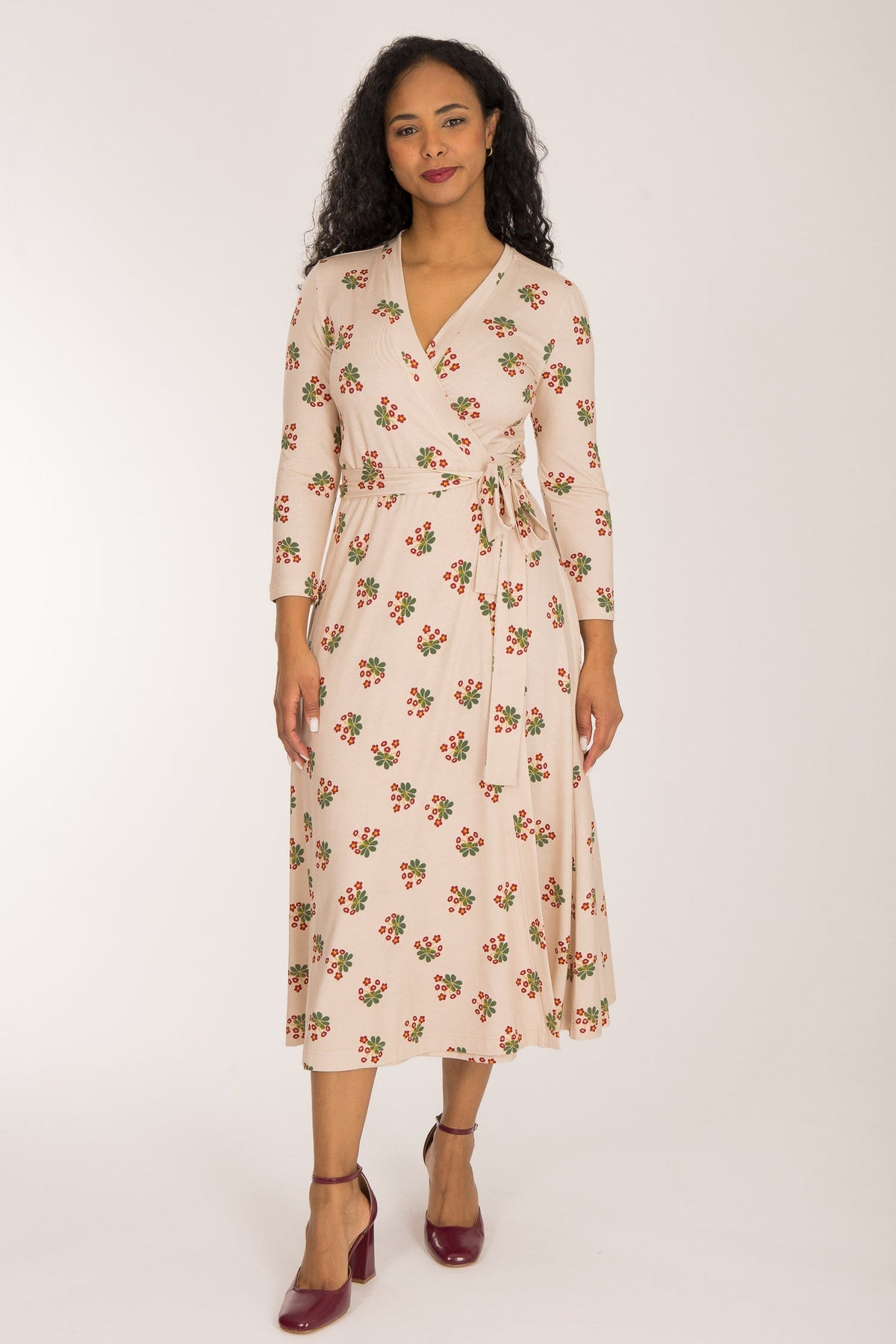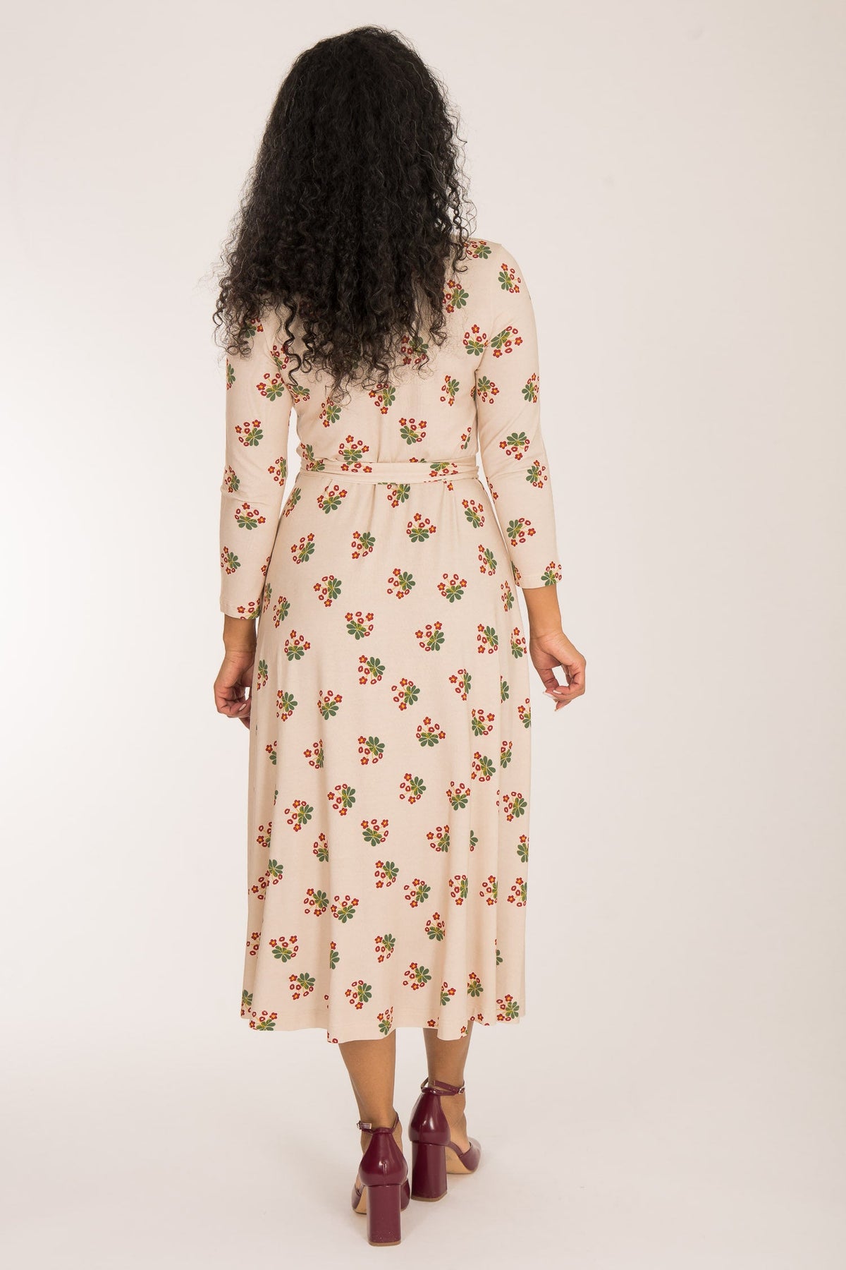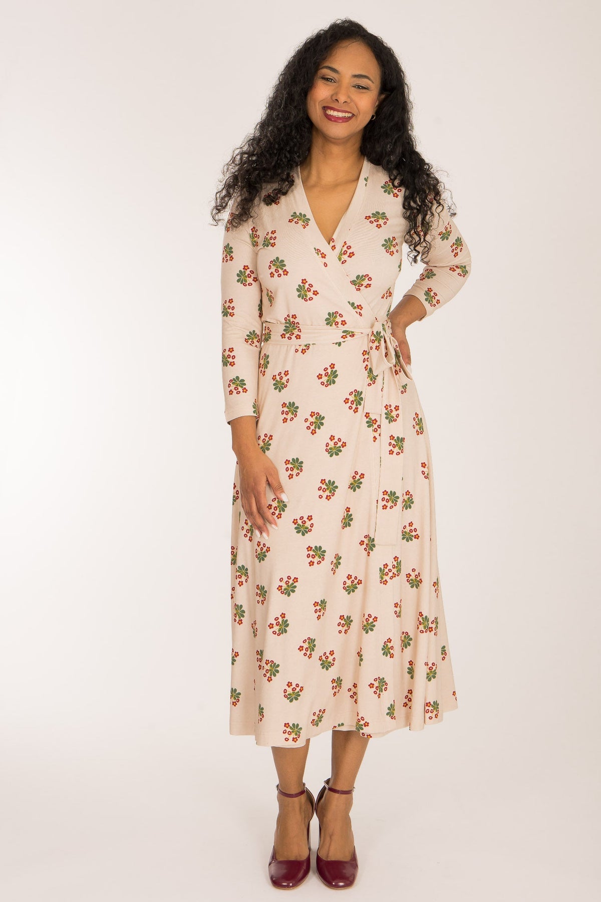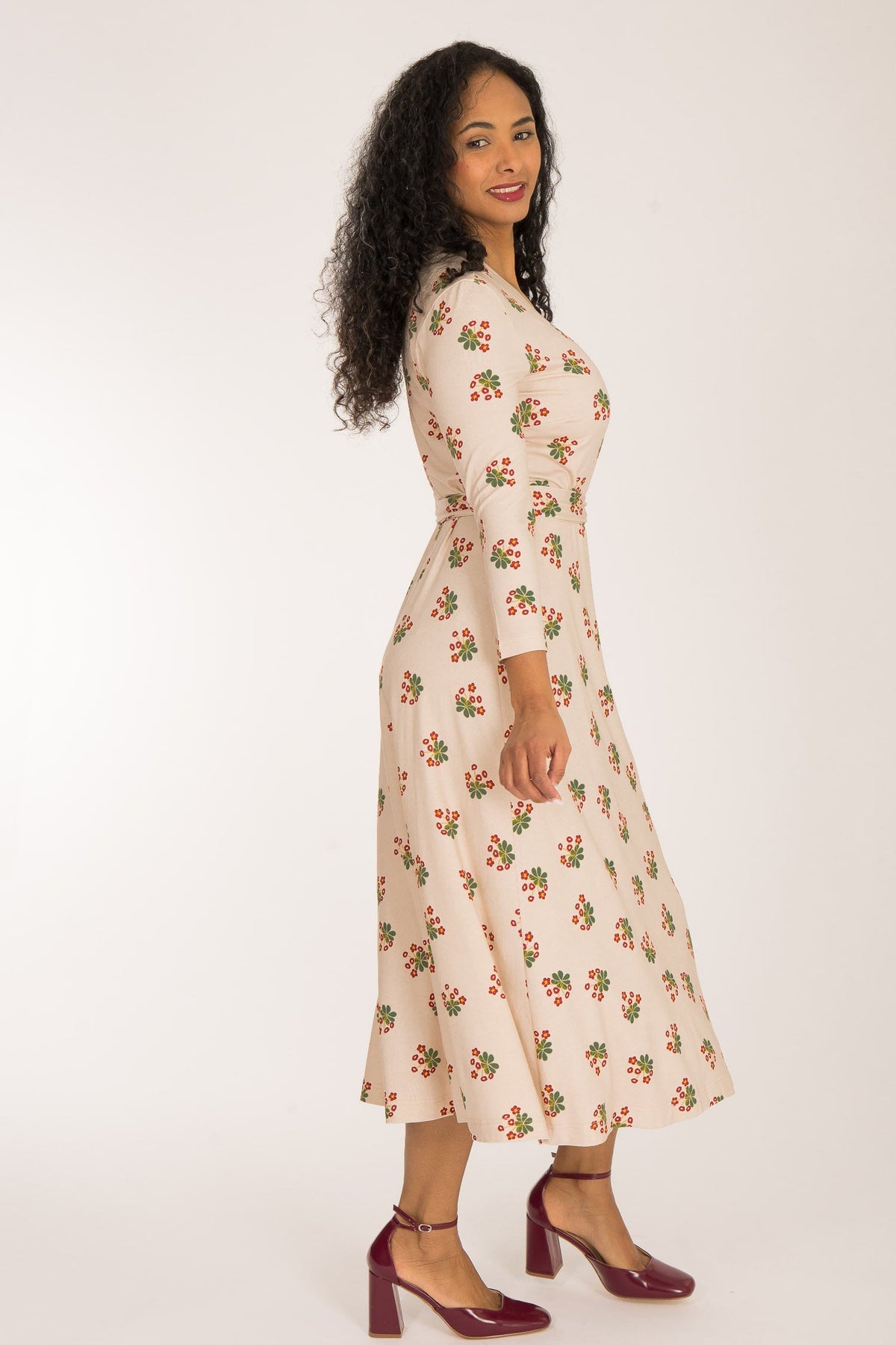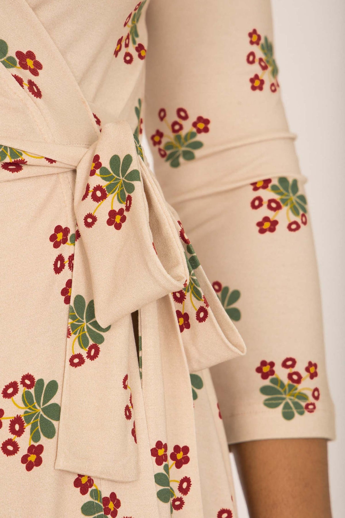 Tyget på denna omlottklänning har en beige botten med ett vackert blommönster i mörkt rött och grönt. Den har generöst med tyg och omlottar mycket runt kroppen och sluter fint vid nacken. Kjolen är rundskuren med härlig vidd och ett vackert fall.
