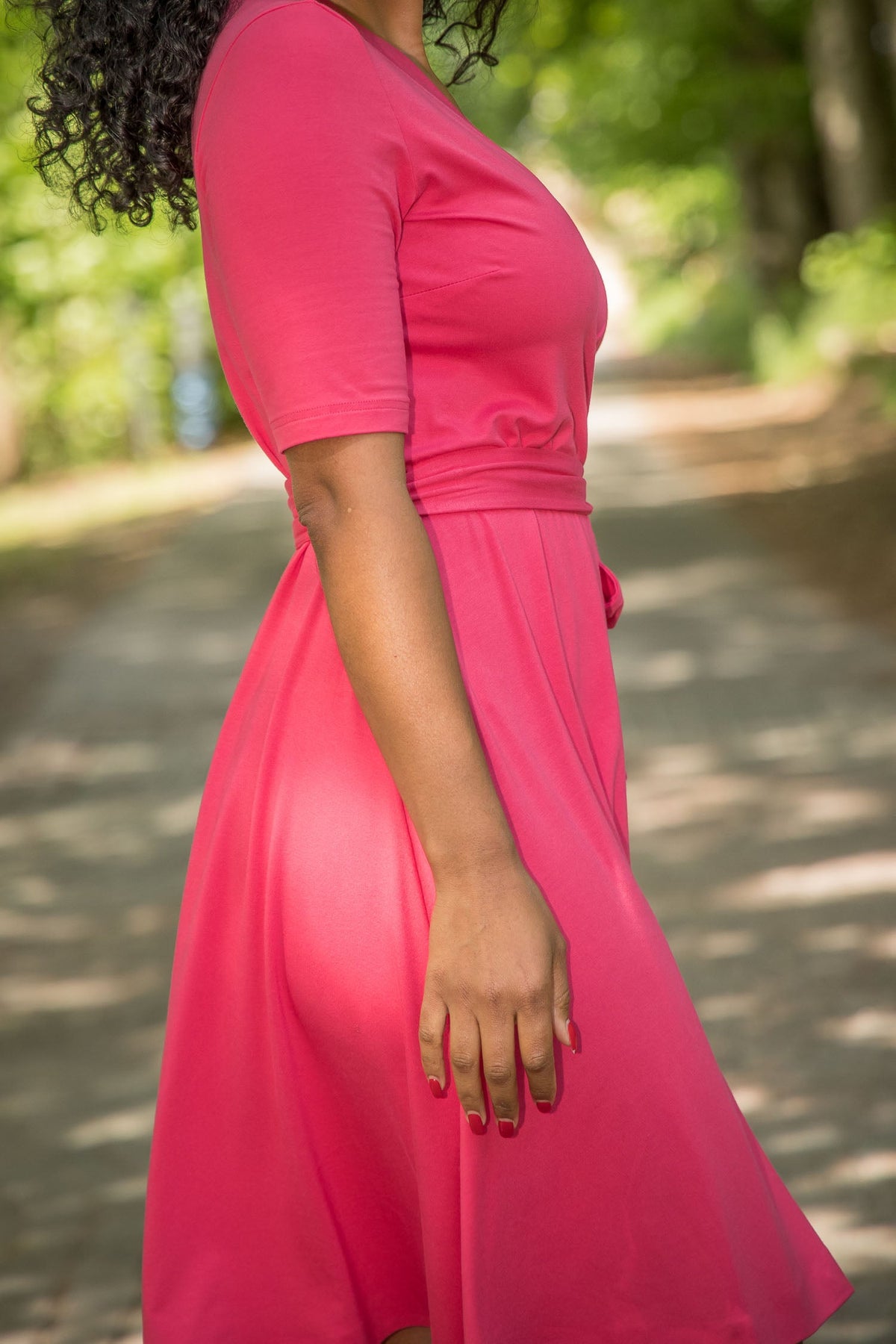 Omlottklänningar har en särskild plats i våra hjärtan, då de kombinerar smickrande siluetter med överlägsen komfort. Här är vår knälånga modell, sydd i stretchig trikå med knyt i midjan och vidd i kjolen. Bestie wrap dress återkommer i vår kollektion och är en av våra mest omtyckta klänningar.