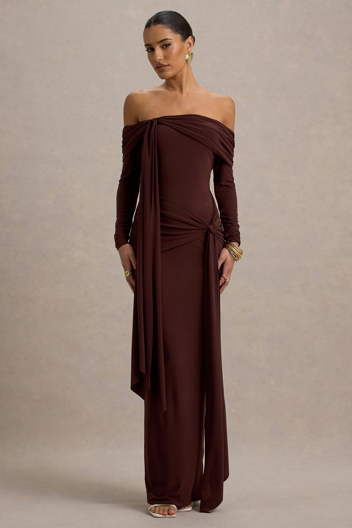 • Long sleeve, off shoulder, knotted, jersey, solid color, black, maxi dress